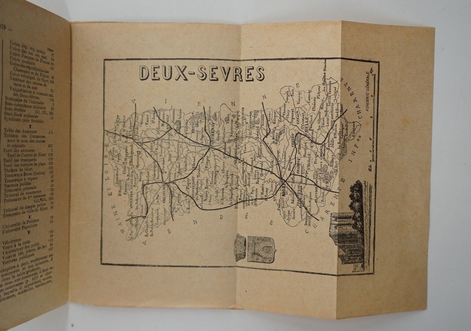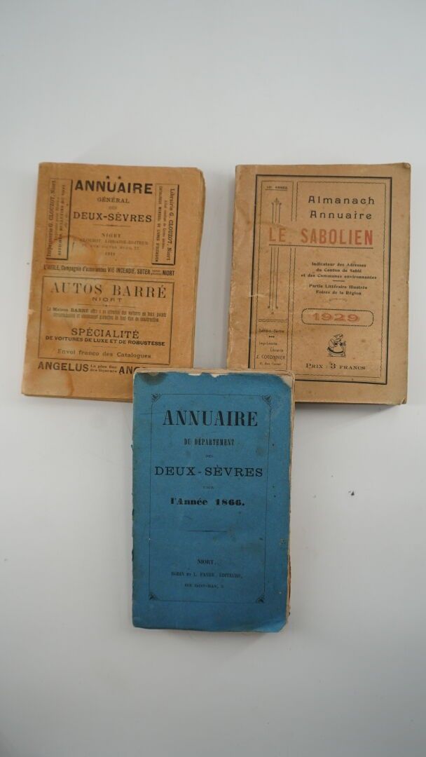 Set of 3 paperback directories - [SARTHE] - [COLLECTIF] - Almanach-Annuaire Le Sabolien 1929 - Sablé-sur-Sarthe ; Imprimerie-Librairie E. Coconnier, 1929 - 1 volume In-12° paperback with printed cover - [DEUX-SÈVRES] - [COLLECTIF] - Annuaire du département des Deux-Sèvres pour l'année 1866 - Niort ; Robin et L. Favre, [1866] - [COLLECTIF] - Annuaire administratif, judicaire, religieux, militaire, commercial et industriel des Deux-Sèvres pour l'année 1911 - Niort ; G. Clouzot, 1911 - 1 folding map in fine - Good copies.