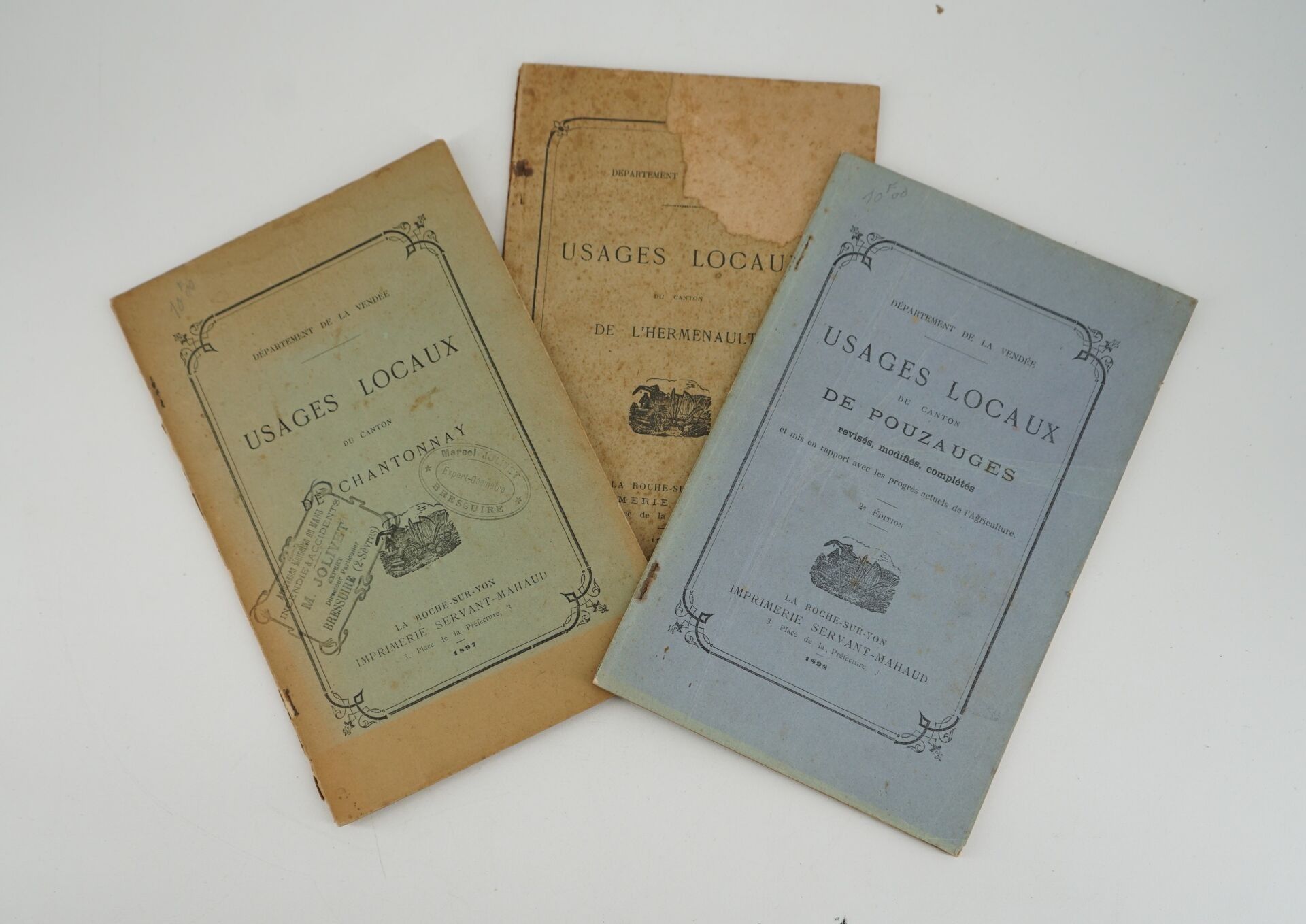 Set of 3 stapled In-8° booklets - Usages locaux du canton de Pouzauges - La Roche-sur-Yon ; Imprimerie Servant-Mahaud, 1898 - Usages locaux du canton de Chantonnay - La Roche-sur-Yon ; Imprimerie Servant-Mahaud, 1897 - Usages locaux du canton de L'Hermennault - La Roche-sur-Yon ; Imprimerie Grillard, 1934 - Cover scorched and missing from 1st cover.