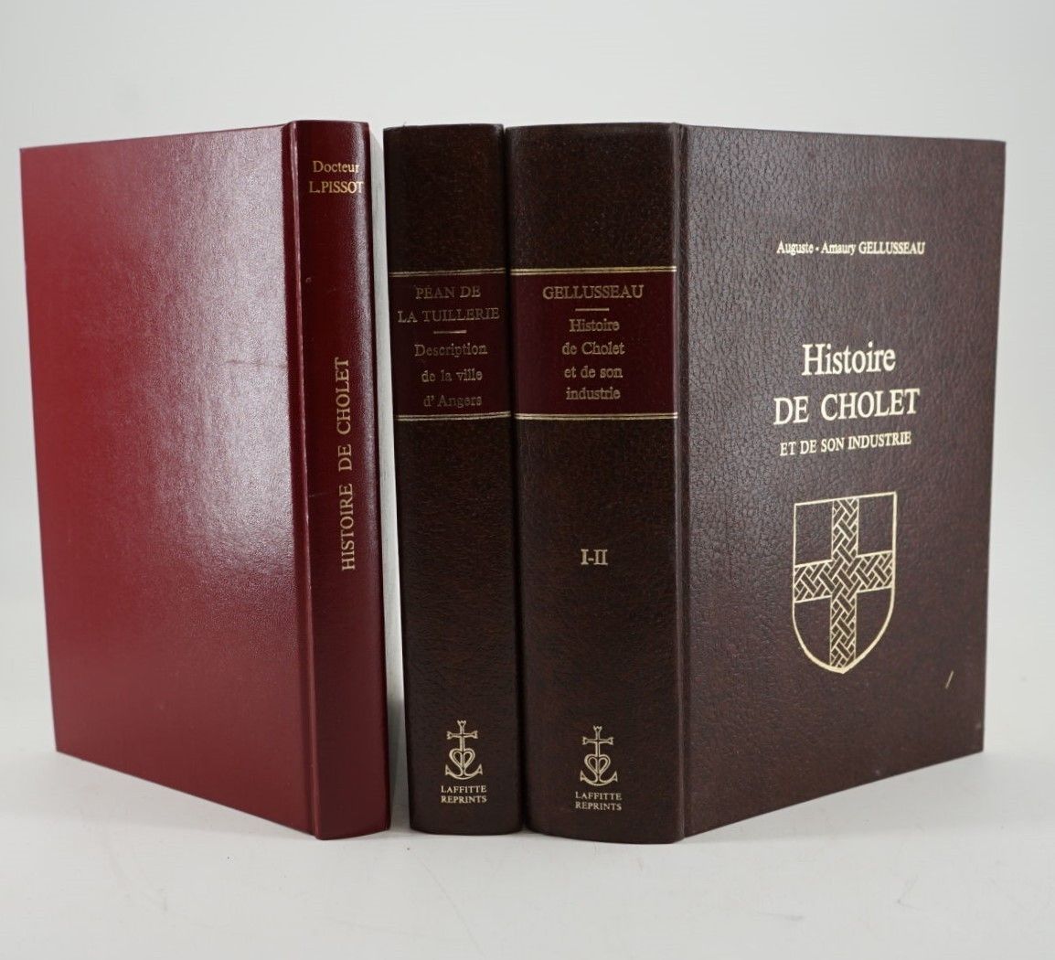 Set of 3 In-8° volumes - PISSOT (Docteur Léon) - Histoire de Cholet - Sans lieu ; Les Éditions du Choletais, 1981 (reprint of the 1883 edition numbered and printed at 1000) - GELLUSSEAU (Auguste-Amaury) - Histoire de Cholet et de son industrie - Marseille ; Laffitte Reprints, 1976 (reprint of the 1862 edition numbered 300) - 2 volumes in 1 volume - PÉAN DE LA TUILLERIE - Description de la ville d'Angers - Marseille ; Laffitte Reprints, 1977 (reprint of the 1869 edition numbered 500) - Bound in gold titled skyvertex - Good condition.