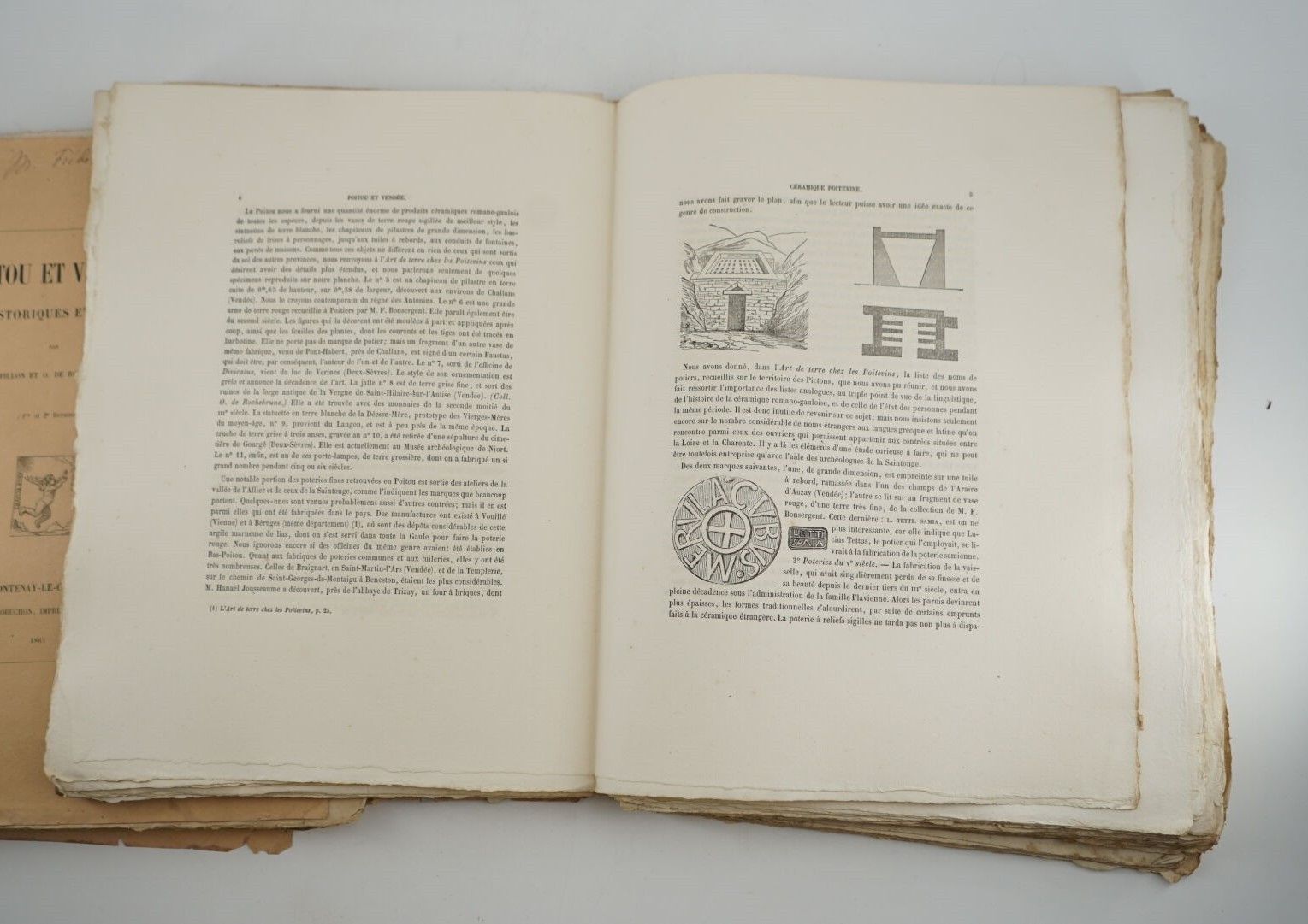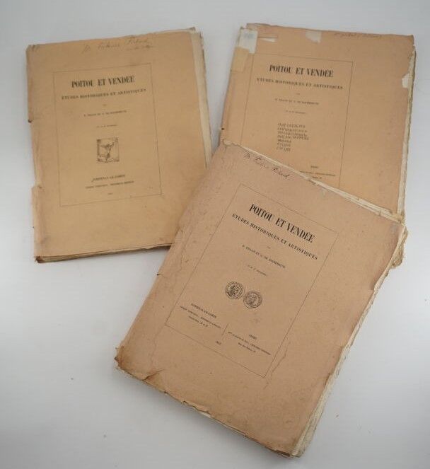 FILLON (Benjamin) & ROCHEBRUNE (Octave de) - Poitou and Vendée. Études historiques et artistiques - Fontenay-le-Comte ; Pierre Robuchon, 1861-1863 - 6 issues in sheets, large In-4°, under 3 publisher's covers (tears in the spines) - Vignettes in text - The sites of Fontenay-le-Comte are dealt with, Raciate et le Pays de Rais, Les Lucs des Pictons, Saint-Michel-en-L'Herm, Angles et Moric, es Moutiers-Les-Maufaits, Nalliers, L'Hermenauld, Jart, Thiré, La Bogisière, Poiroux, Bouillé, Saint-Cyr-en-Talmondais, etc. are covered. - There are also articles on Poitevin ceramics, Pierre de L'Apostolle, a glass painter from Champdenier, weapons and various objects found in the Vendée riverbed, works by Michel Colombe, Poitou glassmakers, the master Jacques Bujeault, a ploughman from Chaloue, etc. - Handwritten ex-libris on the 1st covers: Frédéric Pichard - We have not been able to find 1 collation for this edition also published in Niort by L. Clouzot, in 1887 - Deliveries probably incomplete, particularly the plates by Octave de Rochebrune - Enclosed: the prospectus for the work.