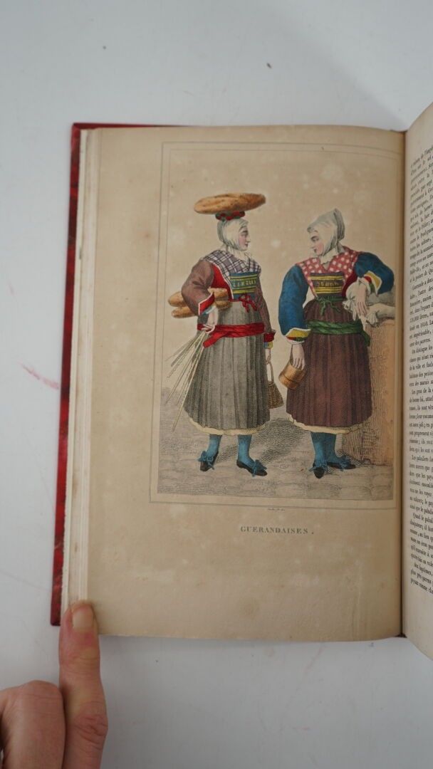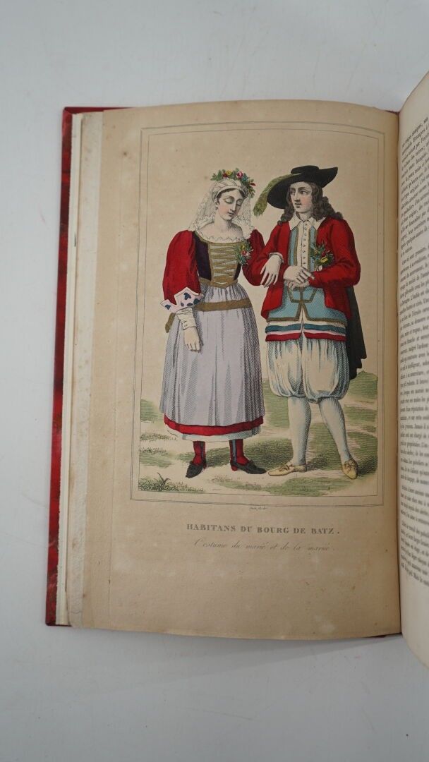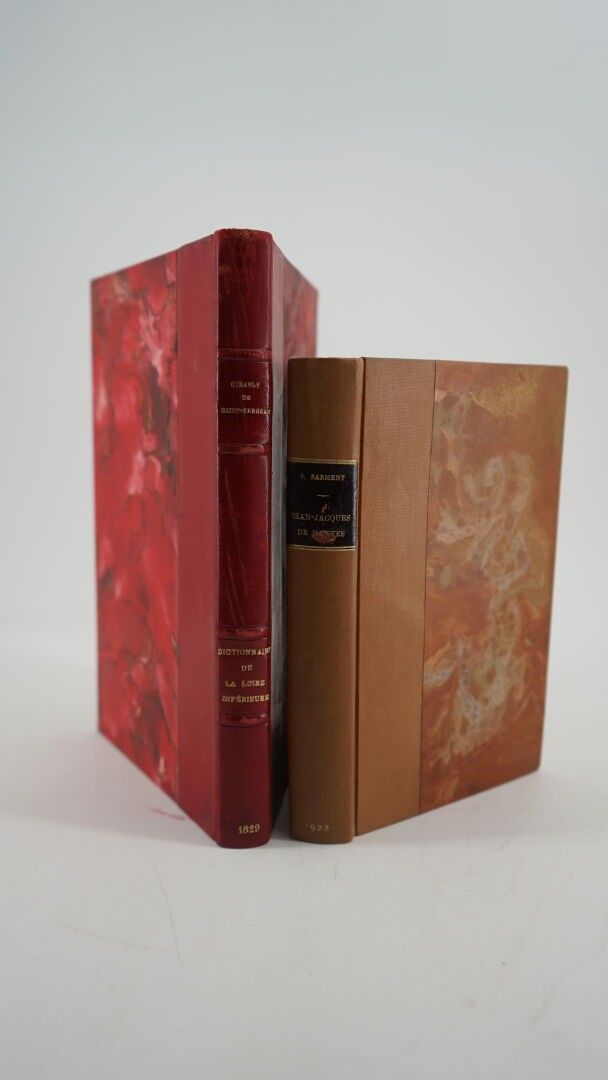 GIRAULT & SAINT-FARGEAU (de) - Histoire nationale et dictionnaire géographique de toutes les communes du département de la Loire-Inférieure - Paris; Baudouin Frères, 1829 - 1 volume In-8° - 7 plates out of text (somewhat faded or yellowed) including 2 plates of costumes (Bourg de Batz and Guérande) coloured at the time - 20th century binding in cherry half calf - Covers preserved - Spine ribbed, titled and dated in gold (upper headband rubbed) - Ex-libris label on 1st plate: A. Villard - Attached: SARMENT (Jean) - Jean Jacques de Nantes - Paris ; Plon Nourrit et Cie, sans date - 1 volume In-12°- Contemporary half tan cloth binding in the Bradel style signed Frans - Spine dated at tail, brown morocco title page (rubbed) - Bookplate identical.