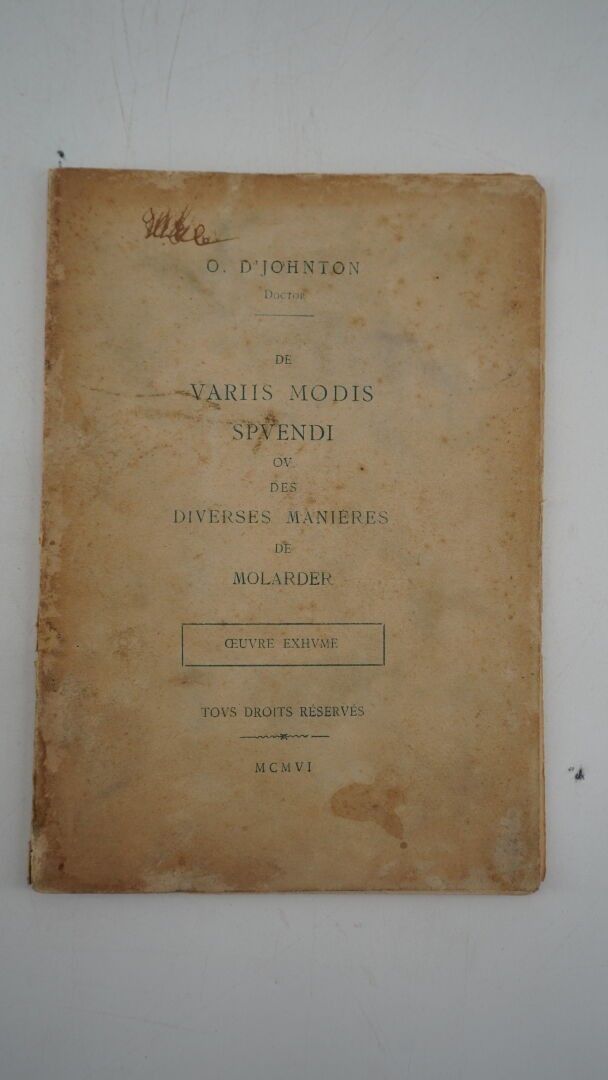 [CURIOSA] - D'JOHNTON (Doctor O.) [Henry Joanneton] - De variis modis spuendi ou des diverses manières de molarder - Sans lieu ; Sans nom, 1906 (Troyes ; Imprimerie Frémont) - 1 volume In-12° paperback (Cover faded and splits at the joins) - Characters in blue ink - 3 plates out of text printed in yellow - Rare and curious little work in first edition.
