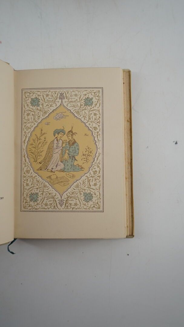 TOUSSAINT(Franz) - Robaiyat by Omar Khayyam. Translated from the Persian - Paris ; L'Édition d'Art H. Piazza, 1940 - 1 volume In-12° - Miniature frontispiece in colour by P. Zenker, text framed by 1 large ornamental blue frieze - Bound in contemporary ivory vellum over boards in slipcase (somewhat soiled and foxed) - Boards decorated with 1 large hand-painted gold and blue frame - Covers (the 1st on a blue background) and spine preserved - Smooth spine titled in gold and black by hand - Gilt head - A good copy.