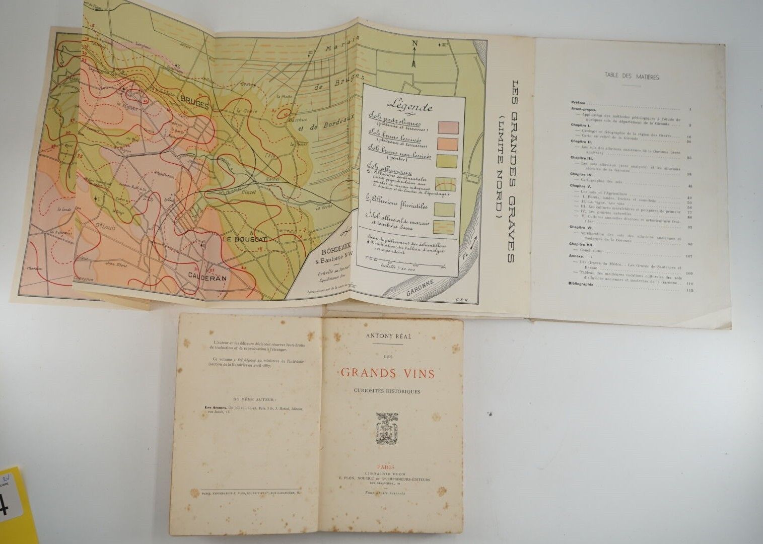 [WINE] - LAFFORGUE (G.) & RIEDEL (C. E.) & FRANC DE FERRIÈRE (J.) - Les Graves de Bordeaux. Relations entre l'évolution pédologique et la vocation culturale - Direction des Services Agricoles de la Gironde, 1936 - 1 volume In-8° broché (plats détachés) - 2 cartes dépliants en couleurs et illustrations in texte en noir - RÉAL (Anthony) - Les grands vins. Curiosités historiques - Paris ; E. Plon, Nourrit et Cie, sans date - 1 volume In-12° paperback (1st cover missing, foxing at beginning and end of work, spine split) - As is.