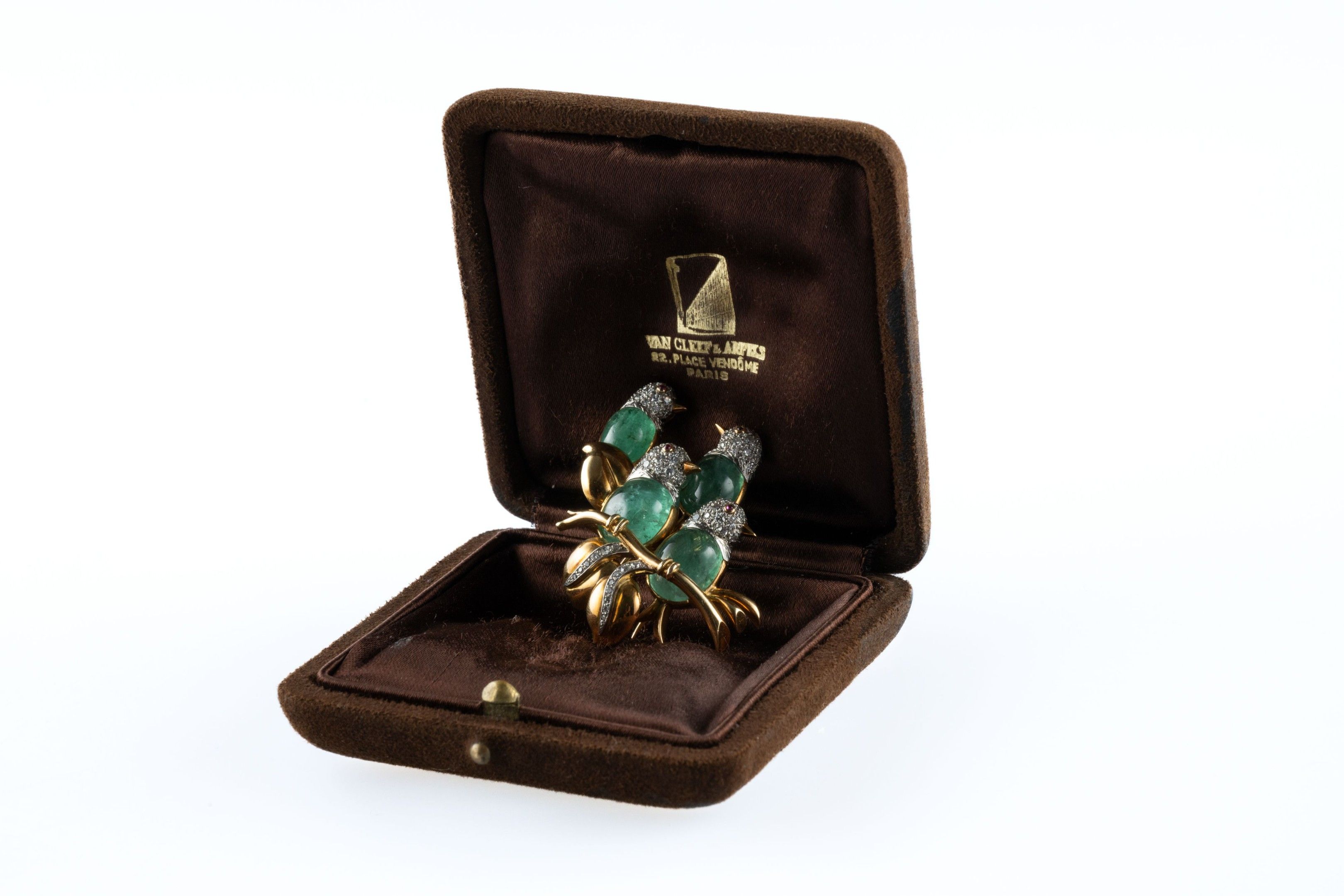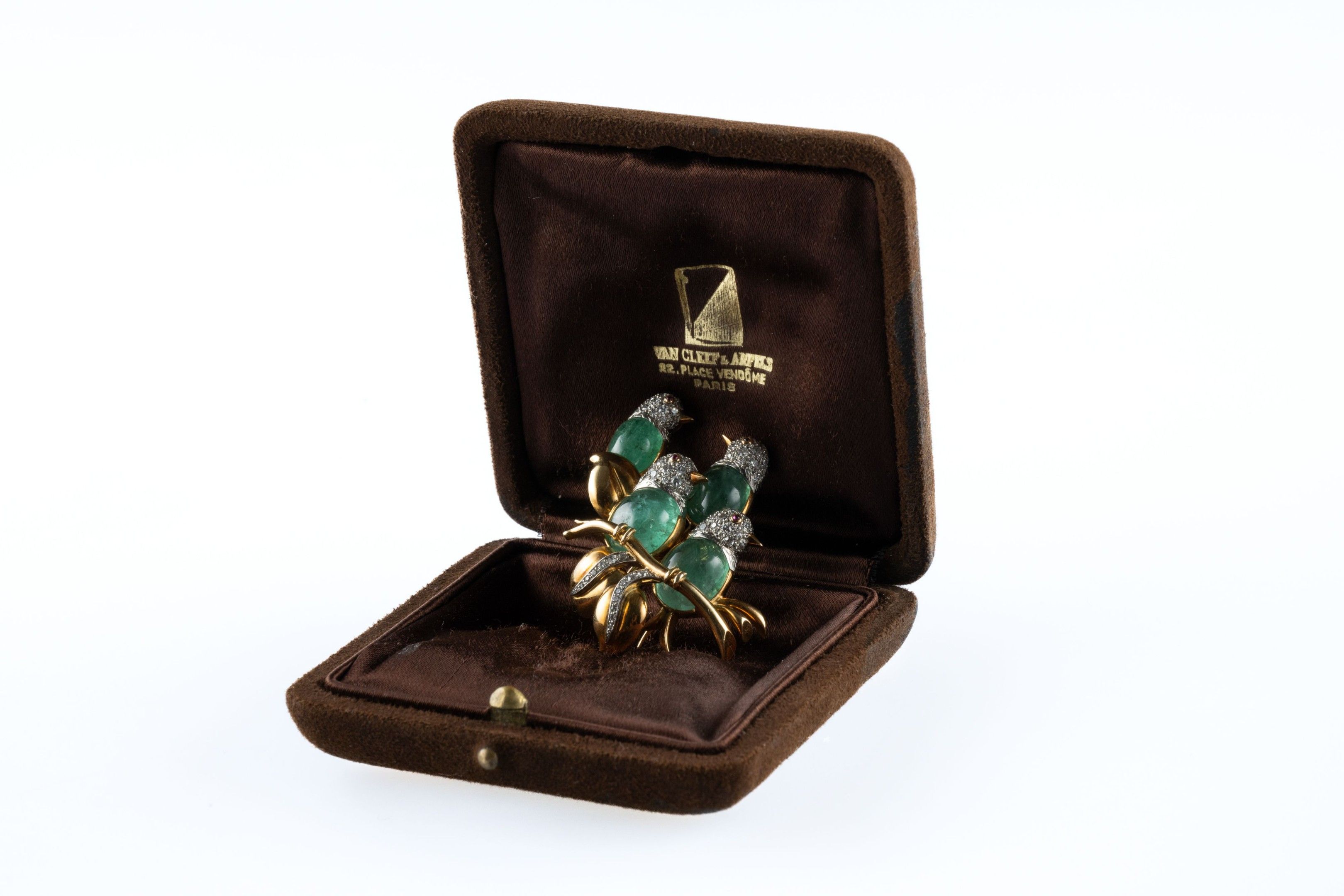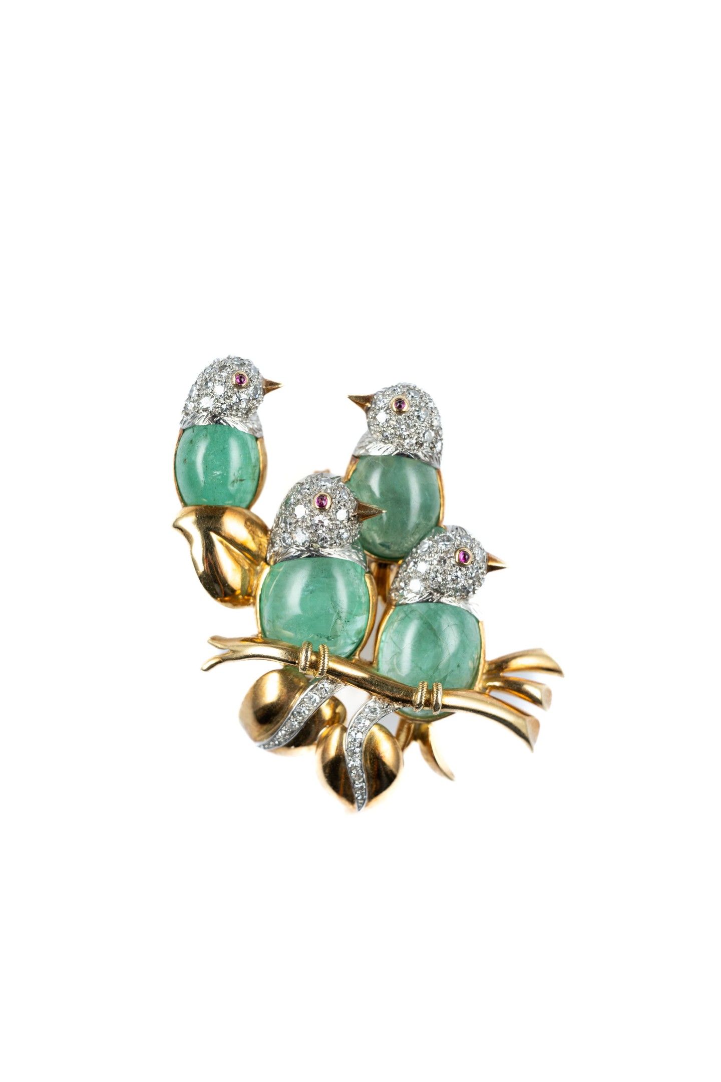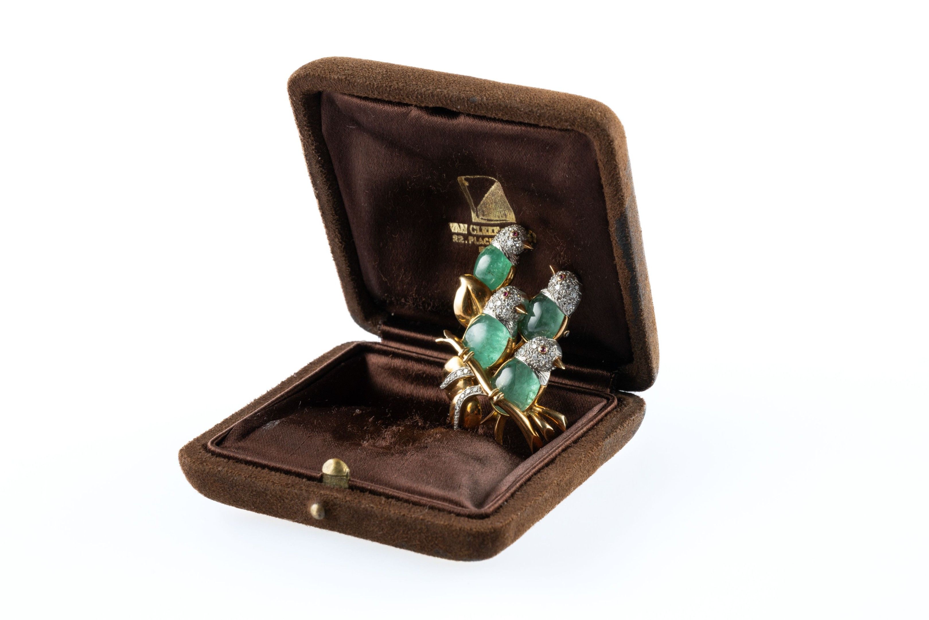 VAN CLEEF & ARPELS. Brooch in 18k (750 thousandths) yellow and white gold depicting a flock of birds, the bodies set with emerald cabochons, the heads paved with diamonds, the eyes adorned with ruby cabochons. They are joined by a branch adorned with leaves, some highlighted with a line of small diamonds. Signed and numbered. Gross weight: 22.5 g (tiny chips) At the end of the Second World War, Van Cleef & Arpels launched a line of bird clips and brooches known as "Les Inséparables" or "Lovebirds". Sometimes a couple, sometimes a family, these birds symbolise love, attachment and peace. This lot has been kept outside the study in a bank safe and is sold by designation.
