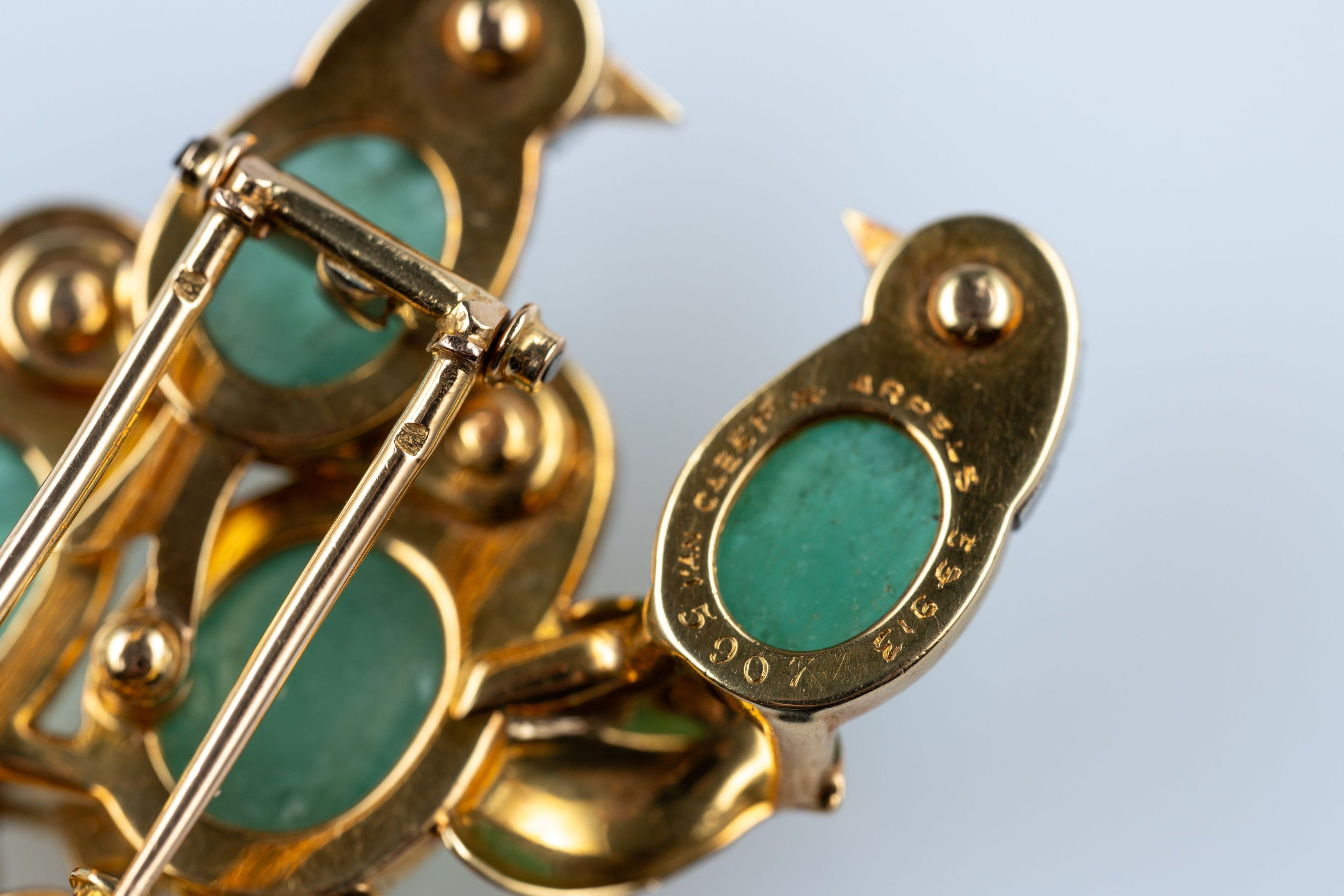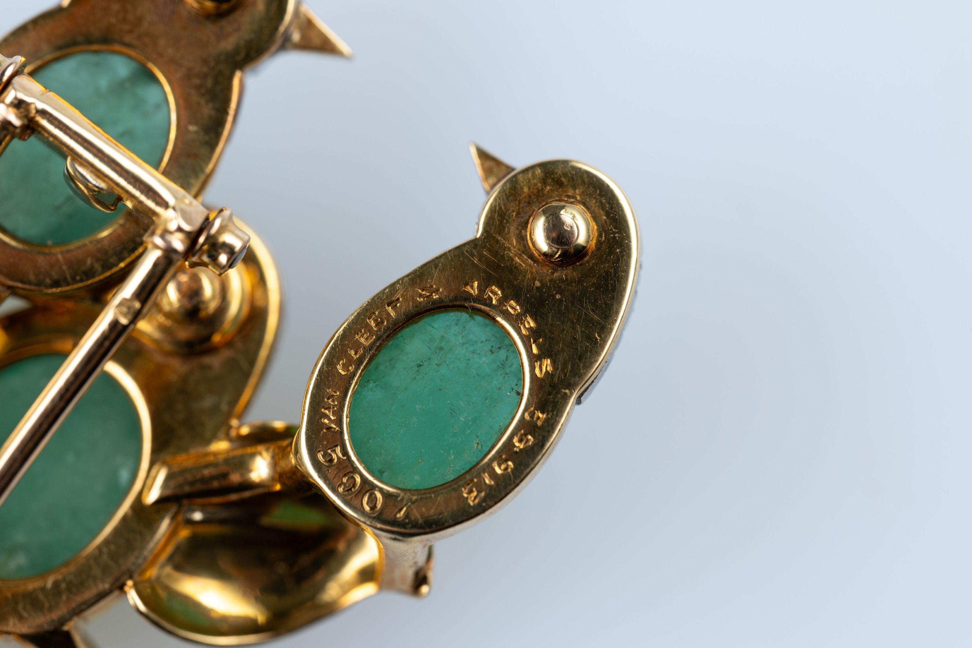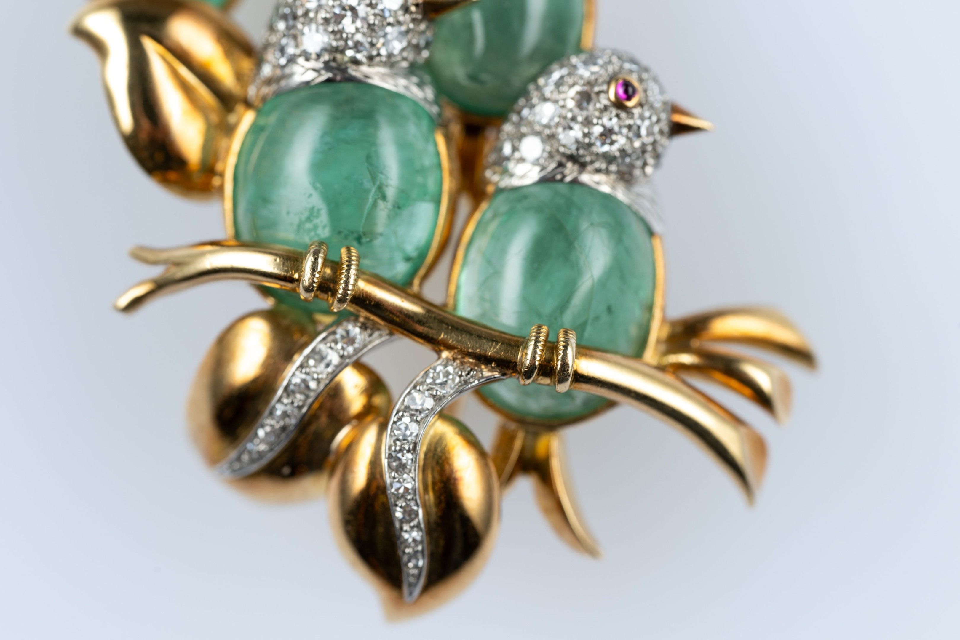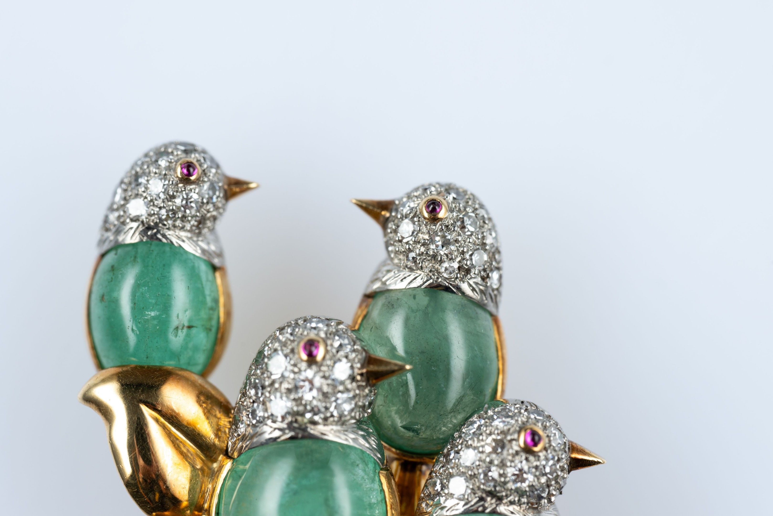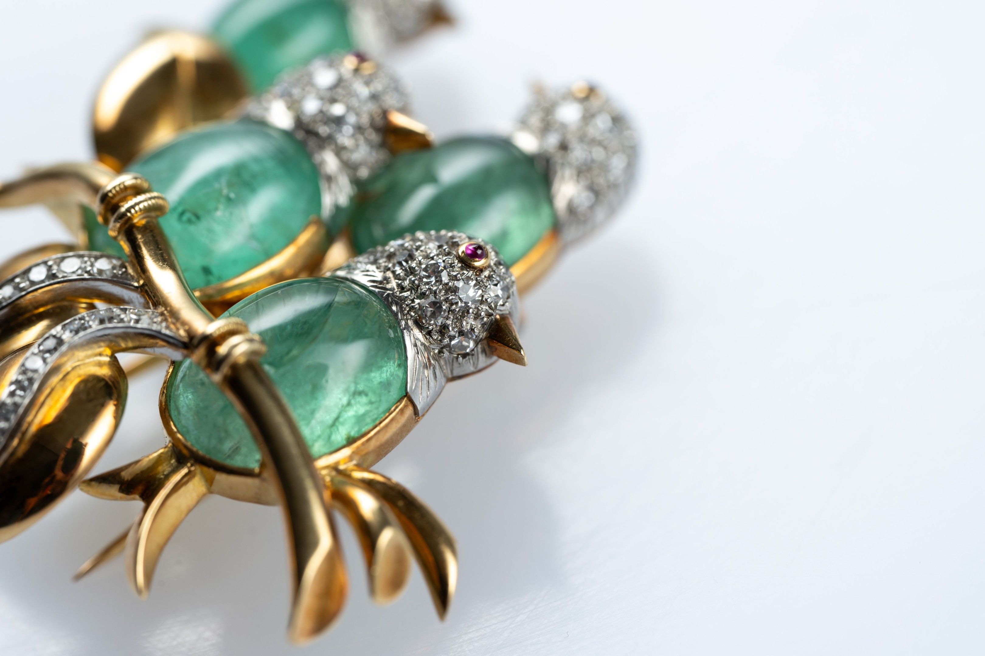 VAN CLEEF & ARPELS. Brooch in 18k (750 thousandths) yellow and white gold depicting a flock of birds, the bodies set with emerald cabochons, the heads paved with diamonds, the eyes adorned with ruby cabochons. They are joined by a branch adorned with leaves, some highlighted with a line of small diamonds. Signed and numbered. Gross weight: 22.5 g (tiny chips) At the end of the Second World War, Van Cleef & Arpels launched a line of bird clips and brooches known as "Les Inséparables" or "Lovebirds". Sometimes a couple, sometimes a family, these birds symbolise love, attachment and peace. This lot has been kept outside the study in a bank safe and is sold by designation.