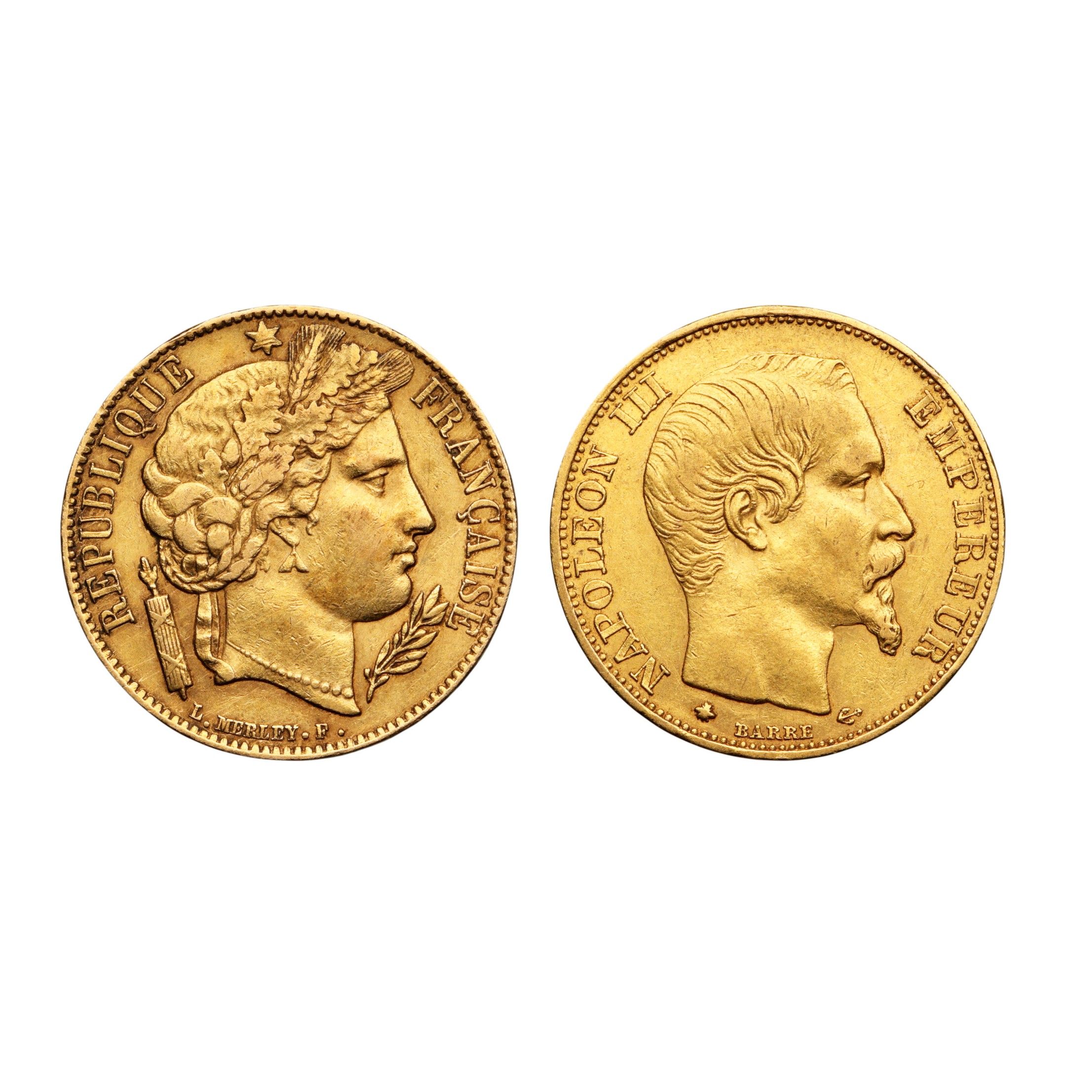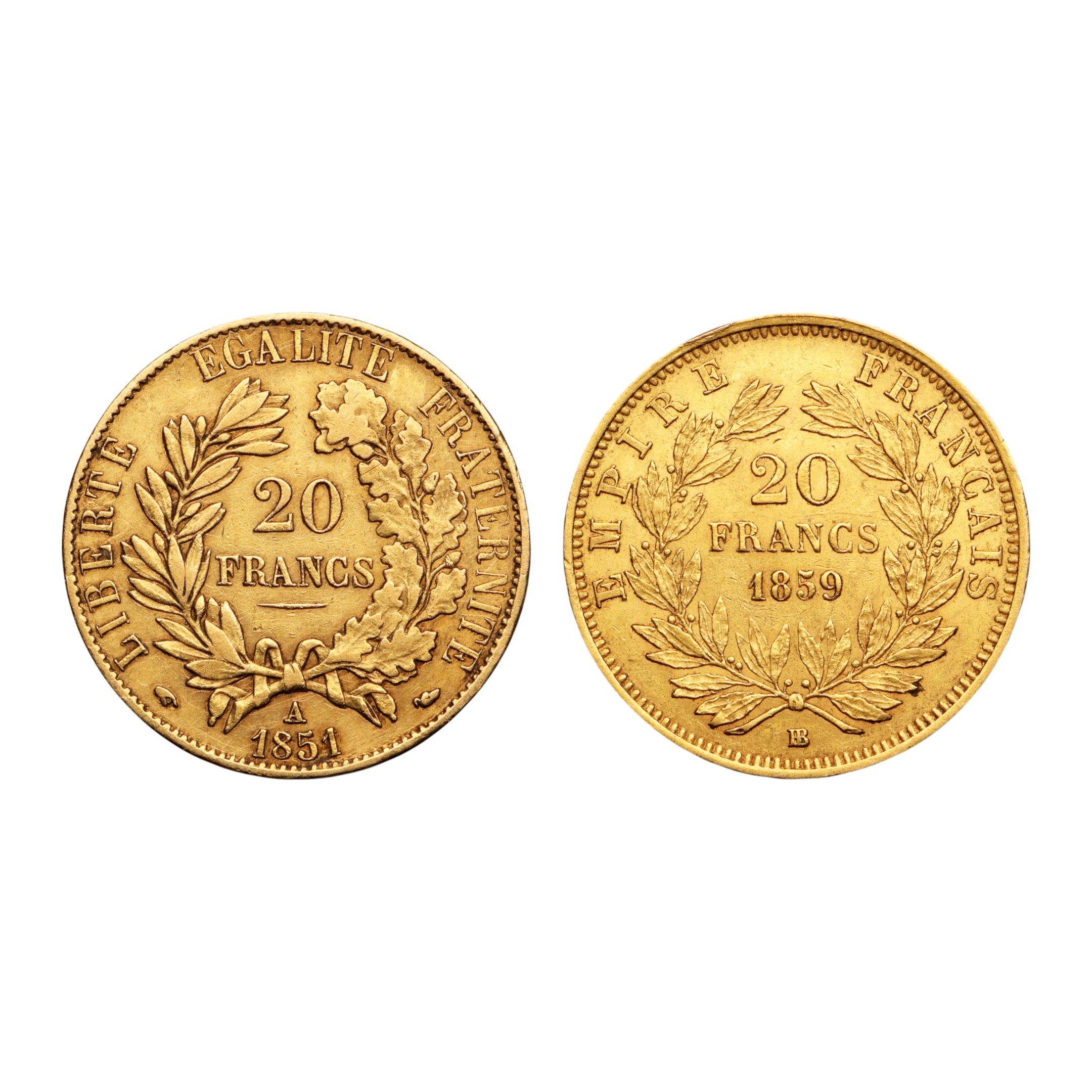 2 x 20 francs gold Napoléon III barehead 1859 and Cérès 1851.