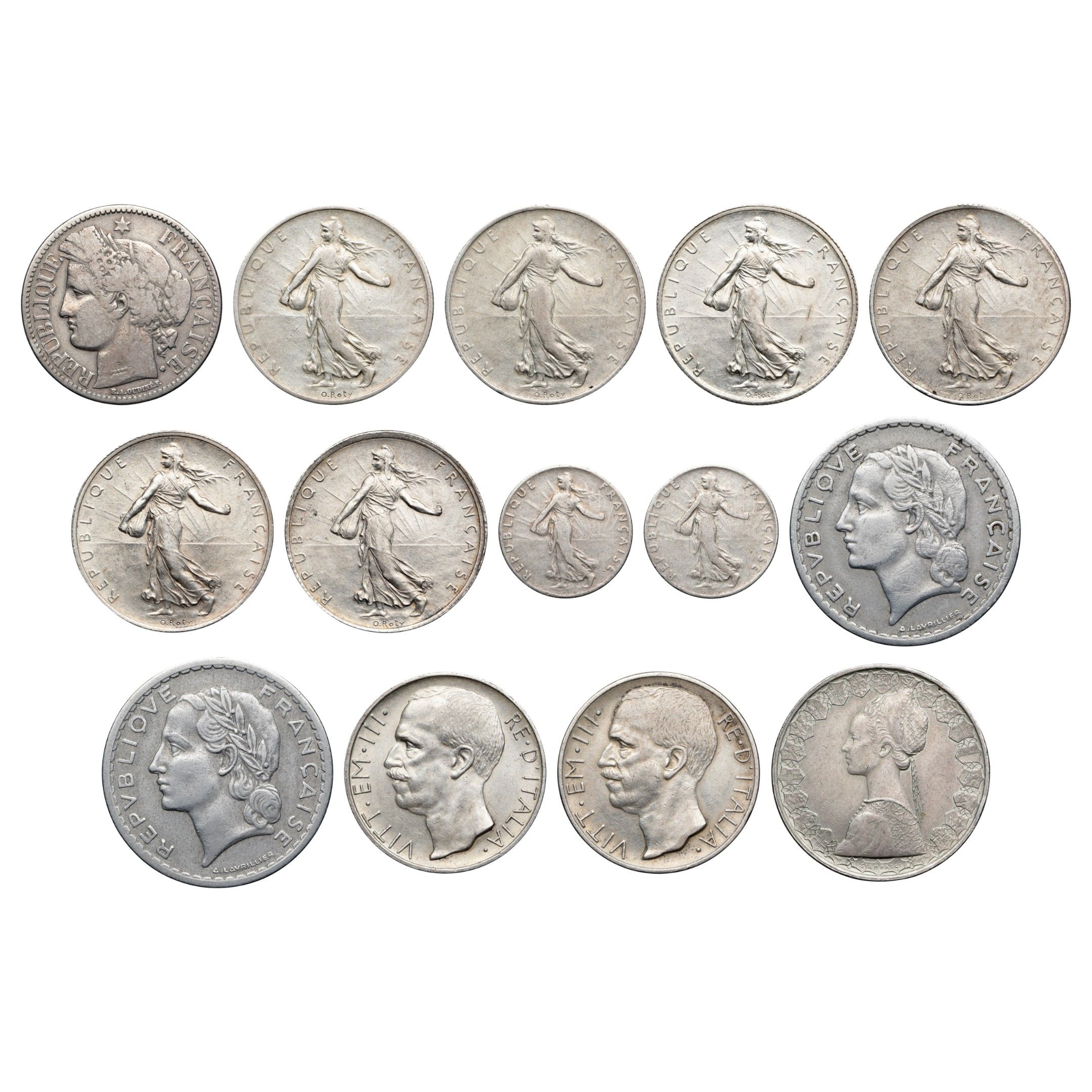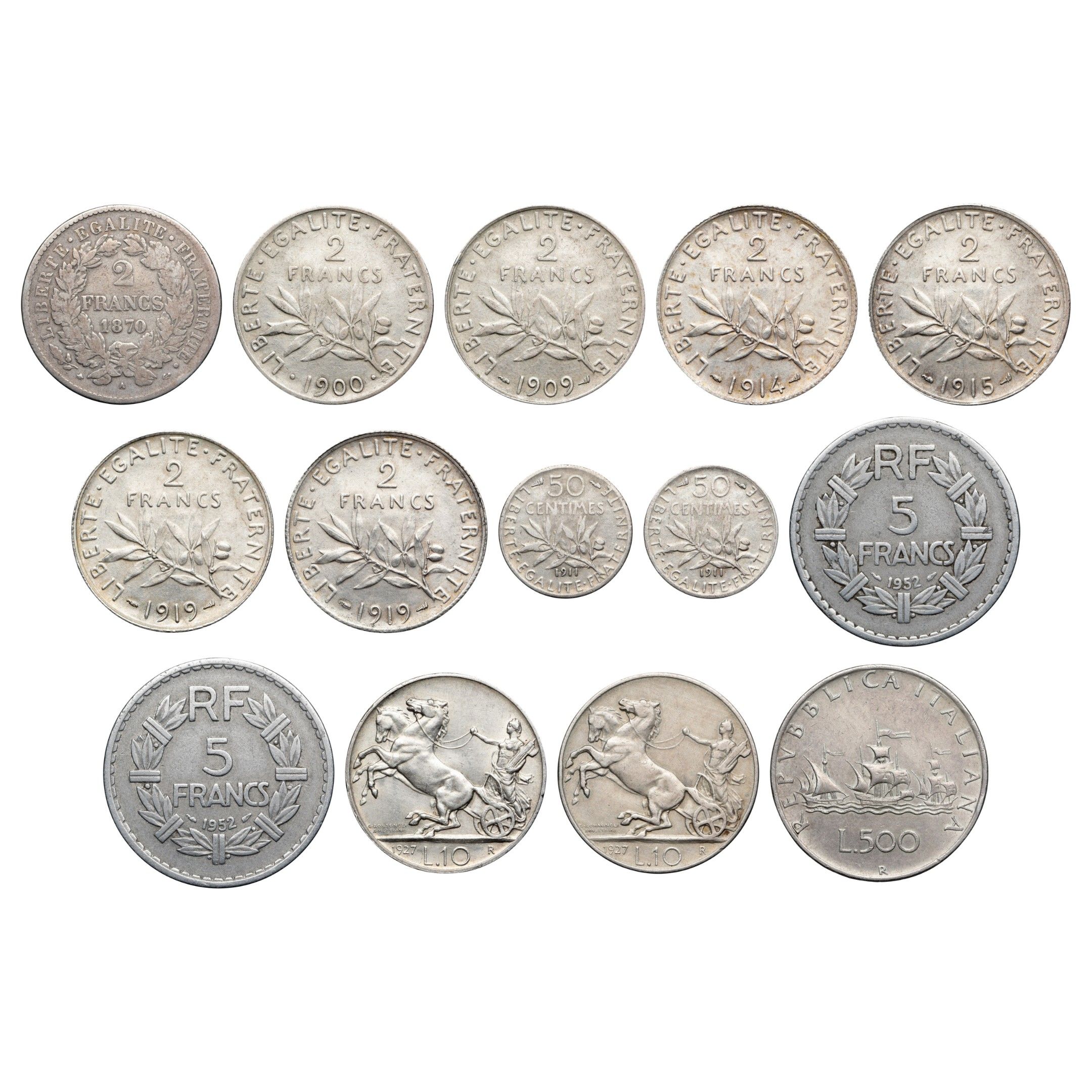 FRANCE Lot of 14 coins : 2 Francs Cérès (1870 A), 2 Francs Semeuse (1900, 1909, 1914, 1915, 1919, 1919), 50 Centimes Semeuse (1911, 1911), 5 Francs Lavrillier (1952, 1952), 10 Lire (1927, 1927), 500 Lire (1959) Lot kept outside the study in a bank safe and sold by designation. Fees reduced to 12% incl. VAT for lots 1 to 35 (Live Interencheres fees for these lots 15.6% incl. VAT)