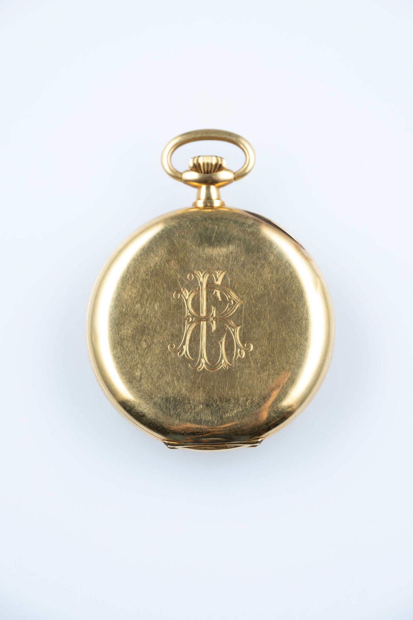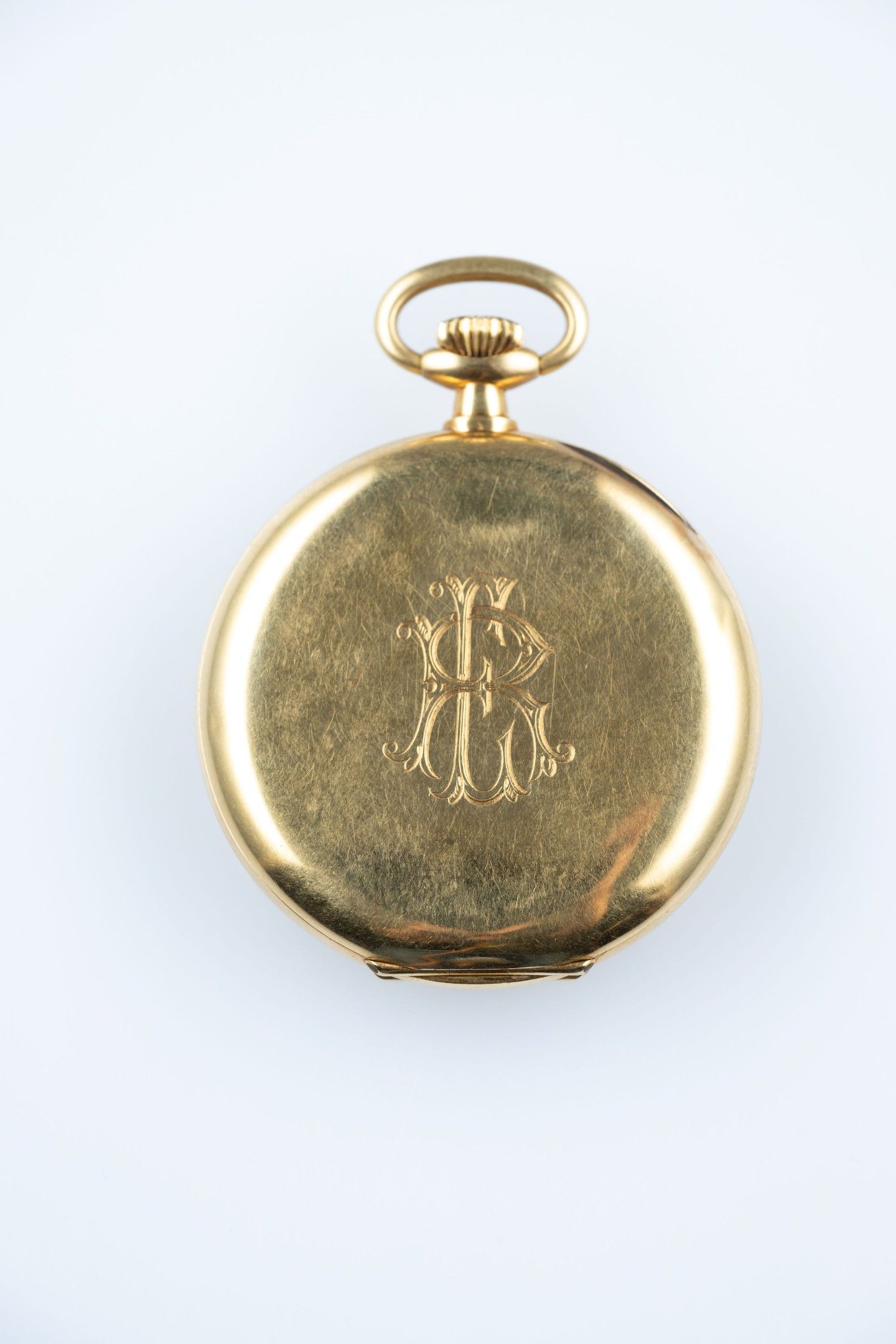 18k (750 thousandths) yellow gold pocket watch, plain monogrammed back, white enamelled dial with Roman numerals, Arabic numerals, railway track and seconds counter at six o'clock. Gold dust cover.