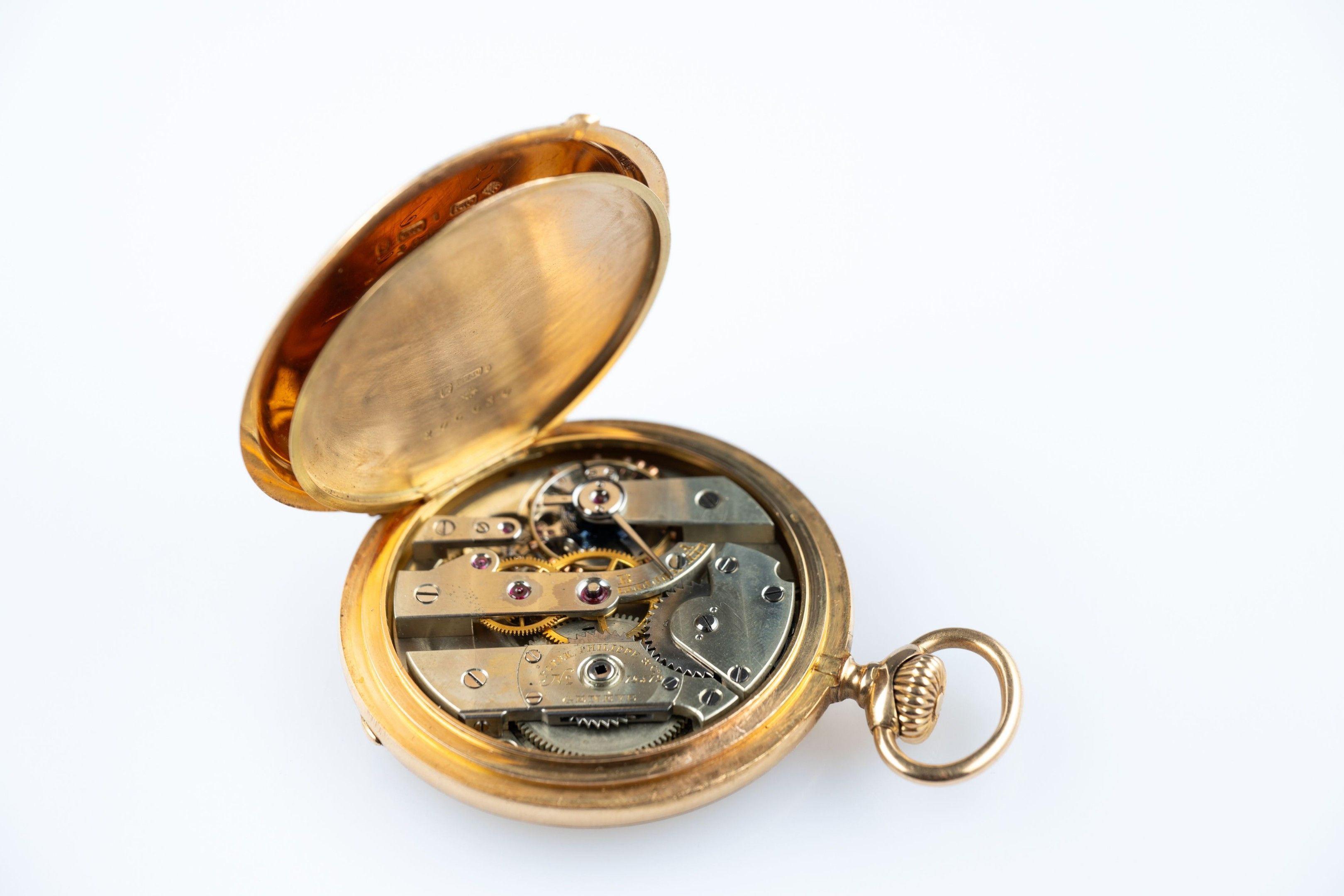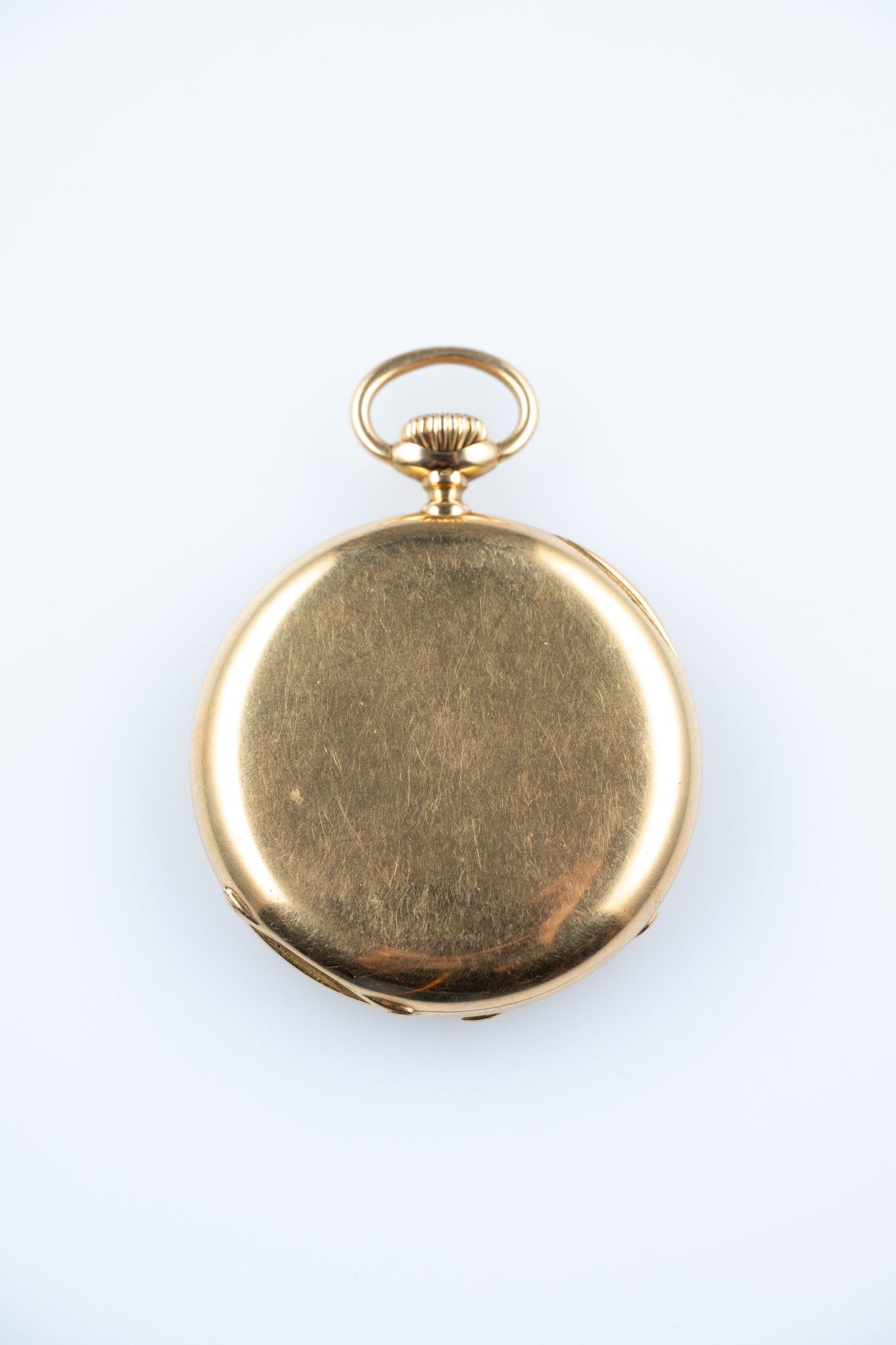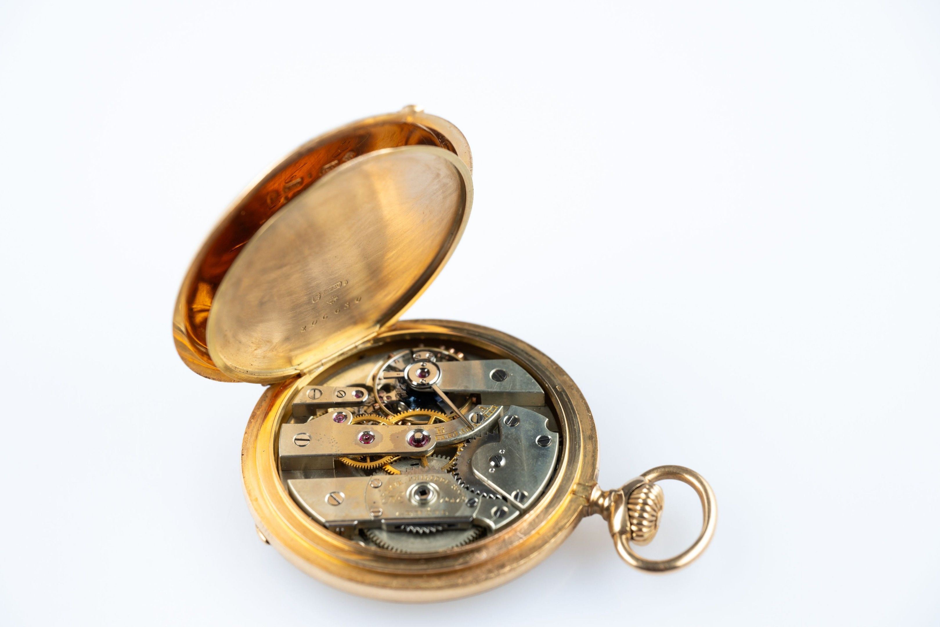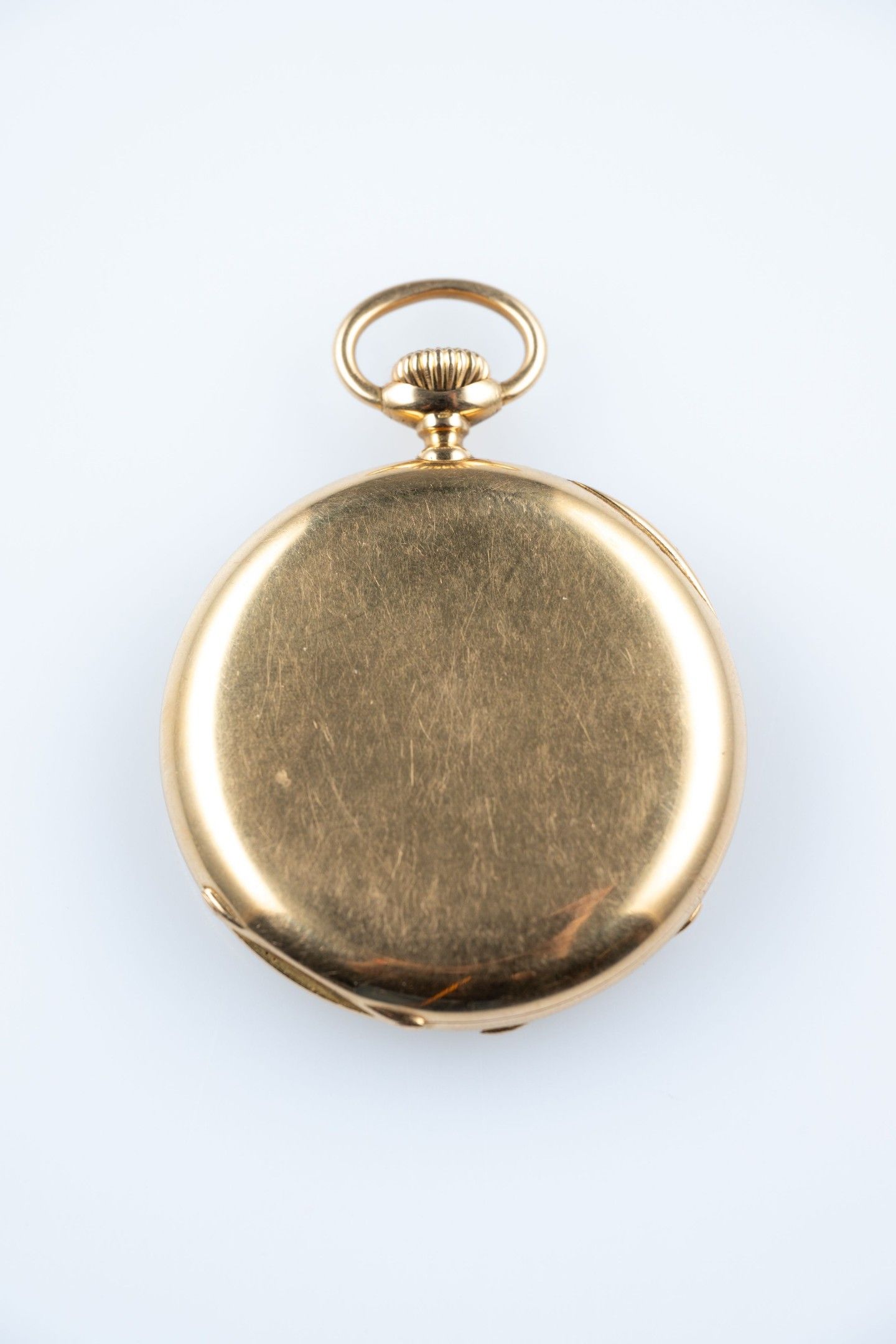 18k (750 thousandths) yellow gold gousset watch, white enamelled dial, hours and minutes in Arabic numerals, railway track and seconds counter at six o'clock. Gold dust cover.