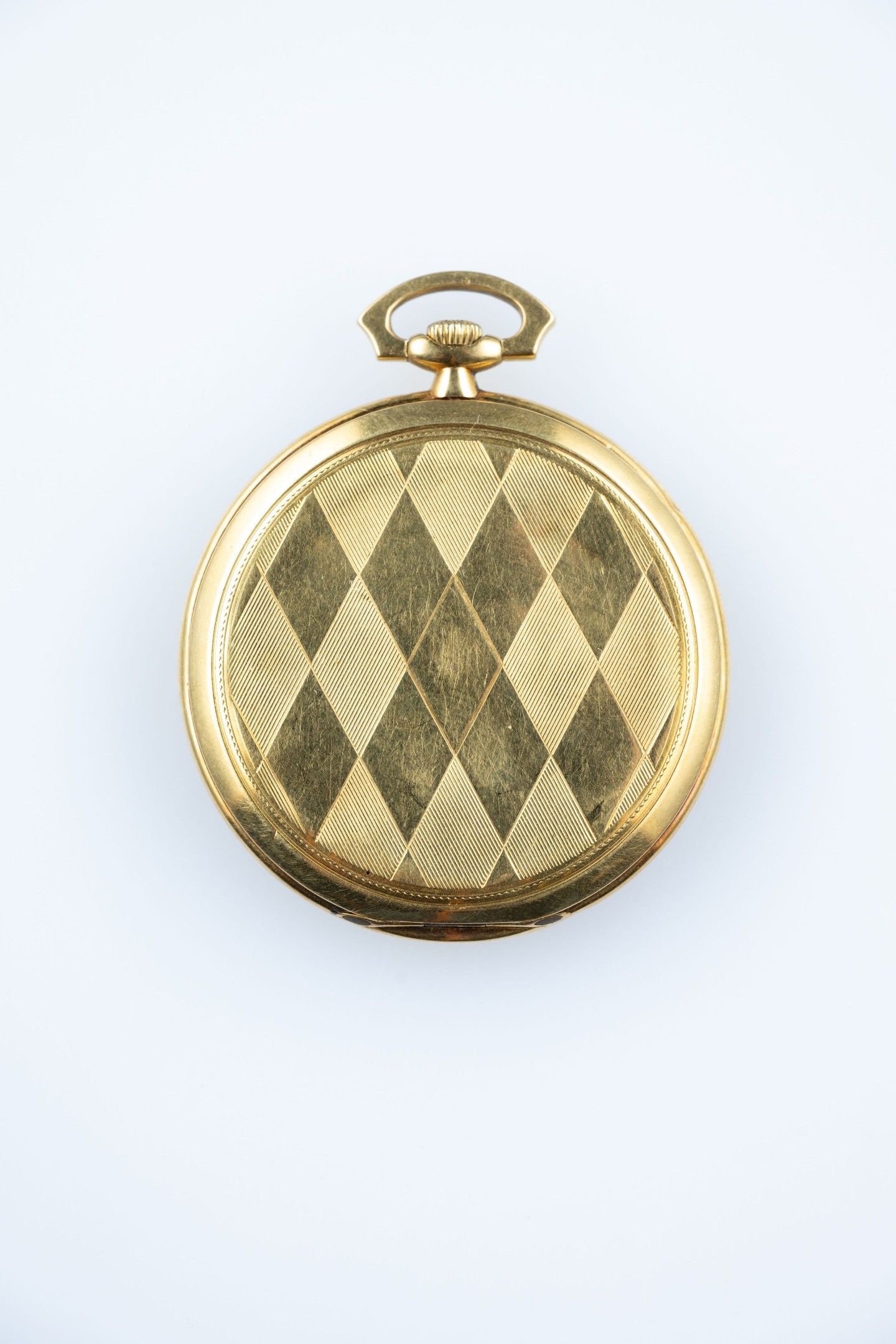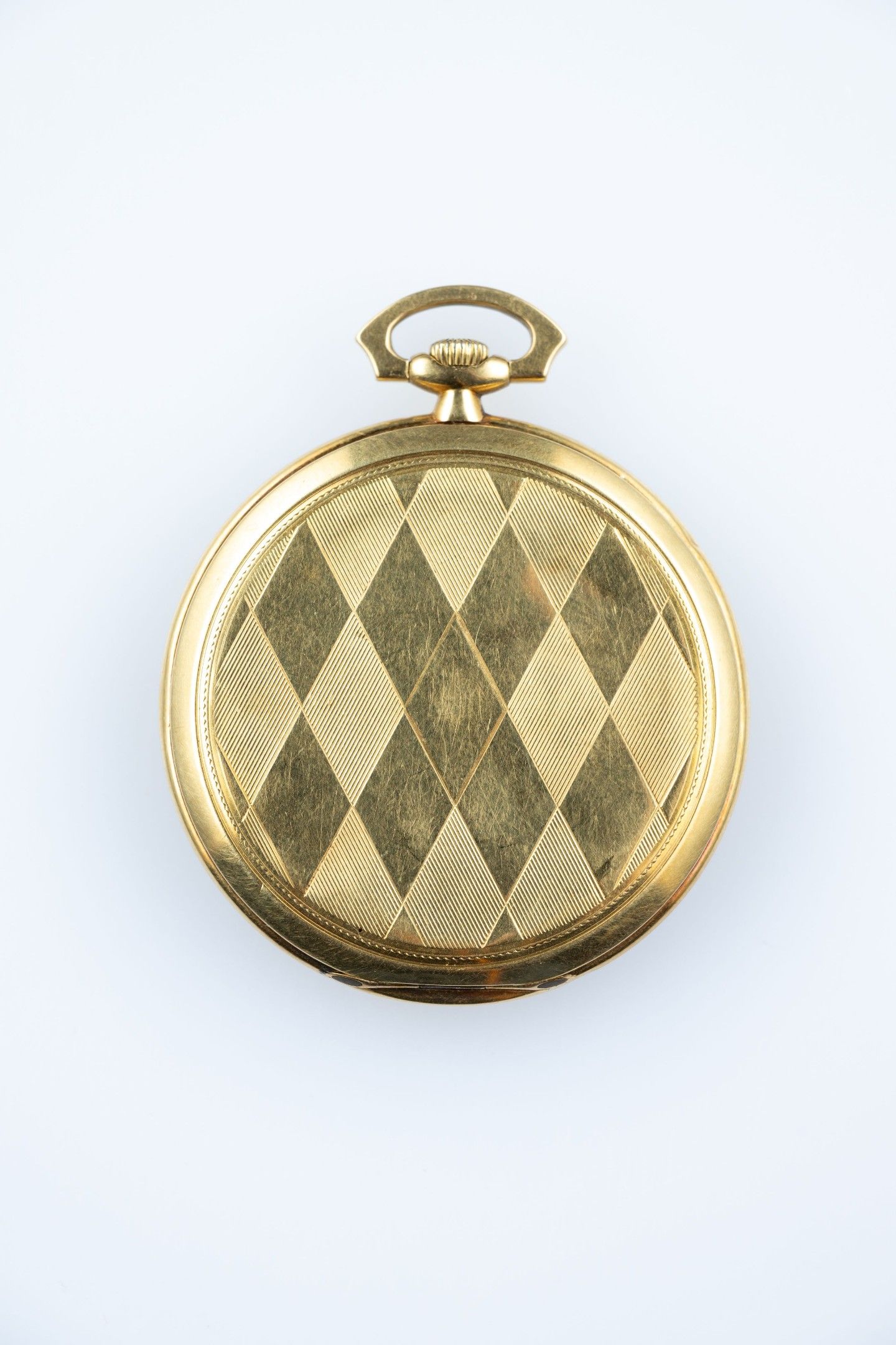 18k (750 thousandths) yellow gold gousset watch with diamond guilloché back, ivory dial with Roman numerals and railway track, seconds dial at six o'clock.
