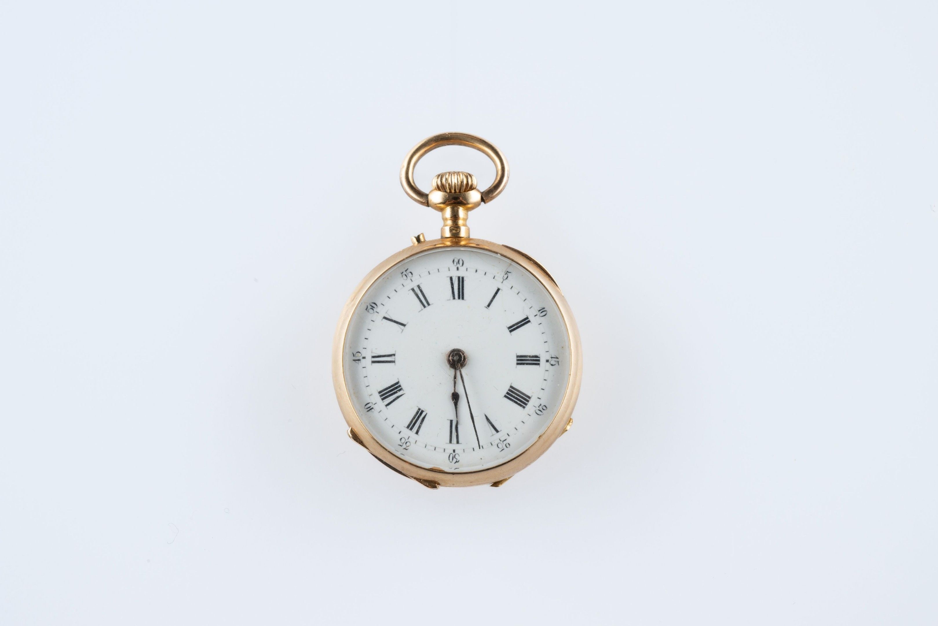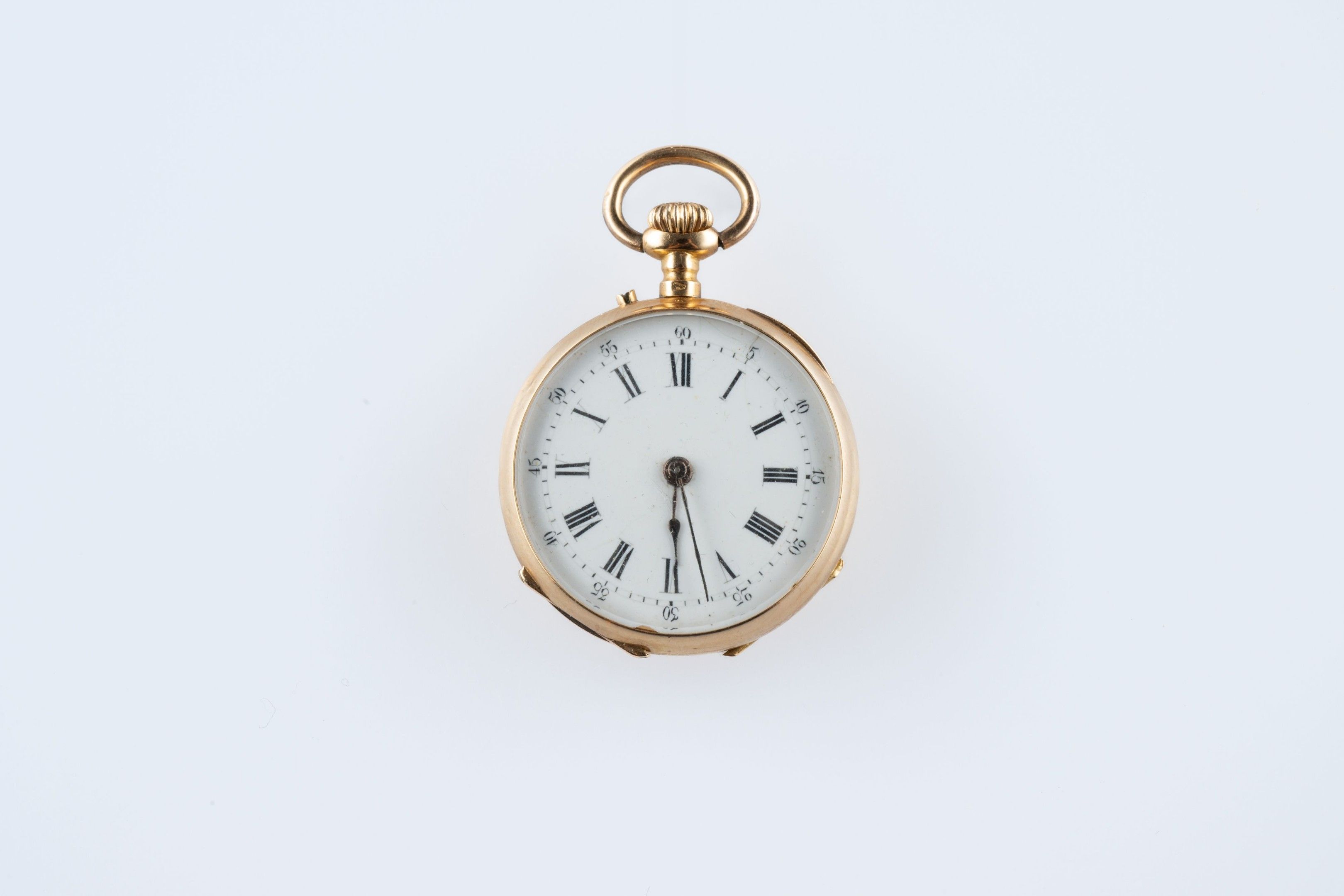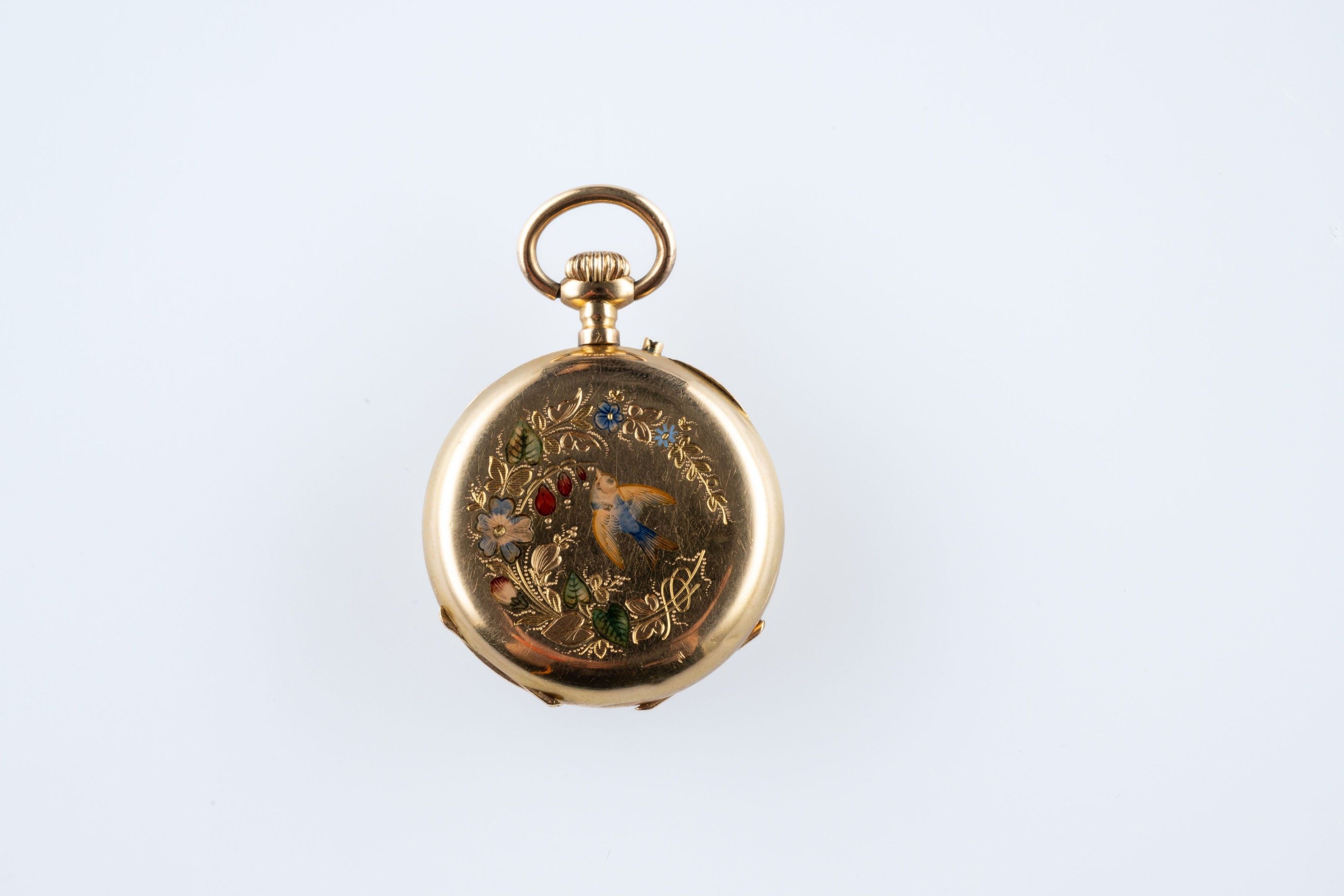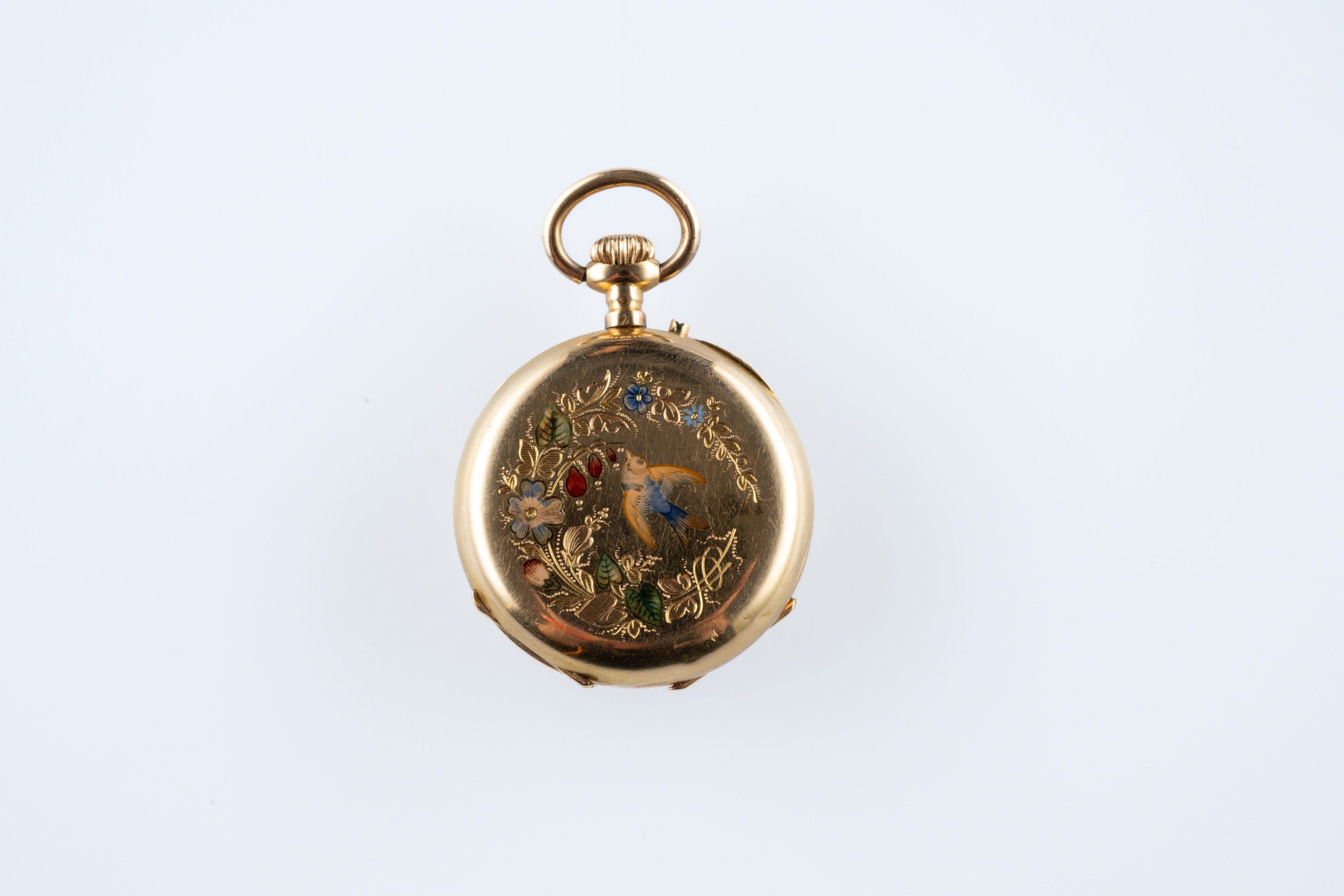 Collar watch in 18k (750 thousandths) yellow gold, the finely chased and enamelled back decorated with a swallow and flowers, the white enamelled dial. The gold dust cover.