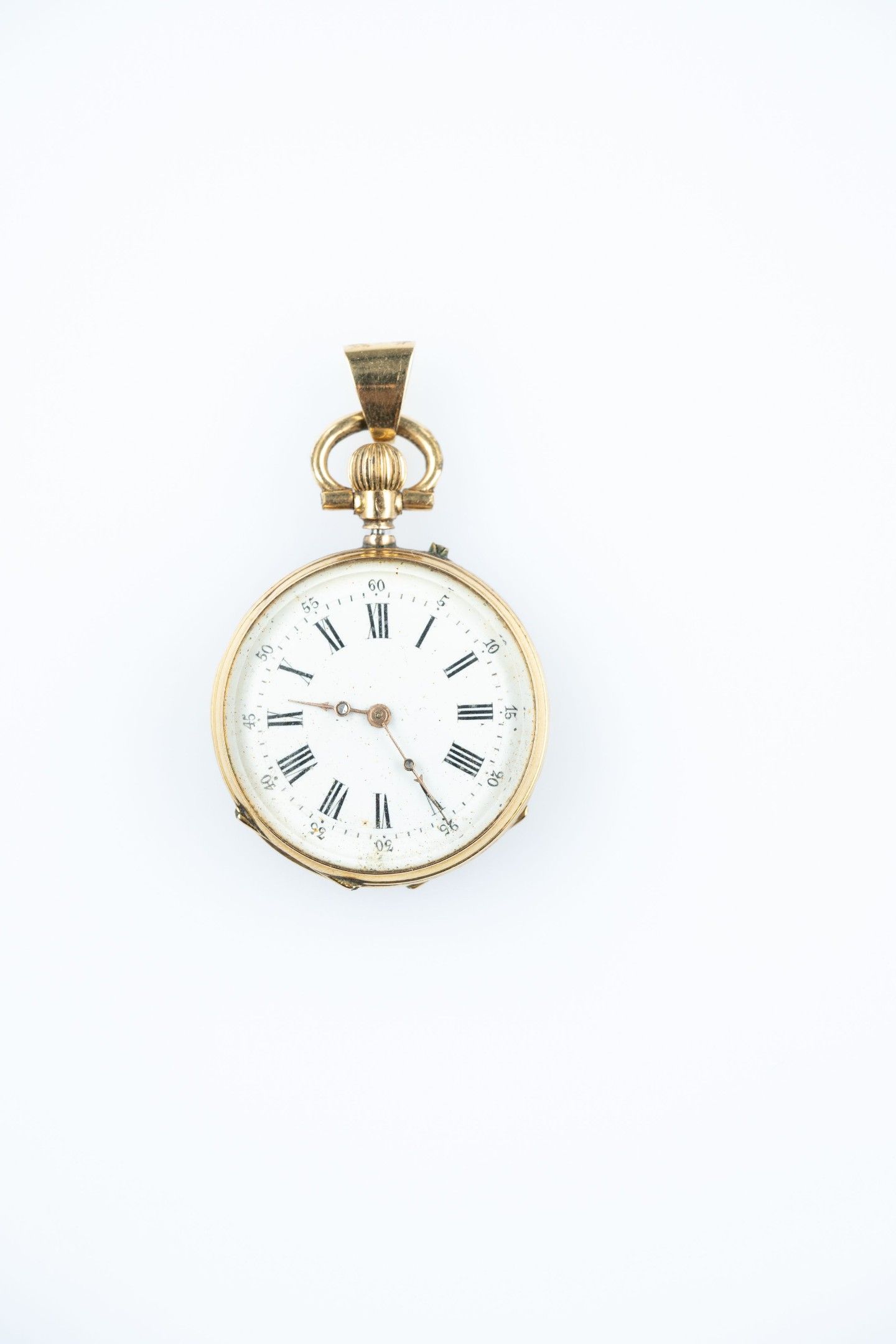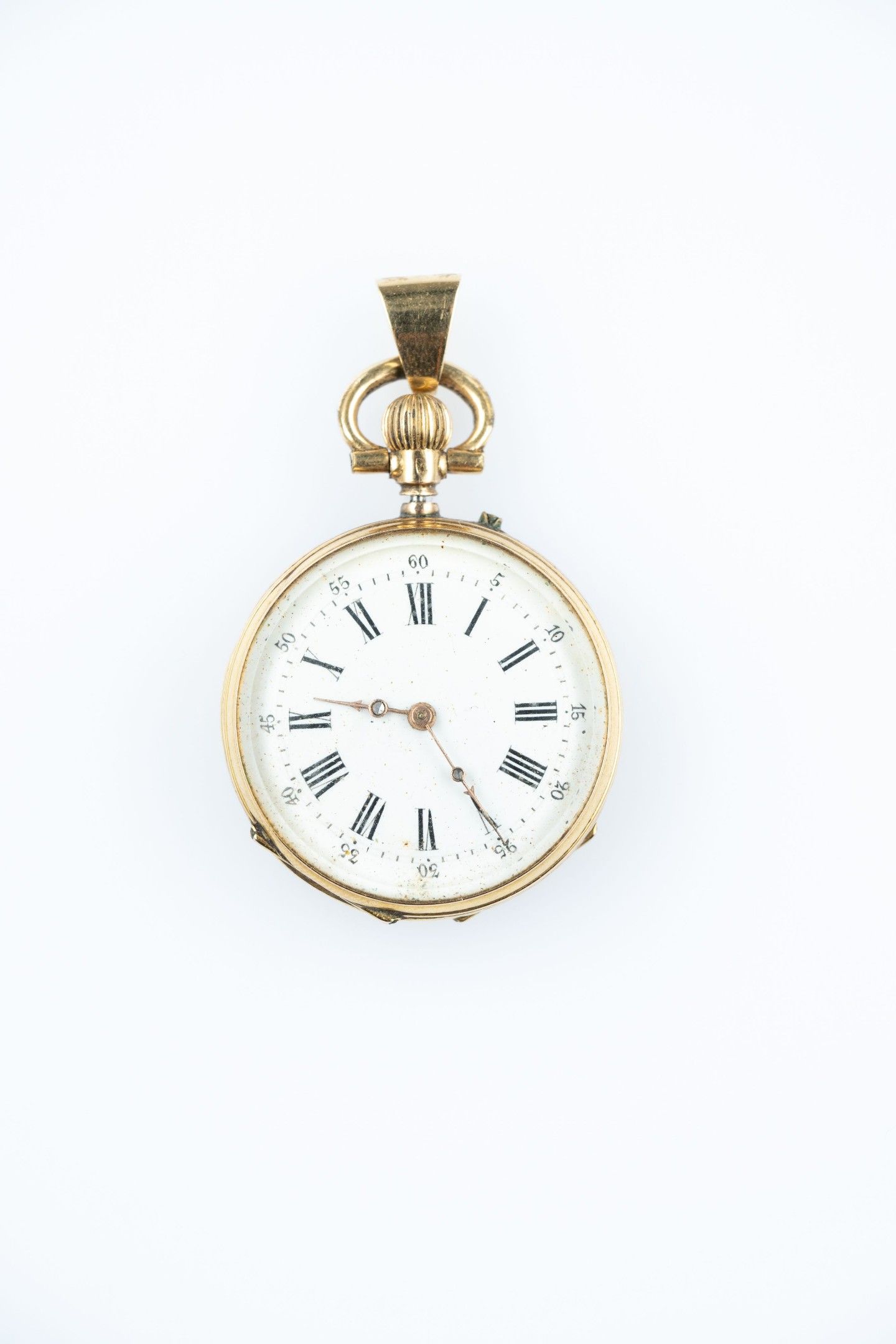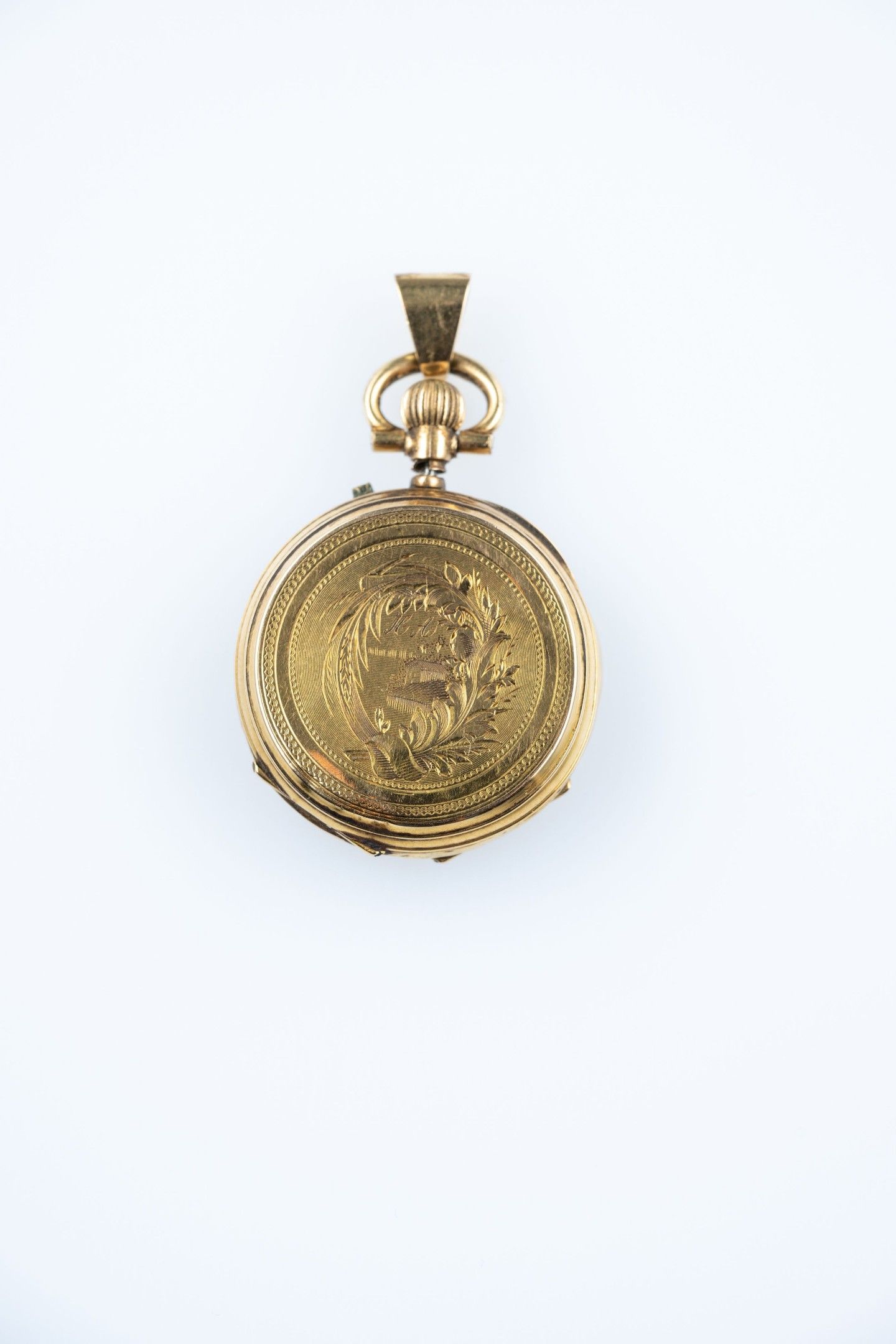 18k (750 thousandths) yellow gold collar watch, white enamelled dial, hours in Roman numerals, minutes in Arabic numerals and railway track. The back finely chased with palmettes and a house under a monogram. The gold dust cover. The clasp is set off with a hoop to form a pendant.