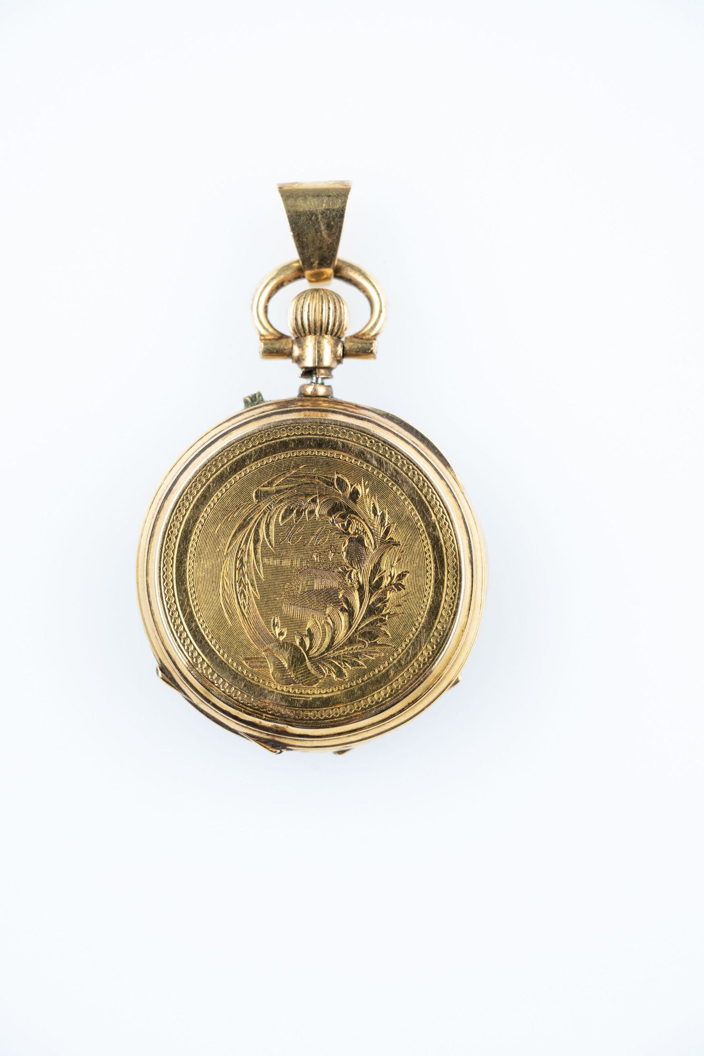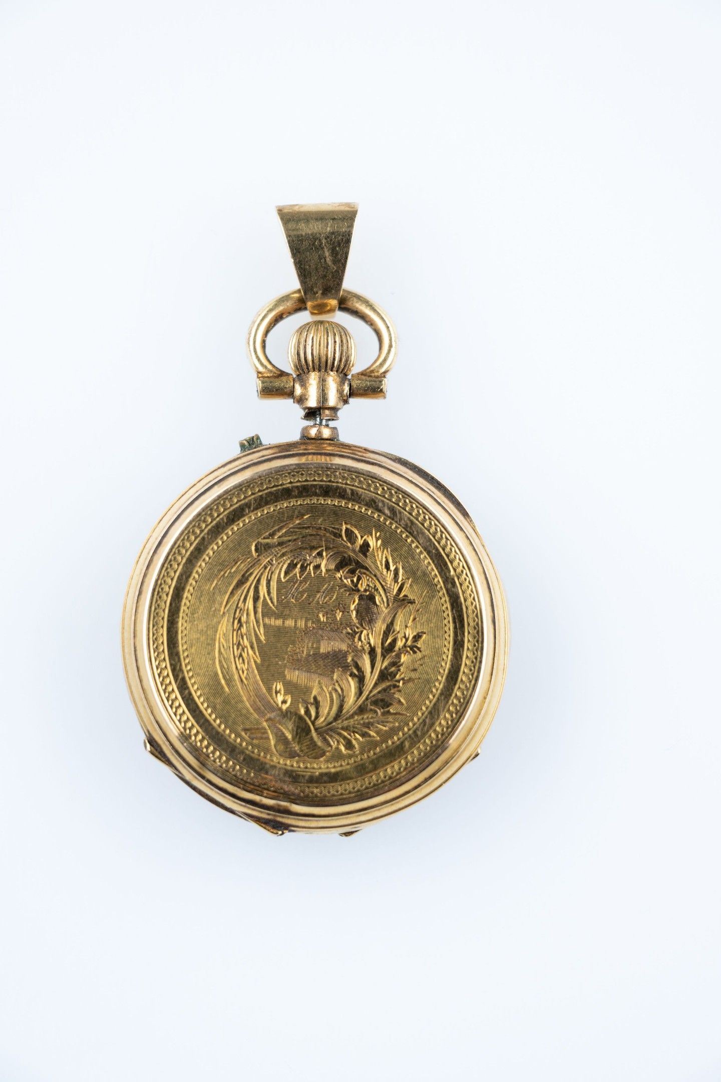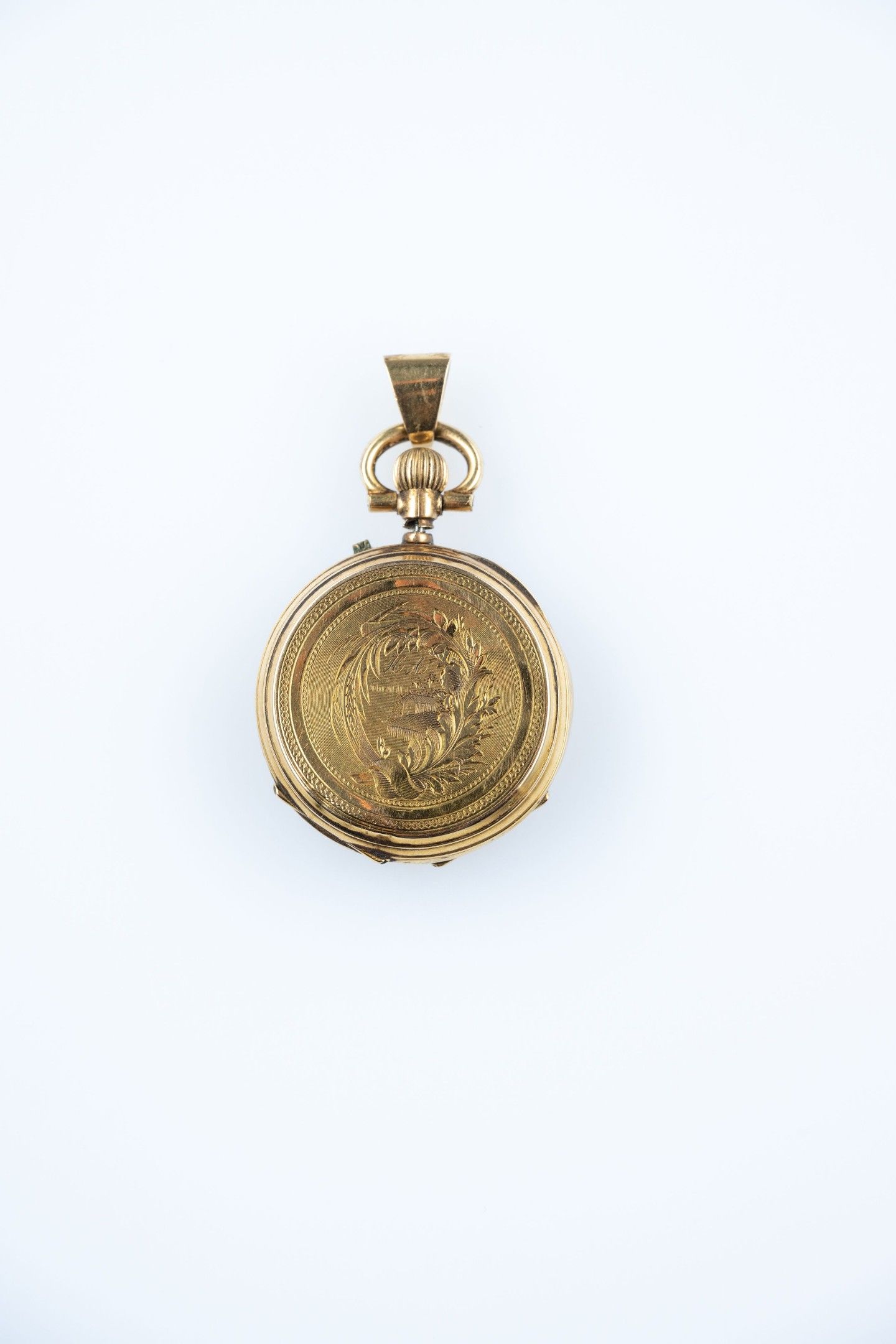 18k (750 thousandths) yellow gold collar watch, white enamelled dial, hours in Roman numerals, minutes in Arabic numerals and railway track. The back finely chased with palmettes and a house under a monogram. The gold dust cover. The clasp is set off with a hoop to form a pendant.