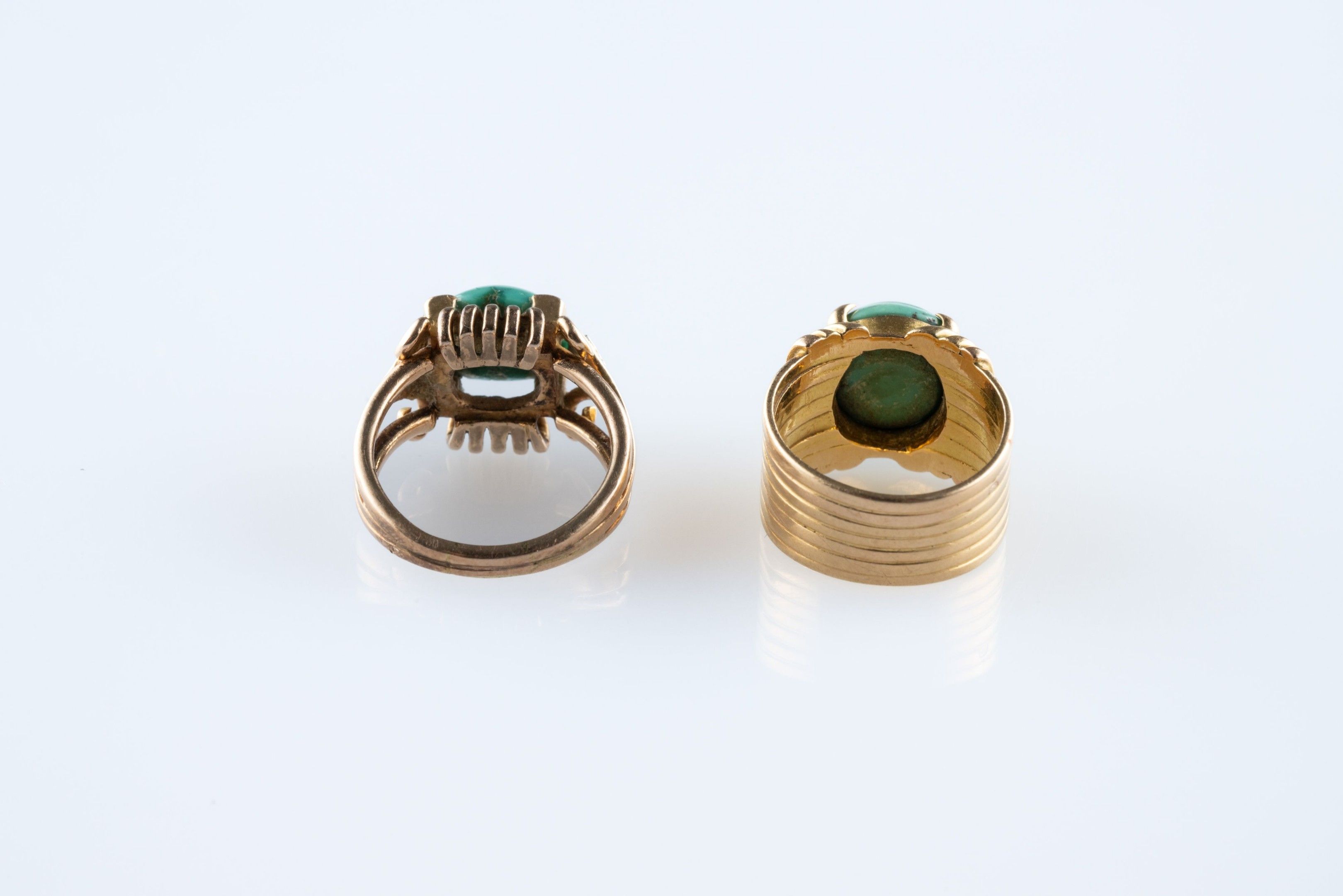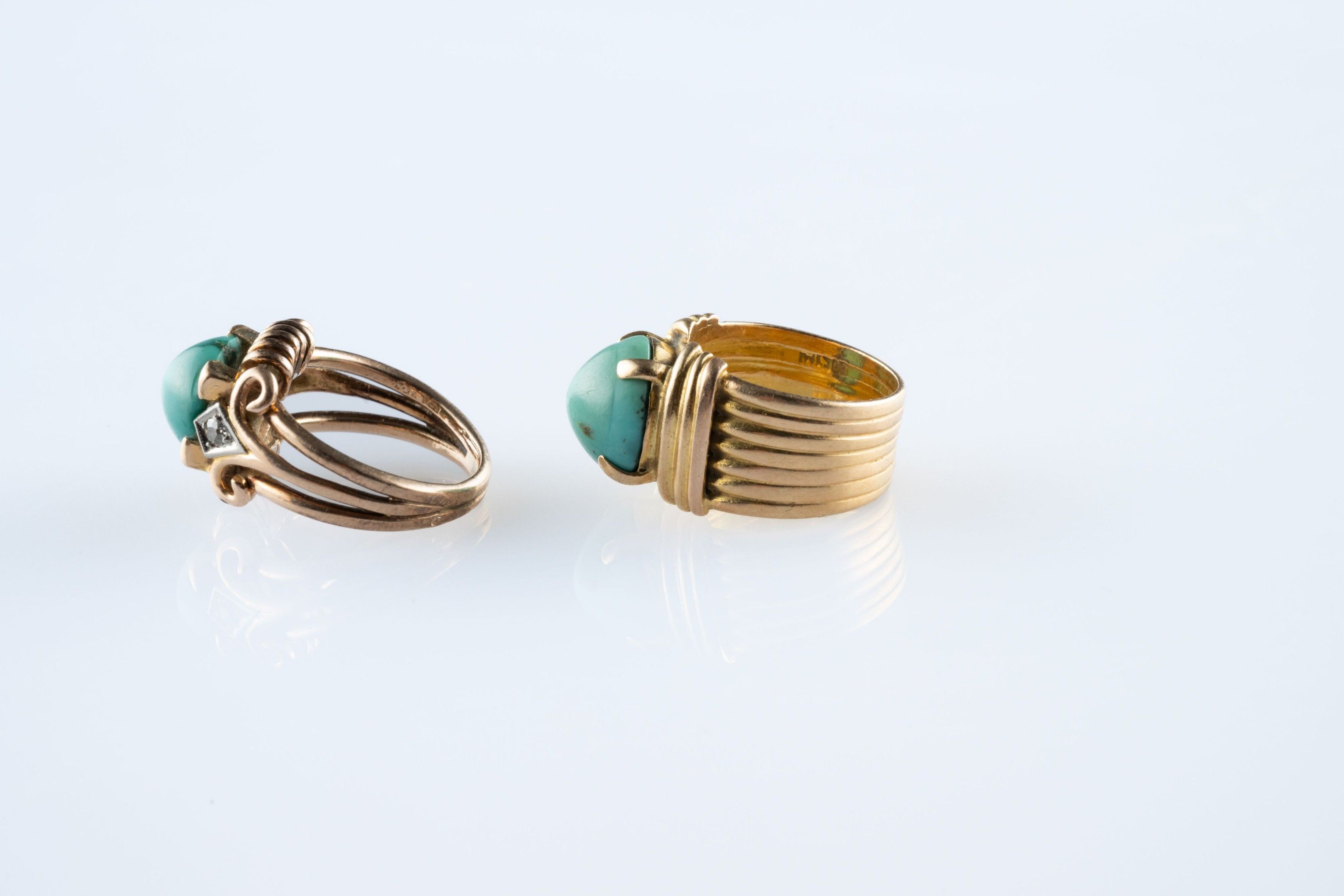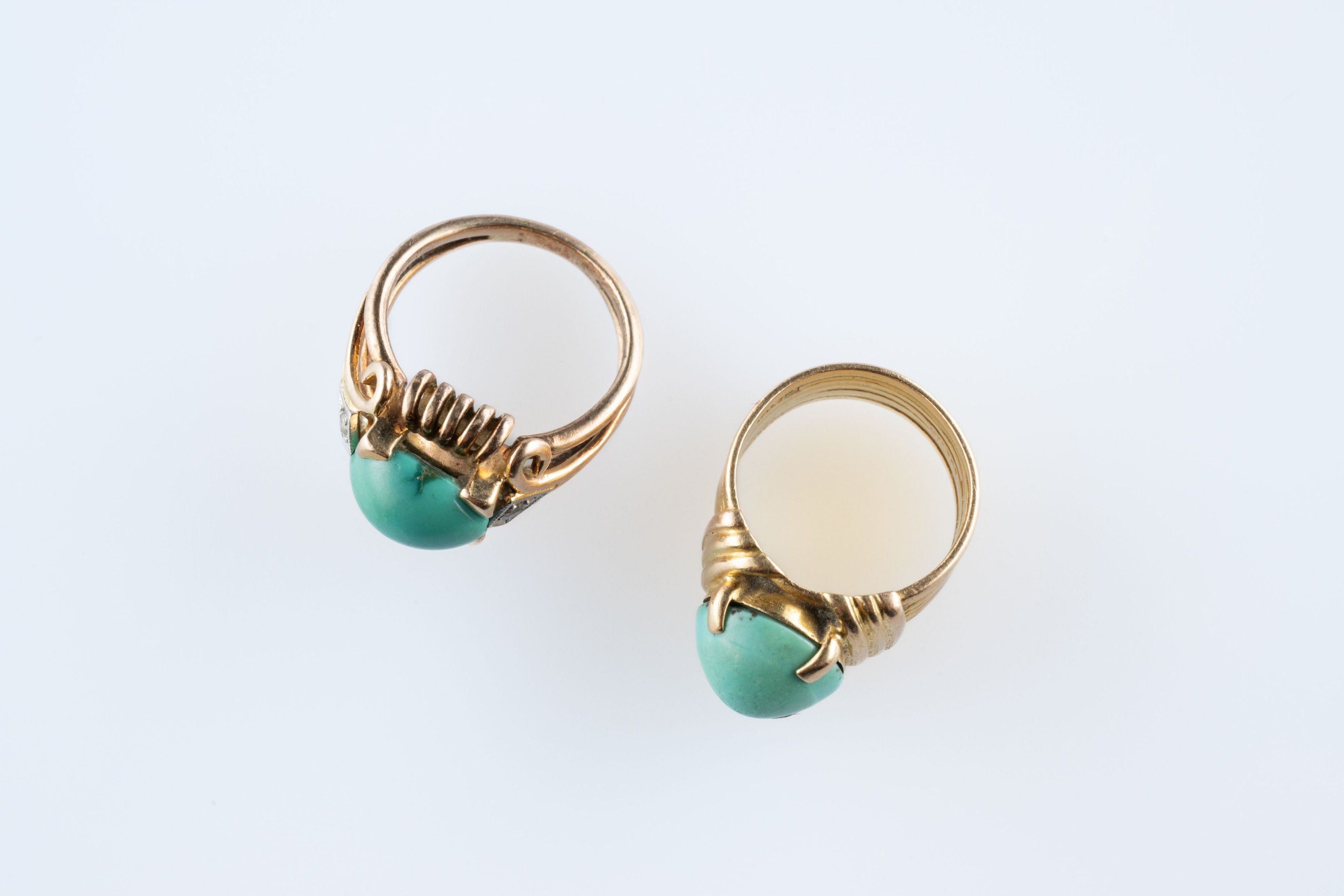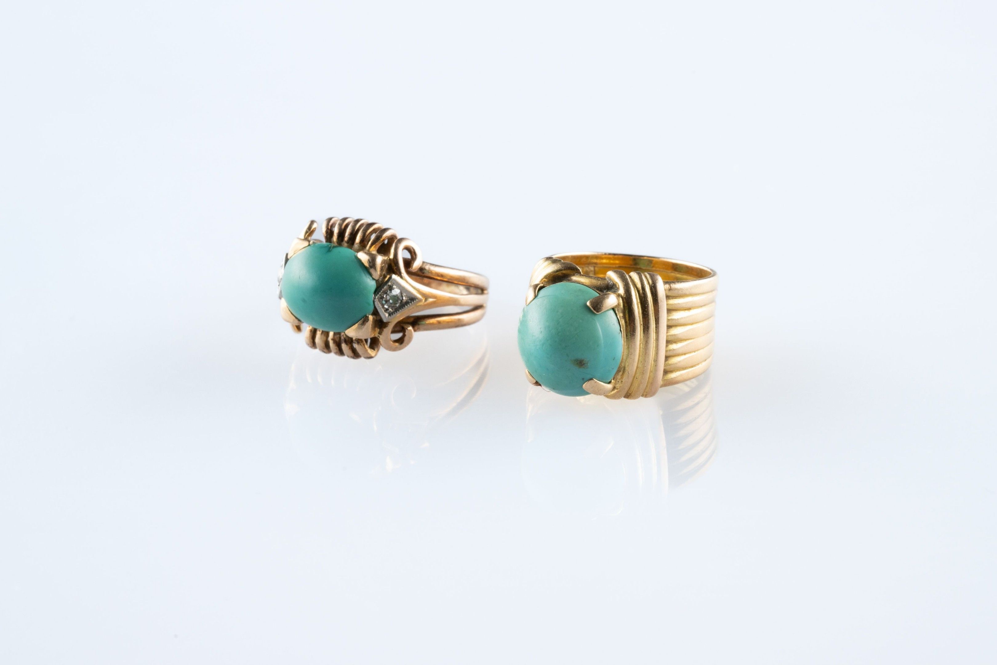 Set of two 18k (750 thousandths) yellow gold rings set with a truquoise crysocolla cabochon, the first in a gadrooned band setting, the second set with two small brilliants.