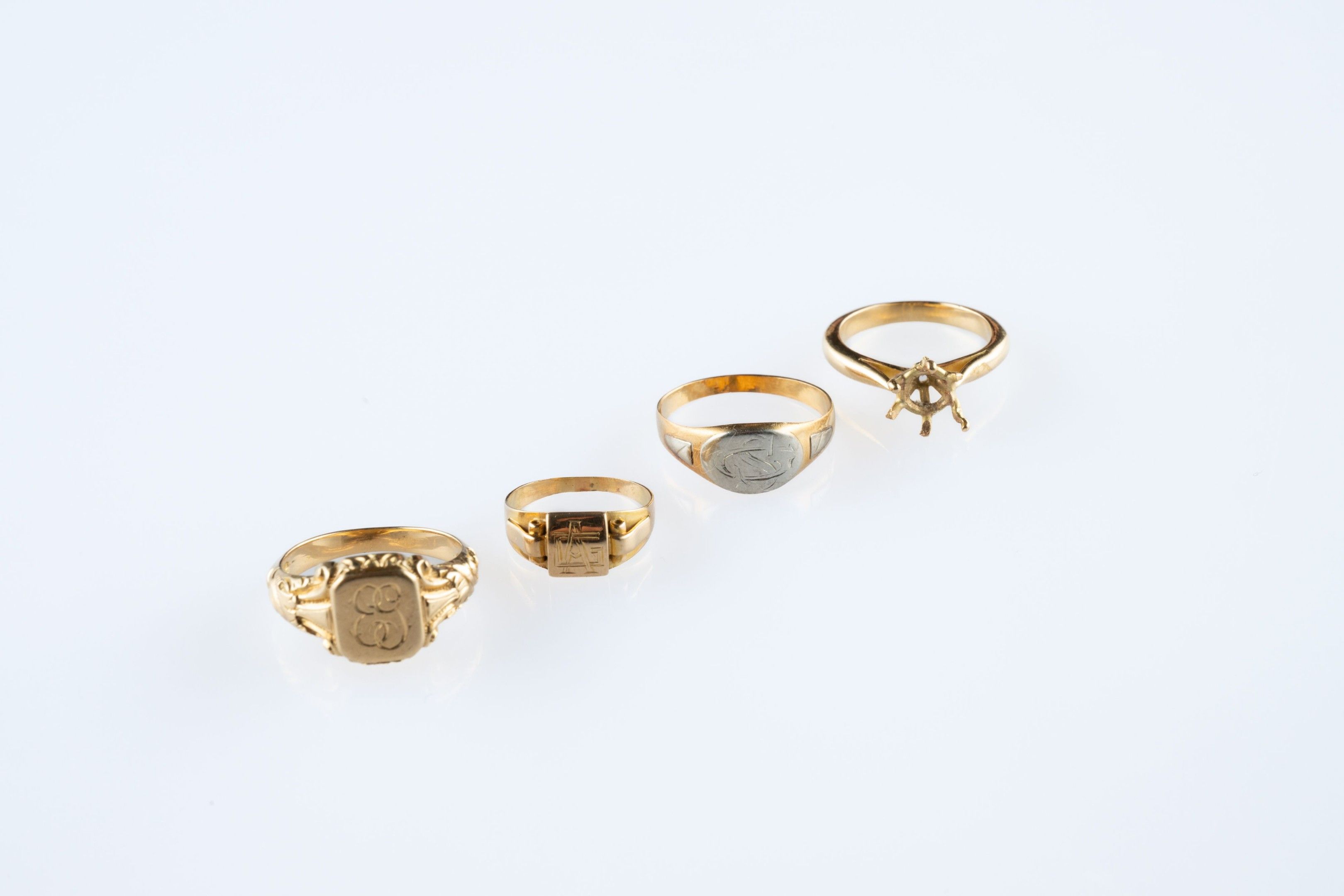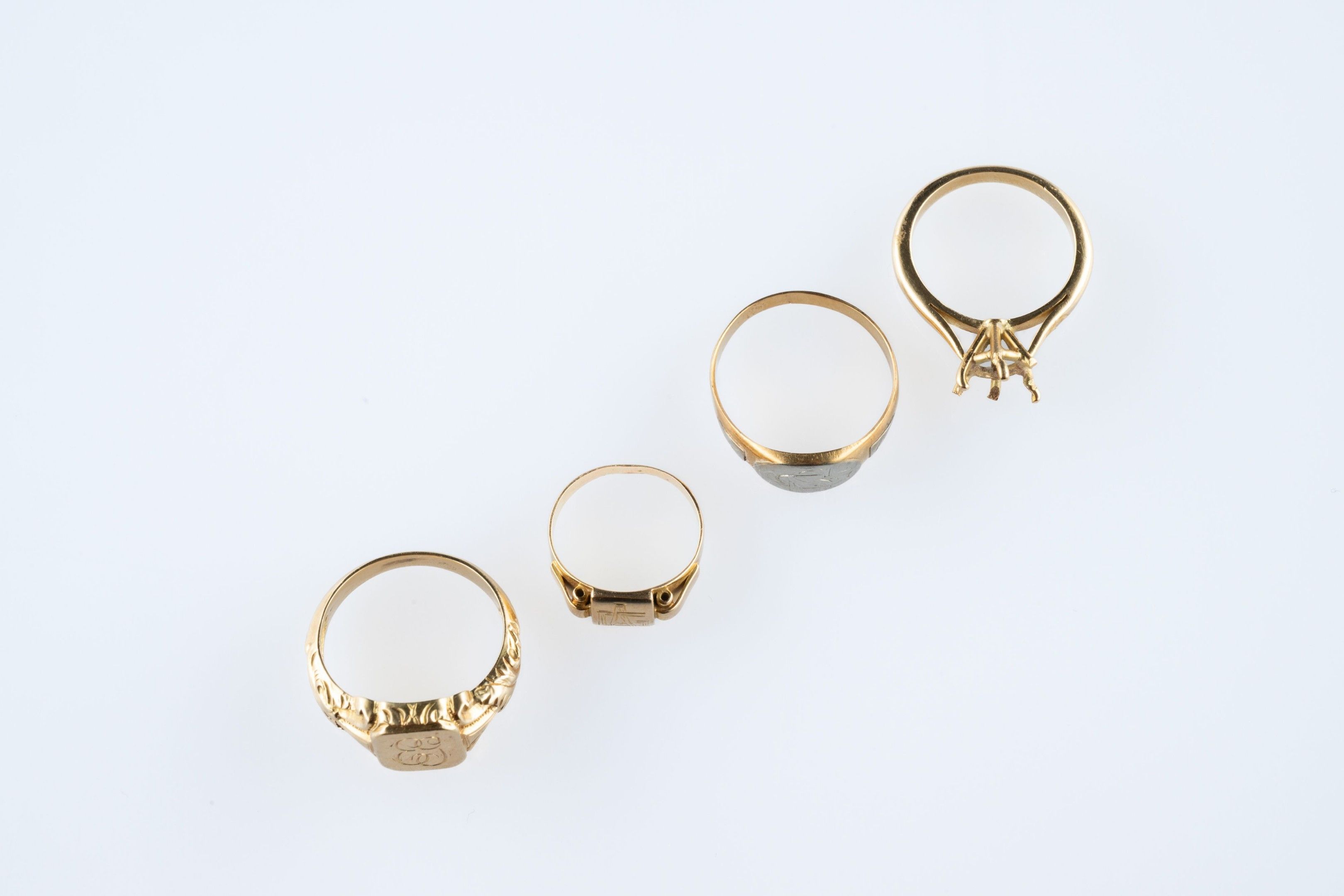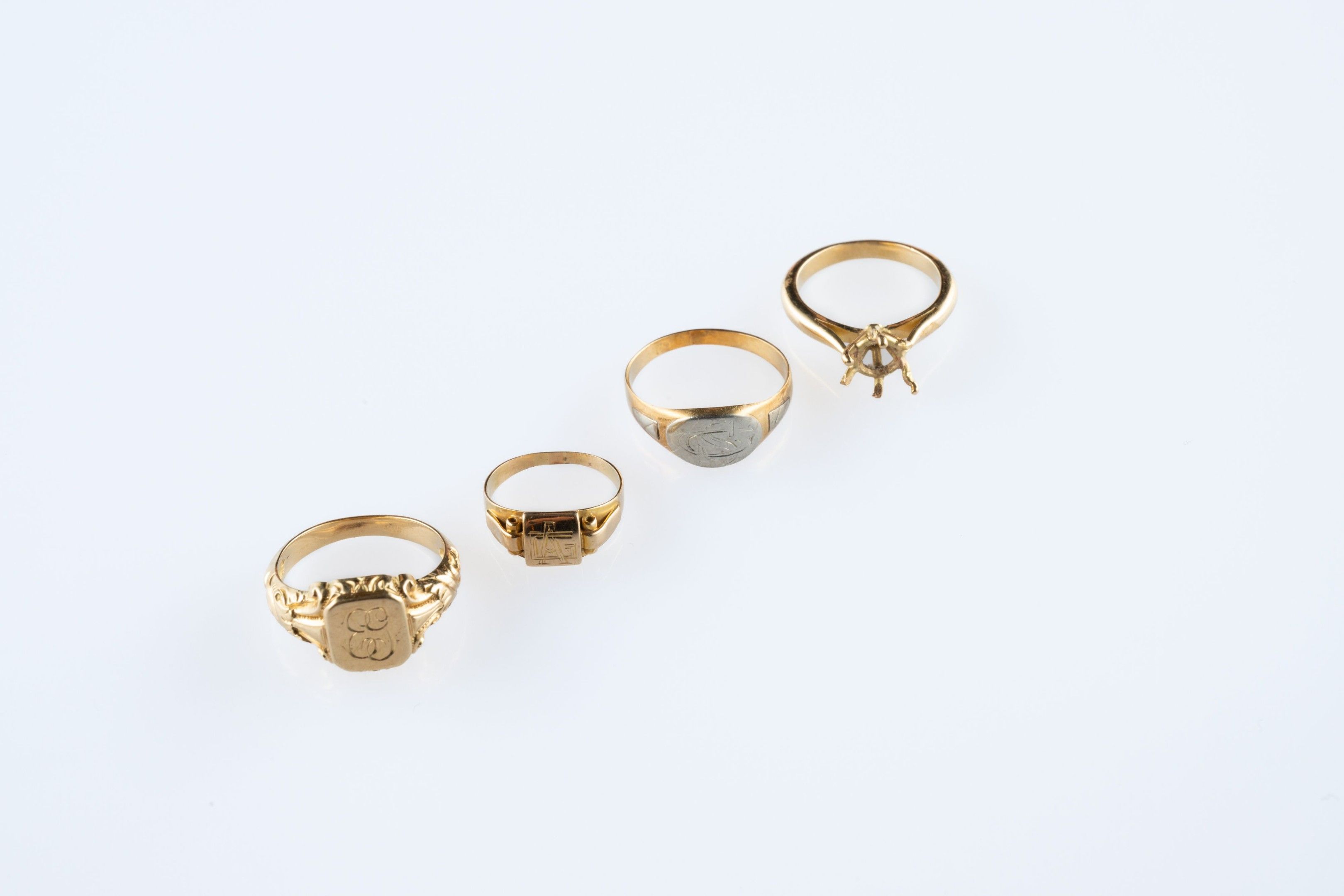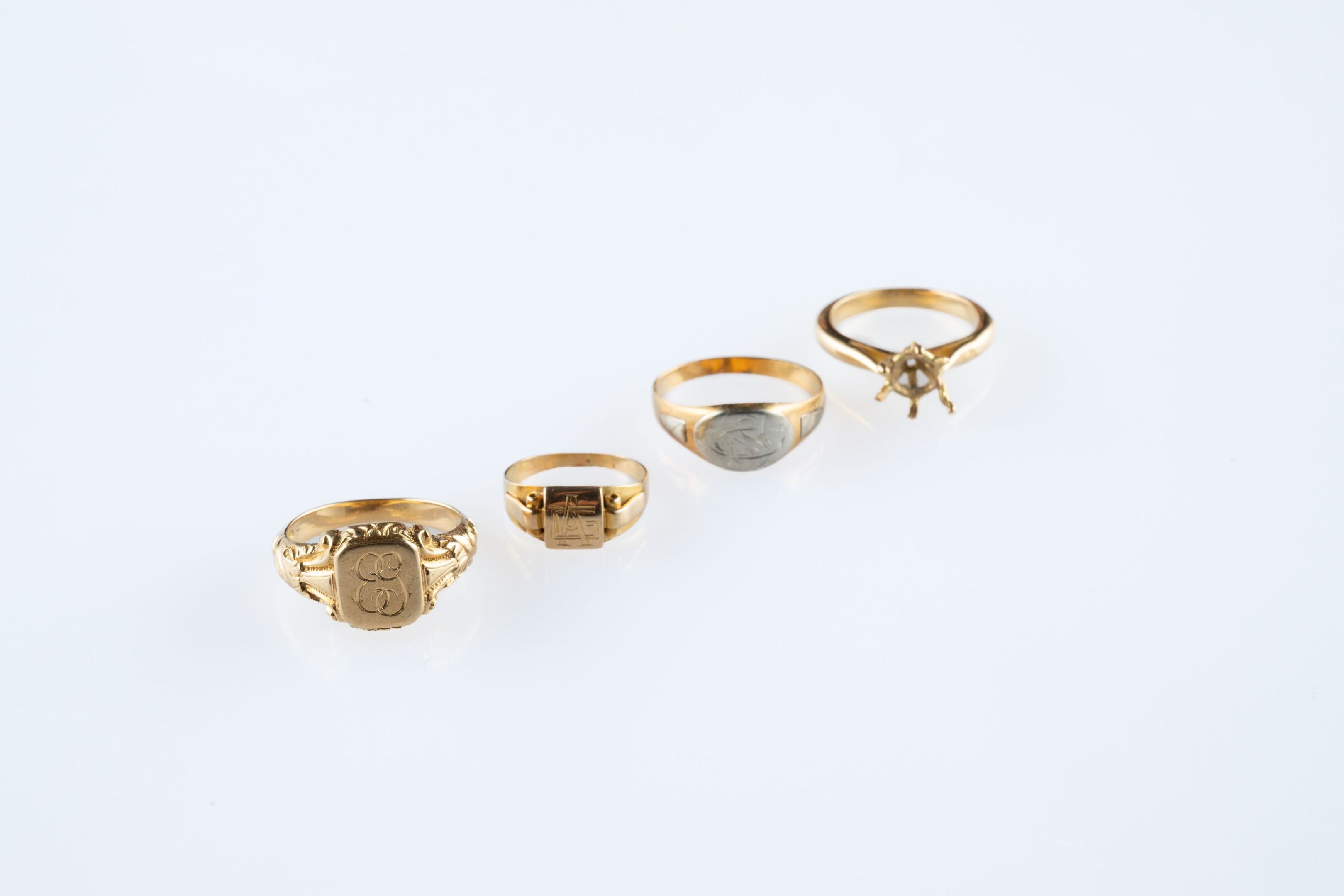 Set of three 18k (750 thousandths) yellow and white gold rings with engraved bezels and a solitaire setting.
