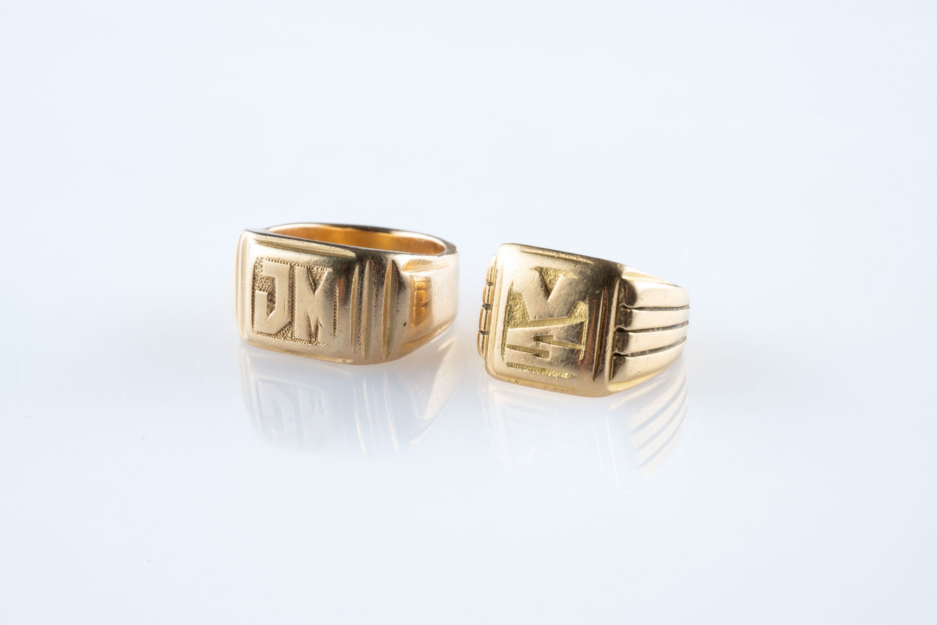 Set of two men's signet rings in 18k (750 thousandths) yellow gold, monogrammed "WC" and "VS".