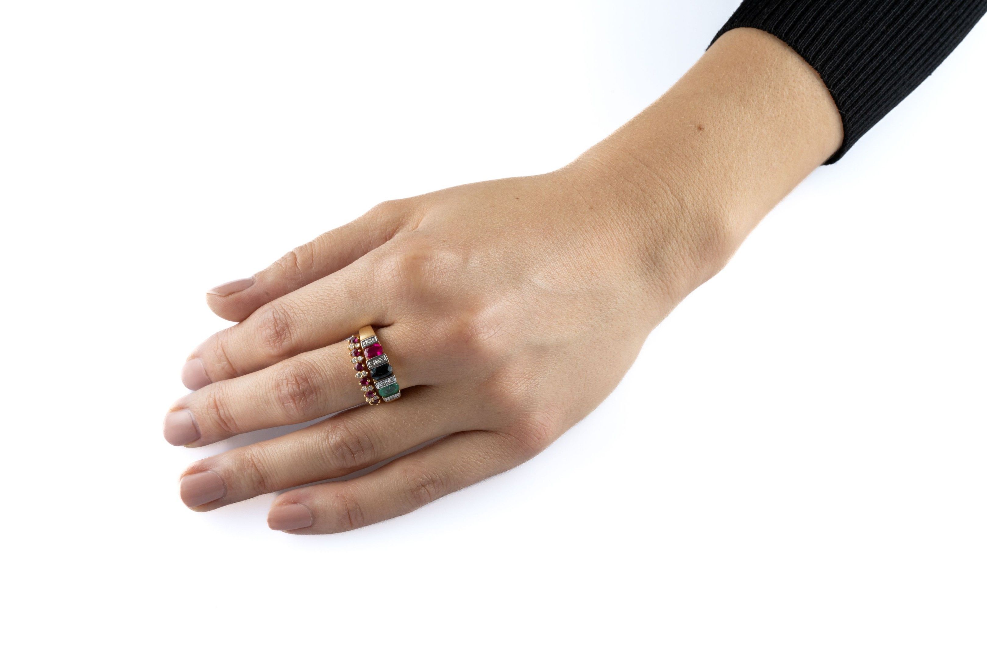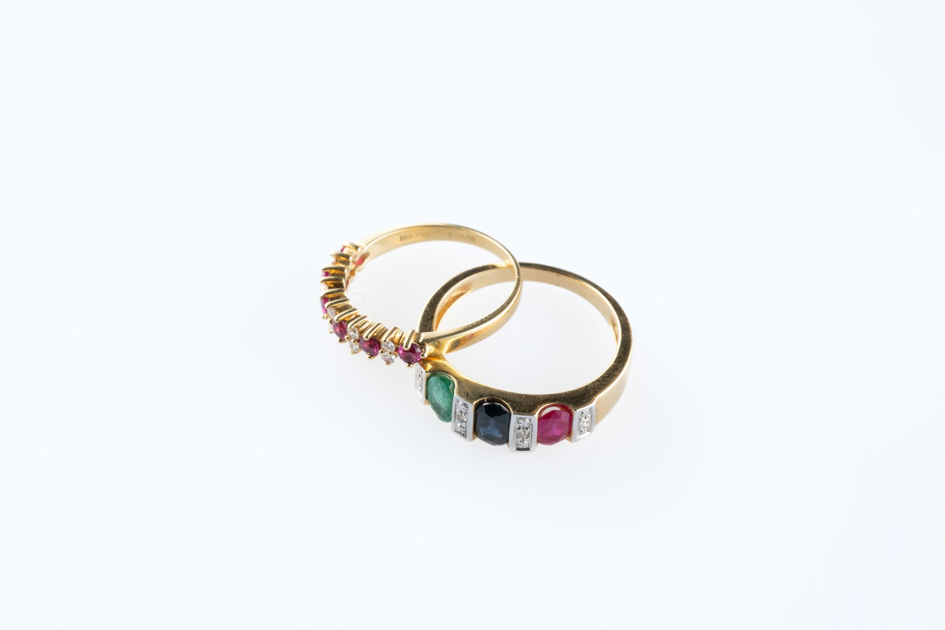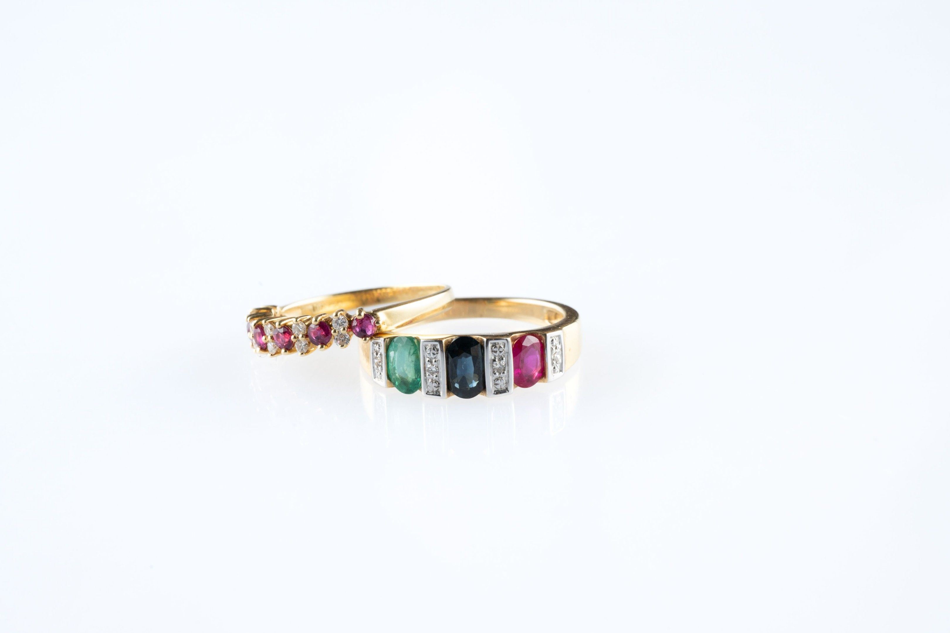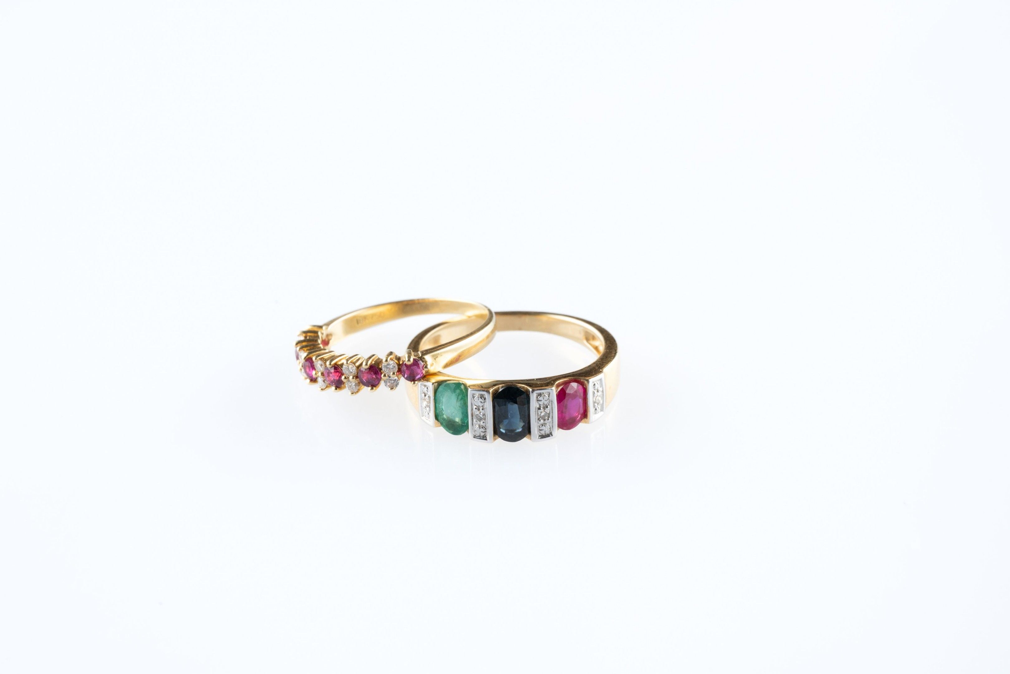 Set of two rings in 18k (750 thousandths) yellow gold: one semi American wedding band set with small rubies separated by small brilliants, the second set half-closed with an emerald, a sapphire and a ruby separated by small brilliants on white gold elements.