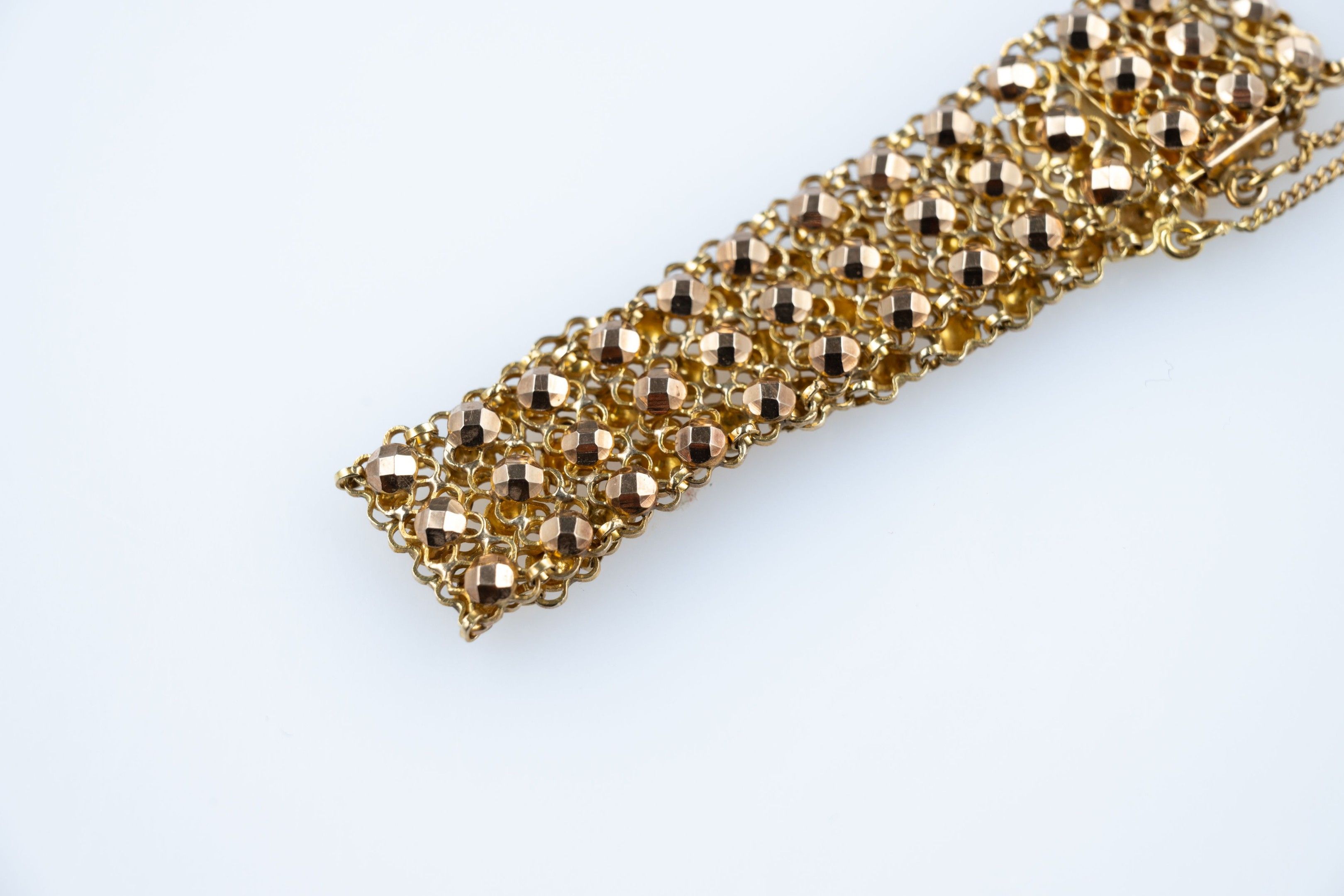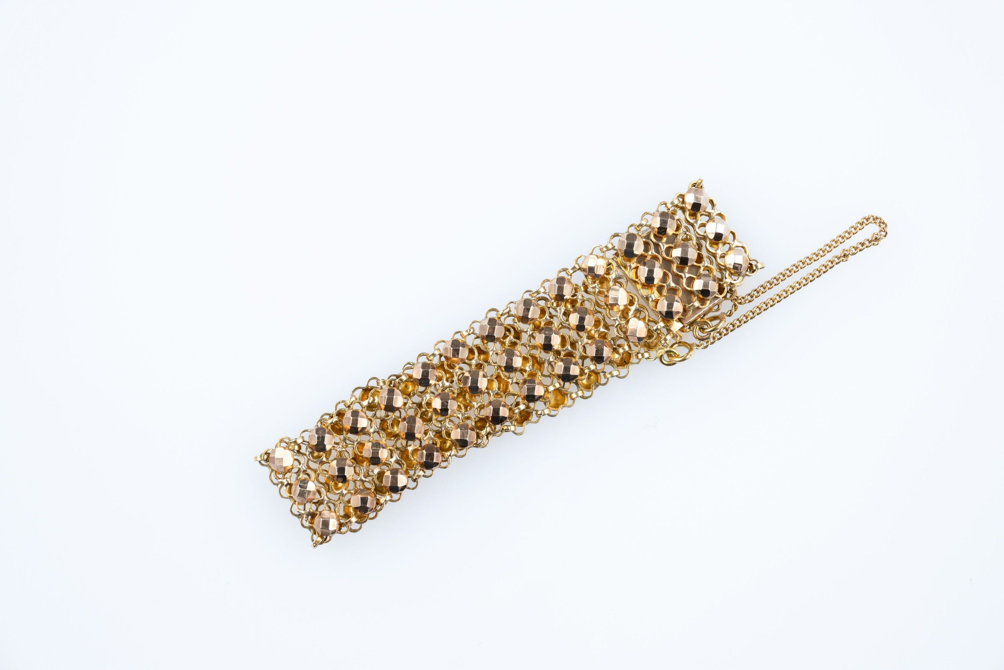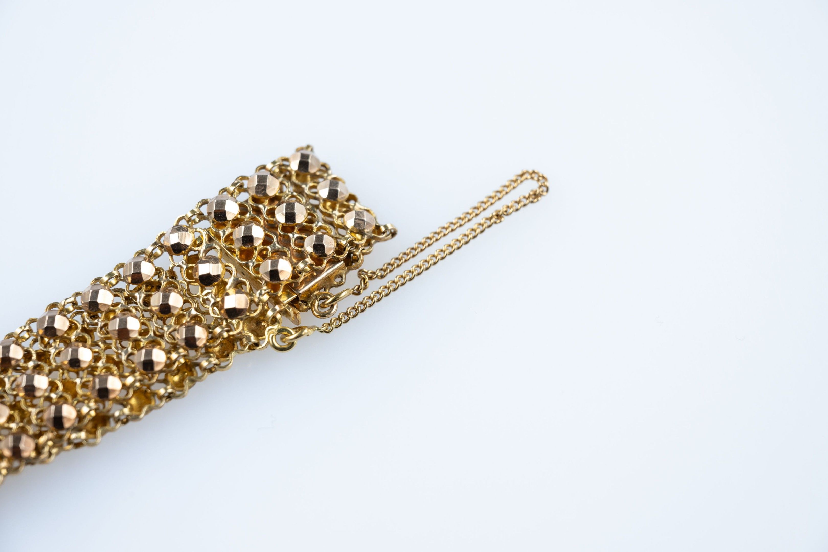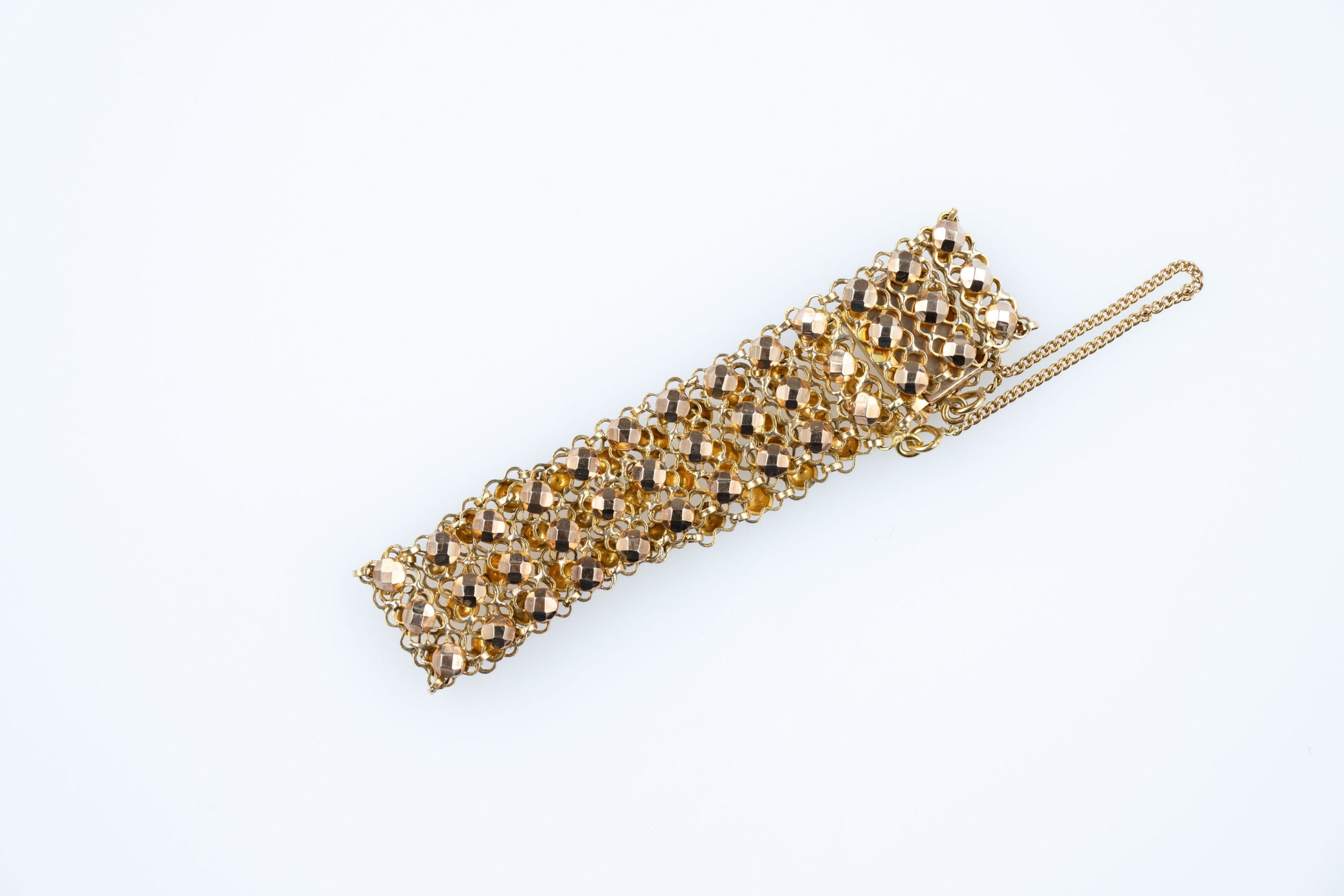 Ribbon bracelet in 18k (750 thousandths) yellow gold with three rows of embossed pearls on a mesh base.