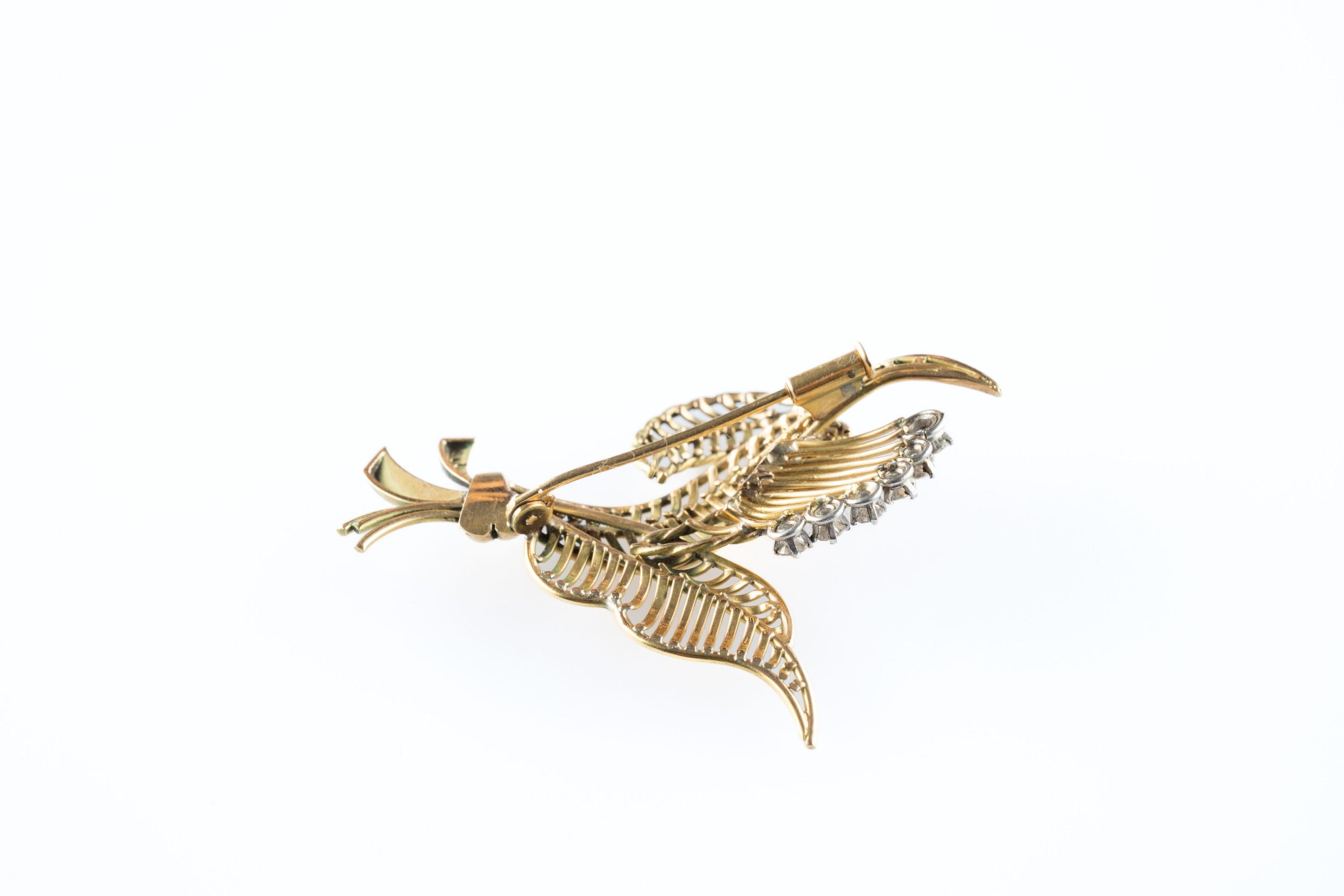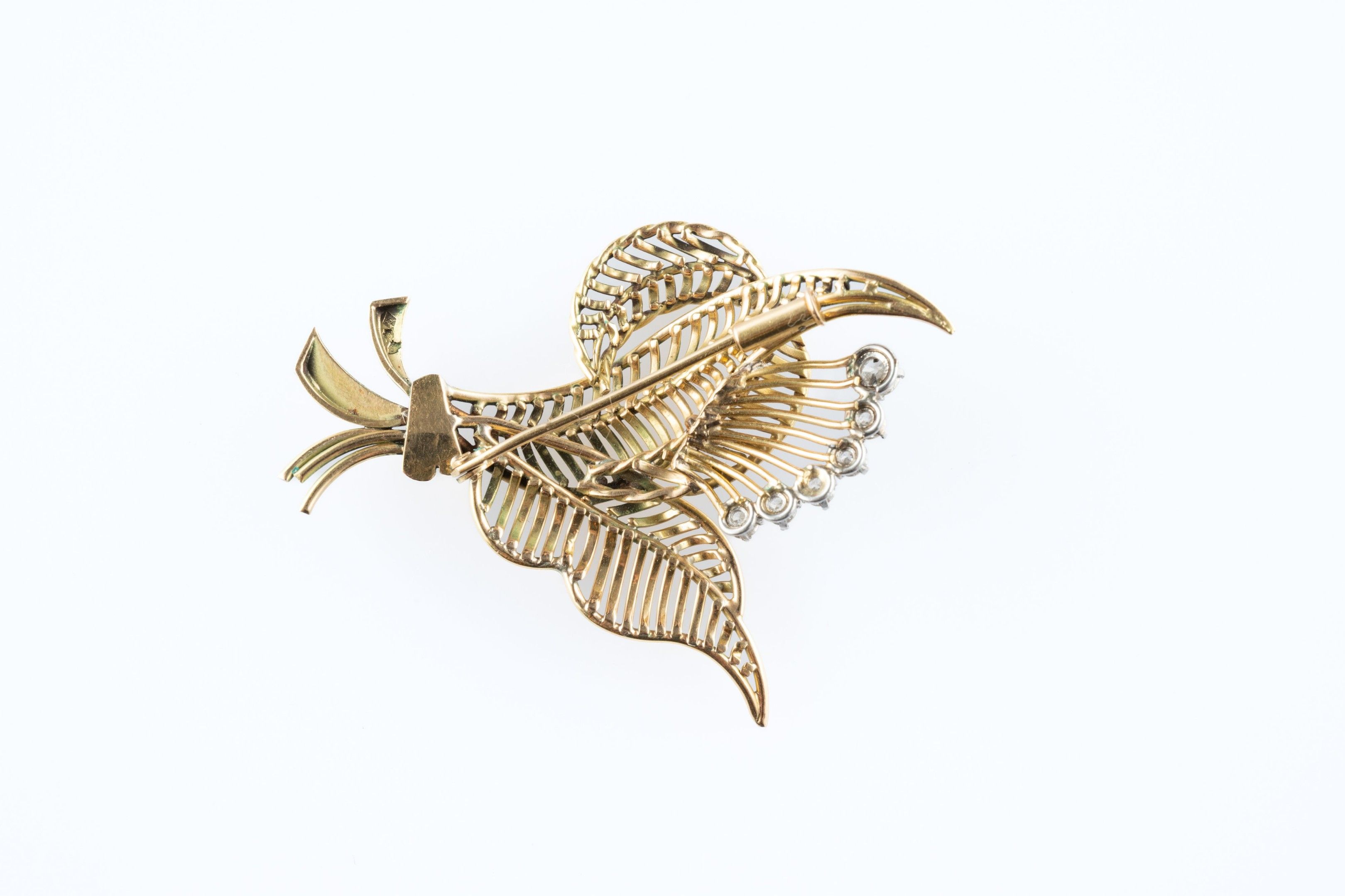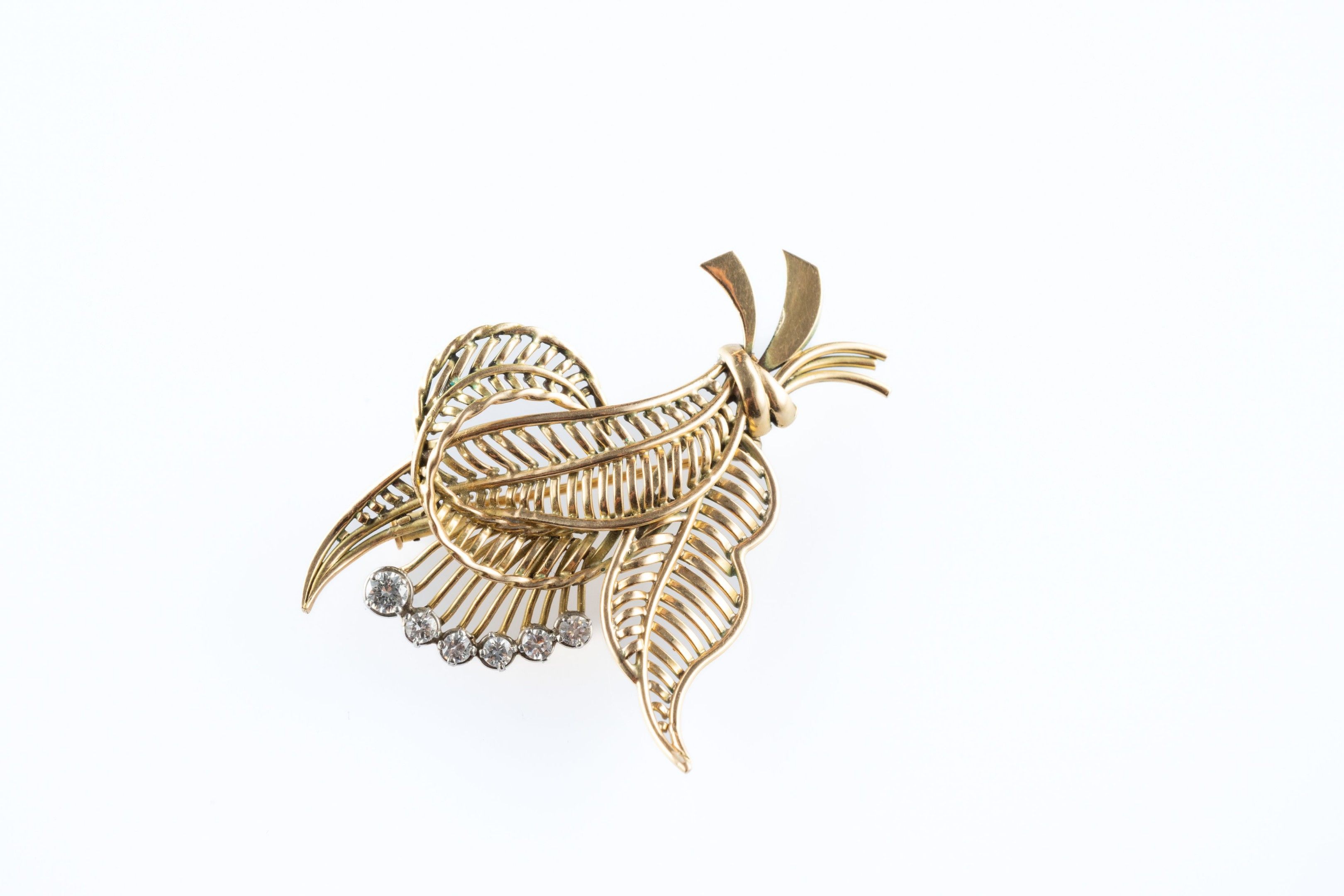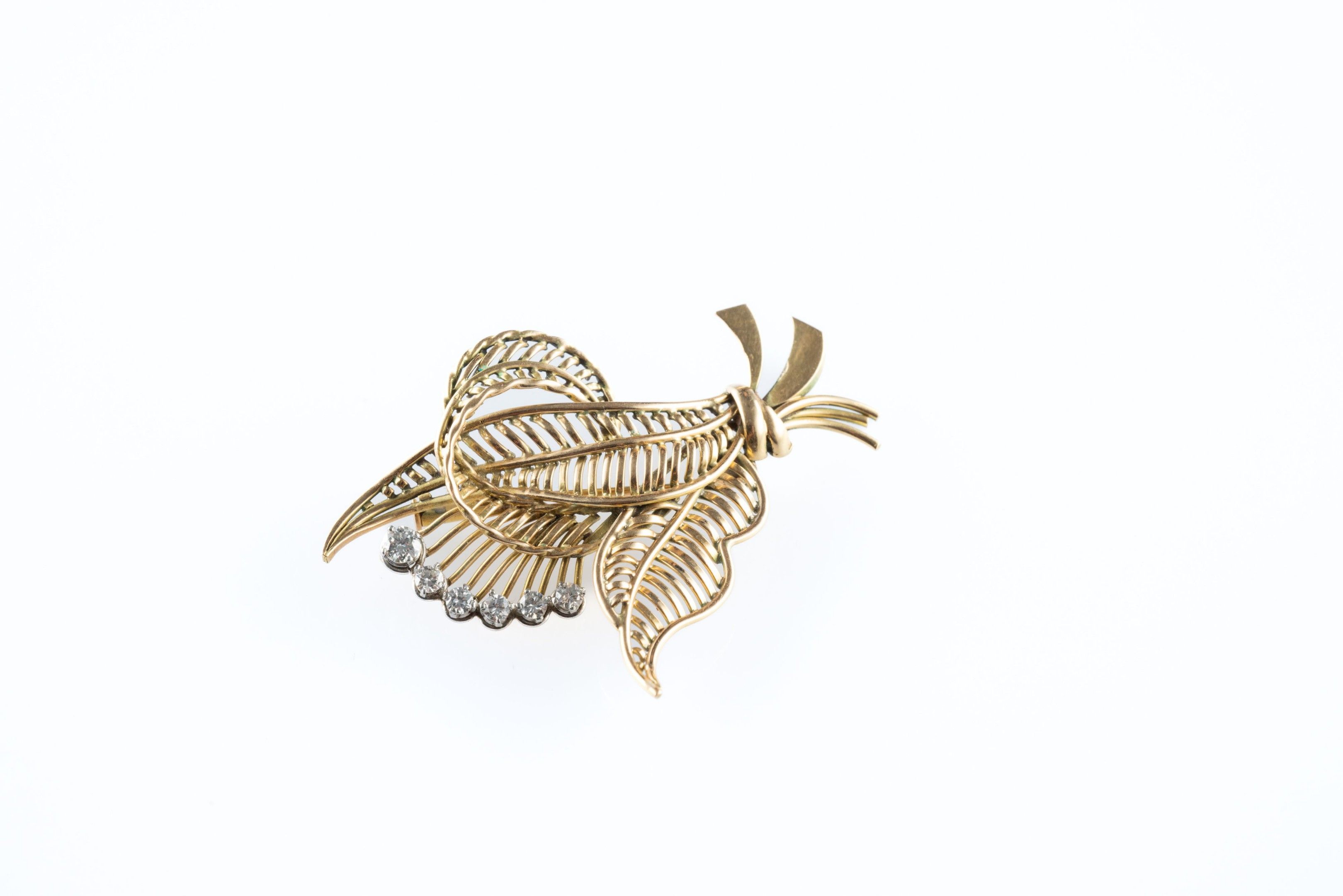 18k (750 thousandths) yellow gold and platinum (850 thousandths) foliate brooch set with six small round diamonds.