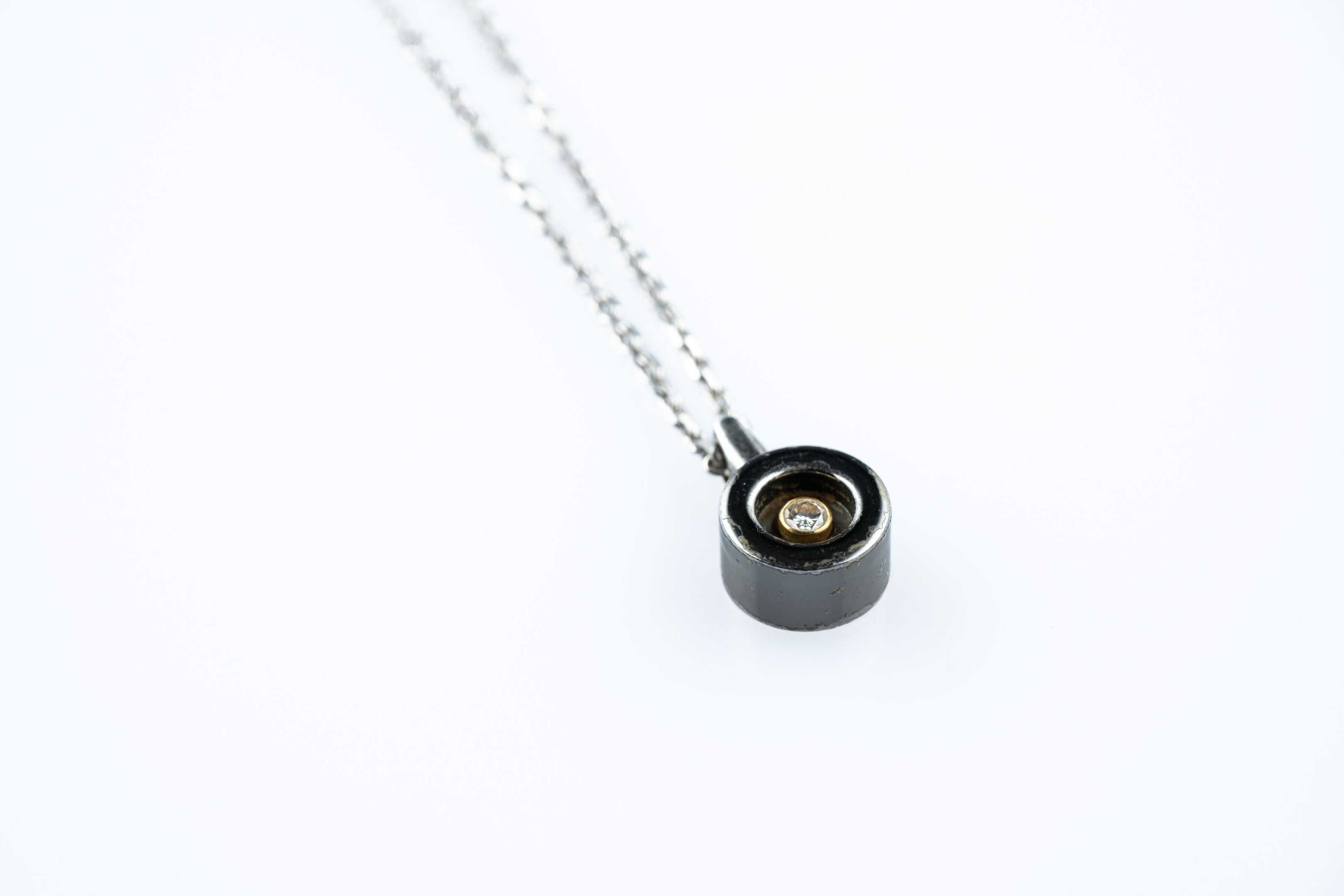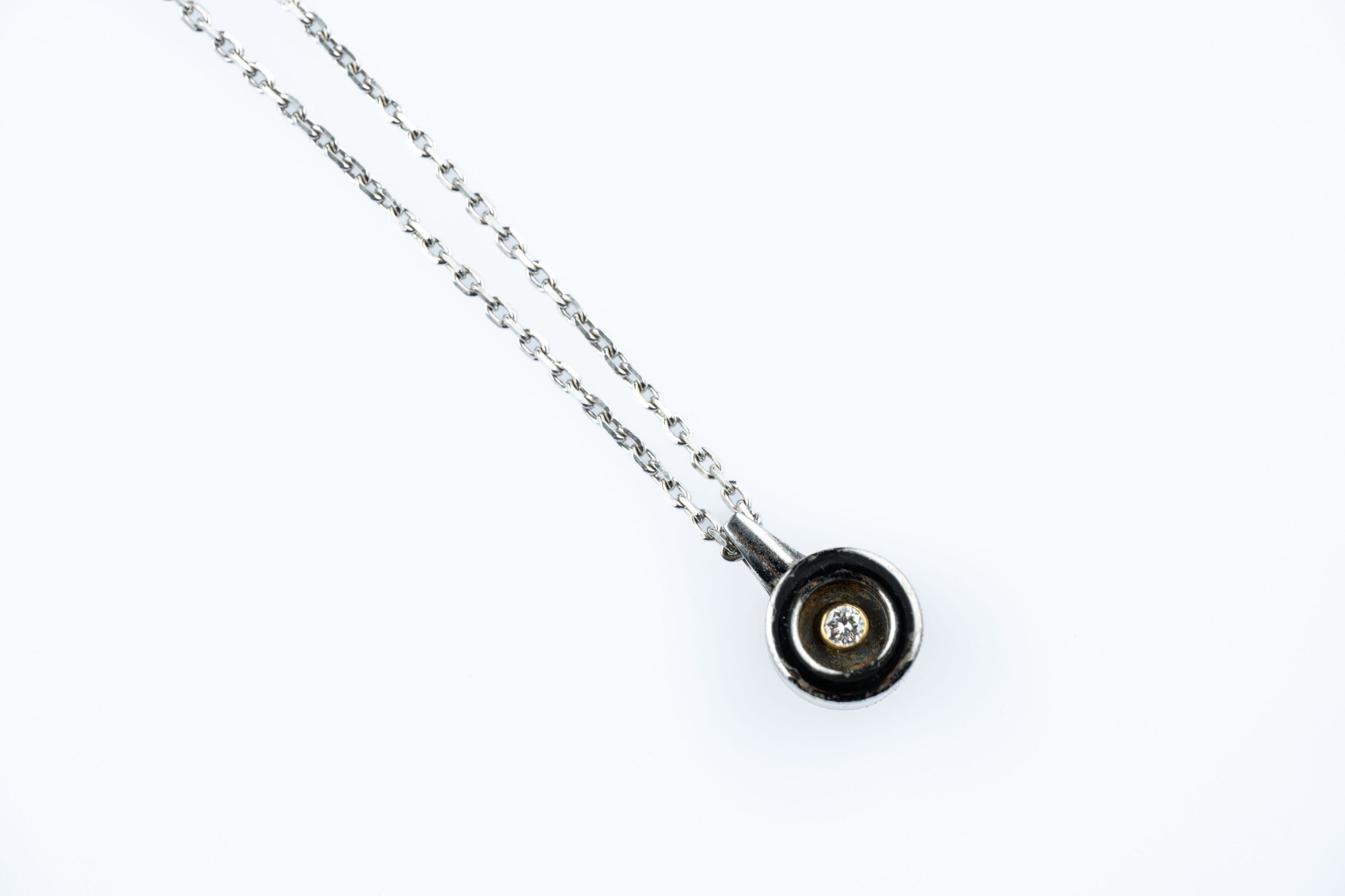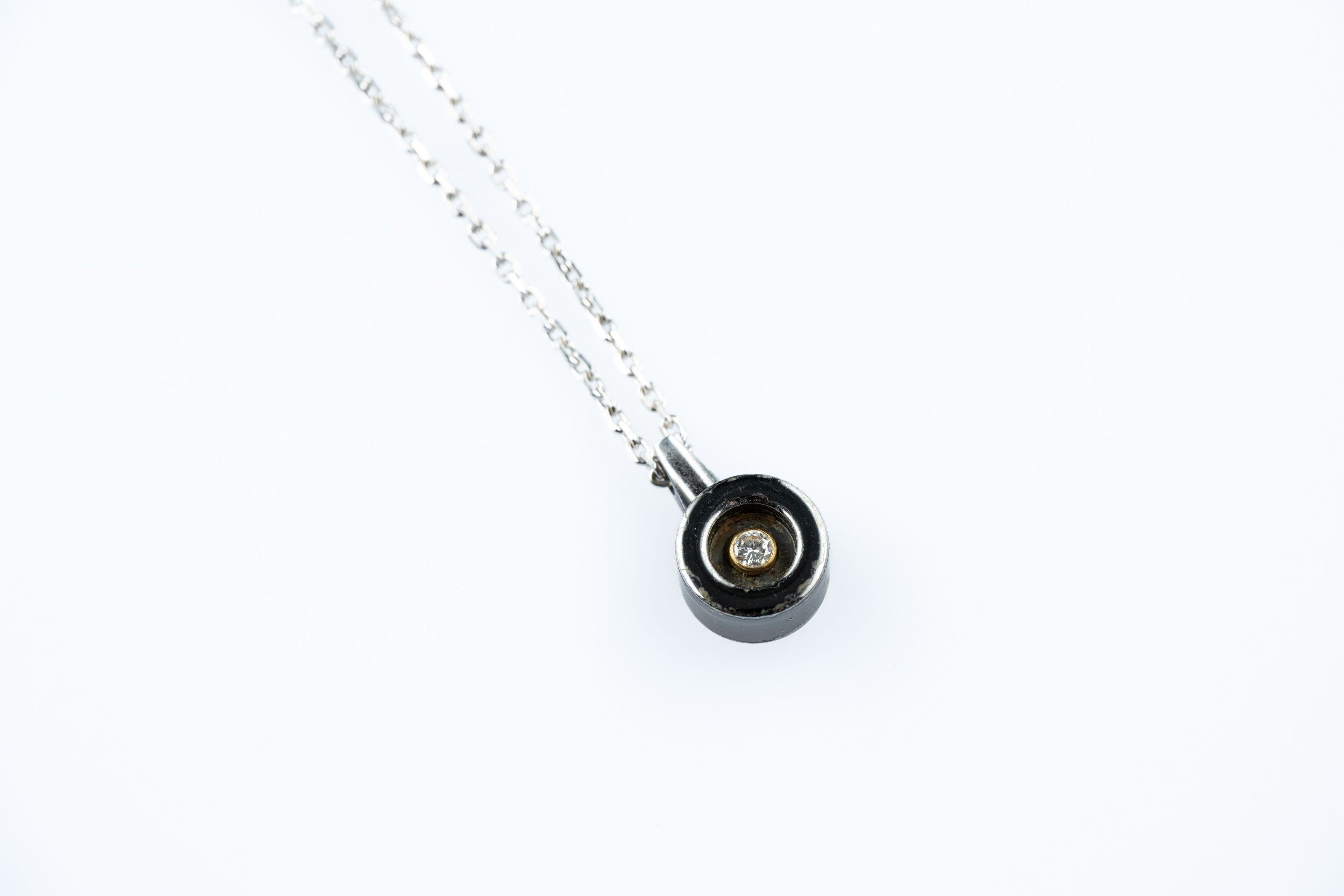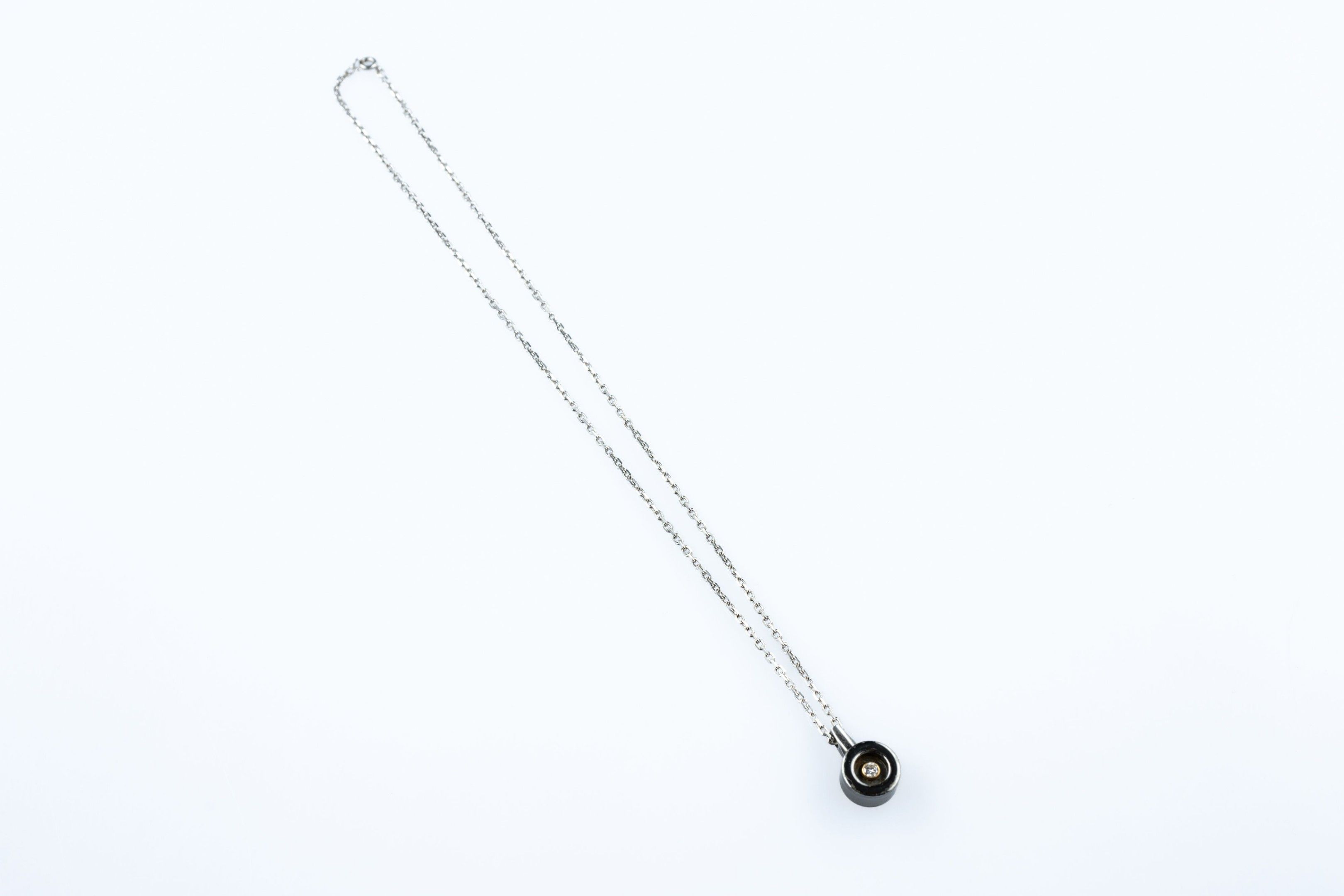 18k (750 thousandths) white gold forçat chain holding a circular blackened metal pendant set with a round diamond.