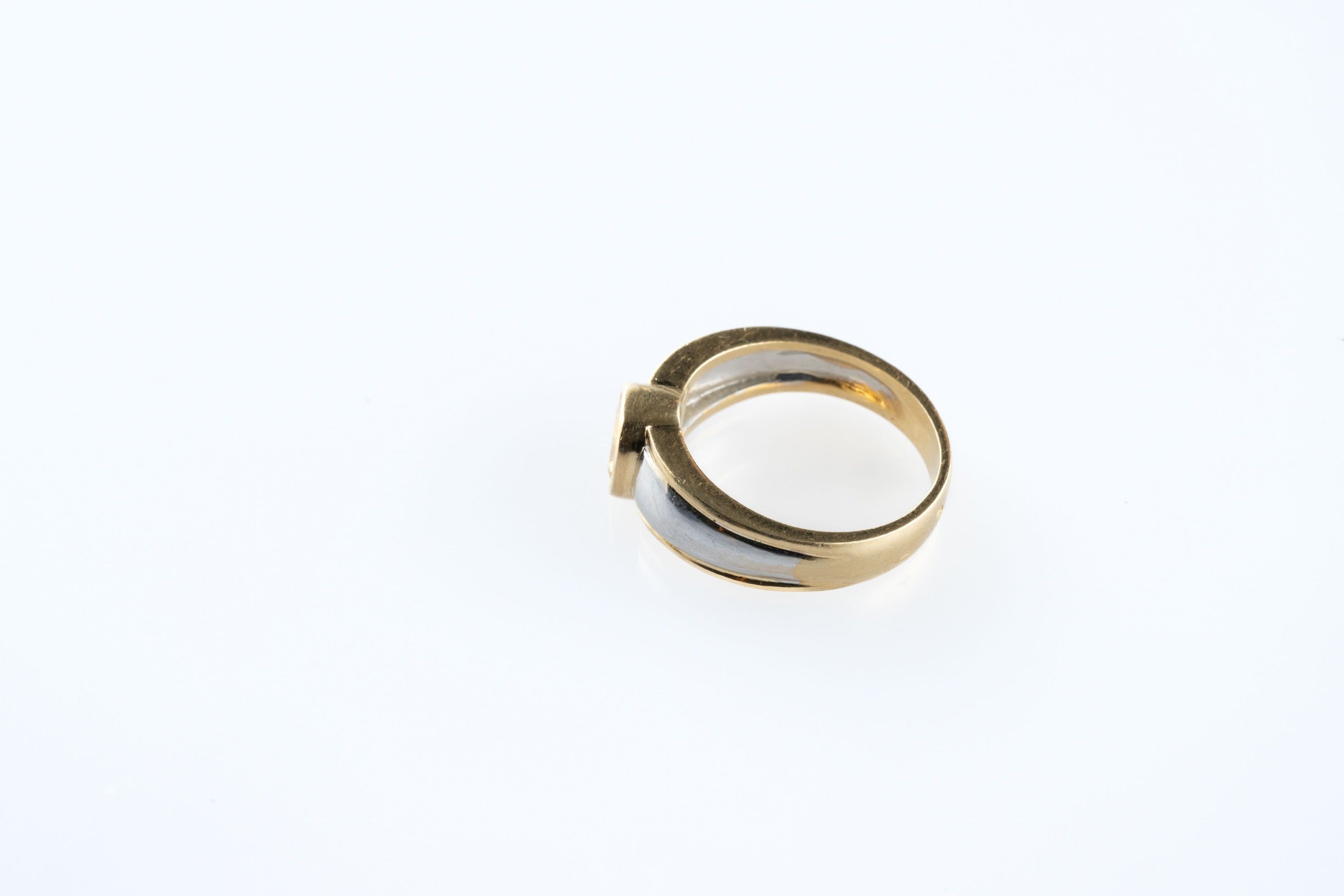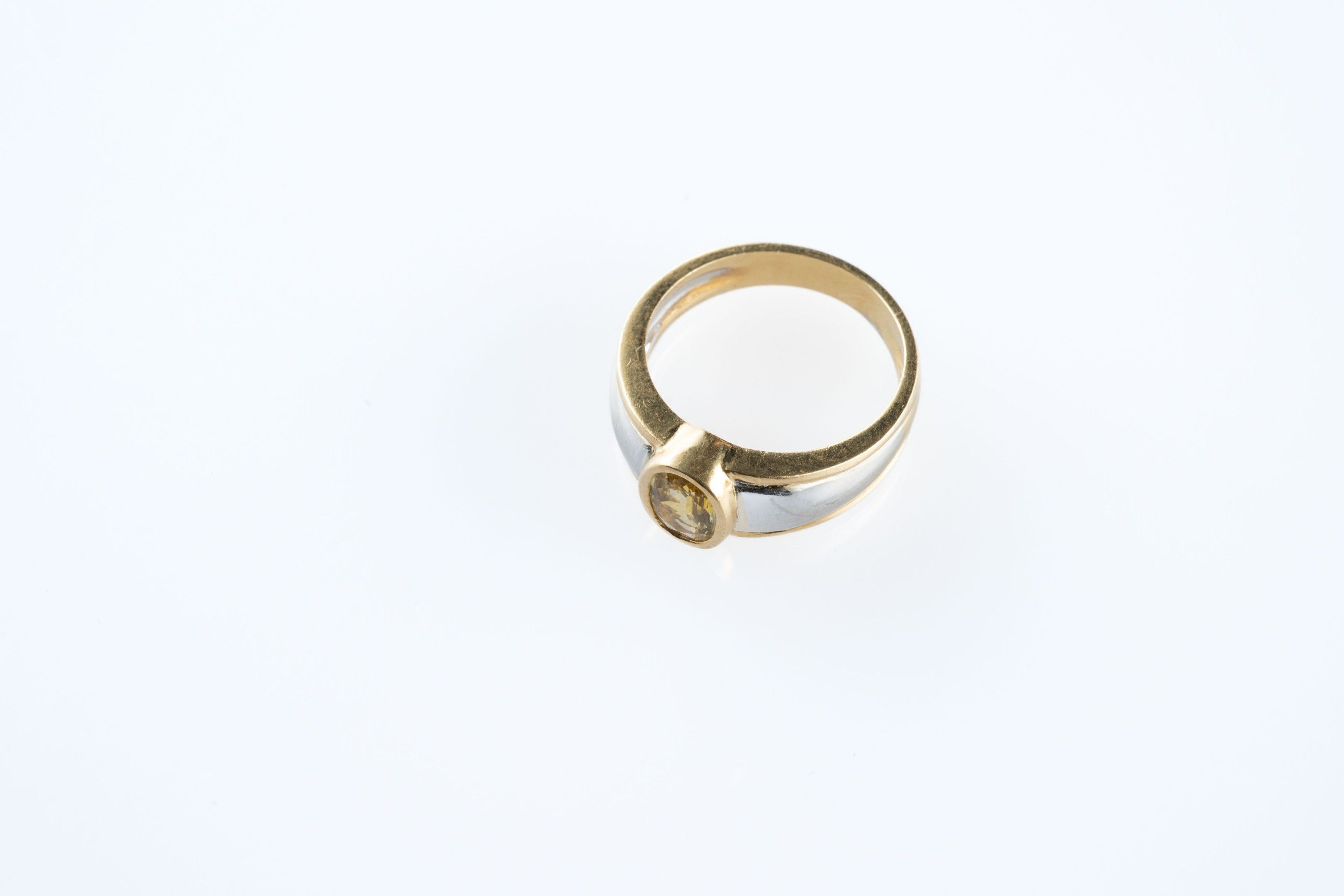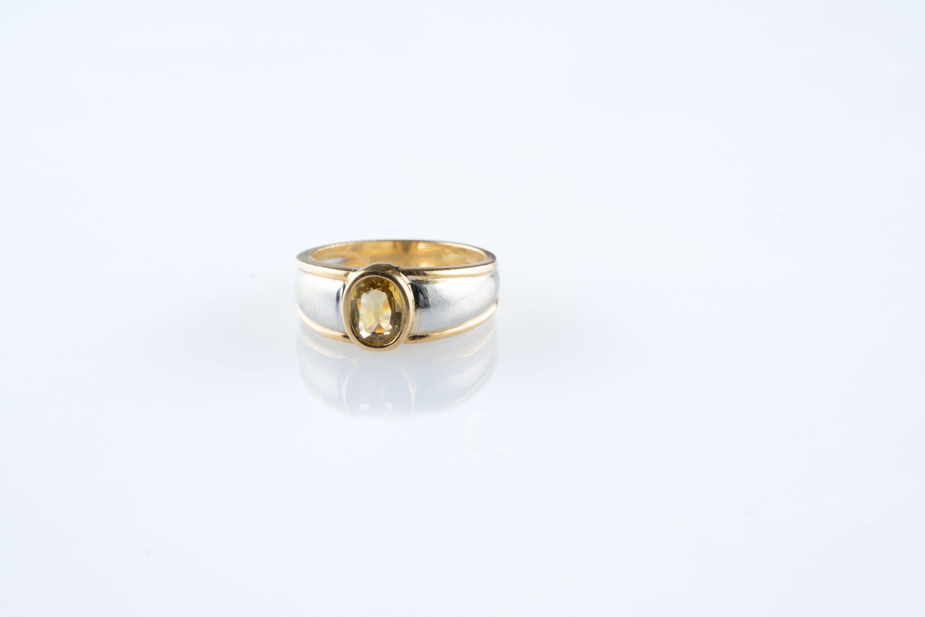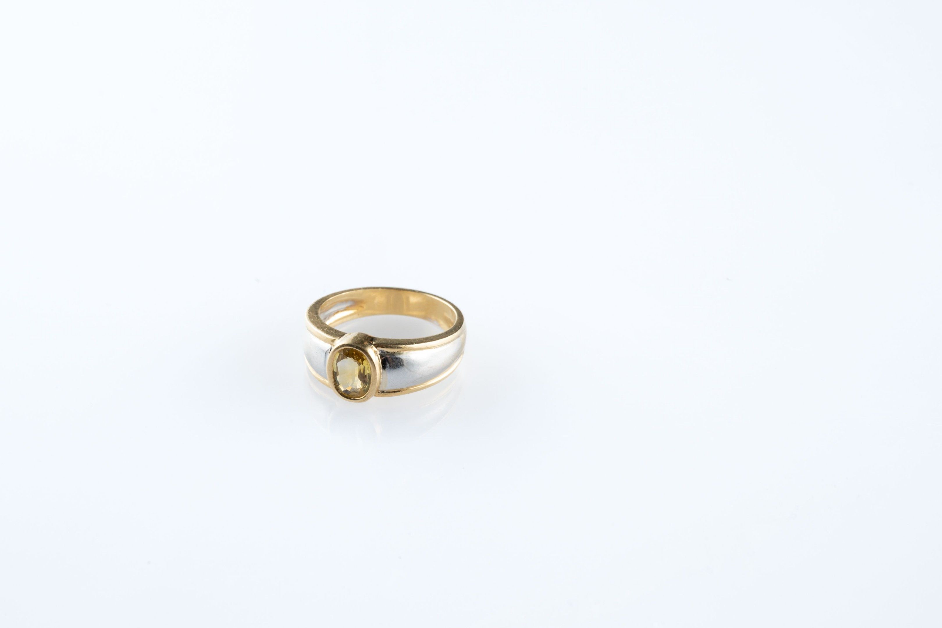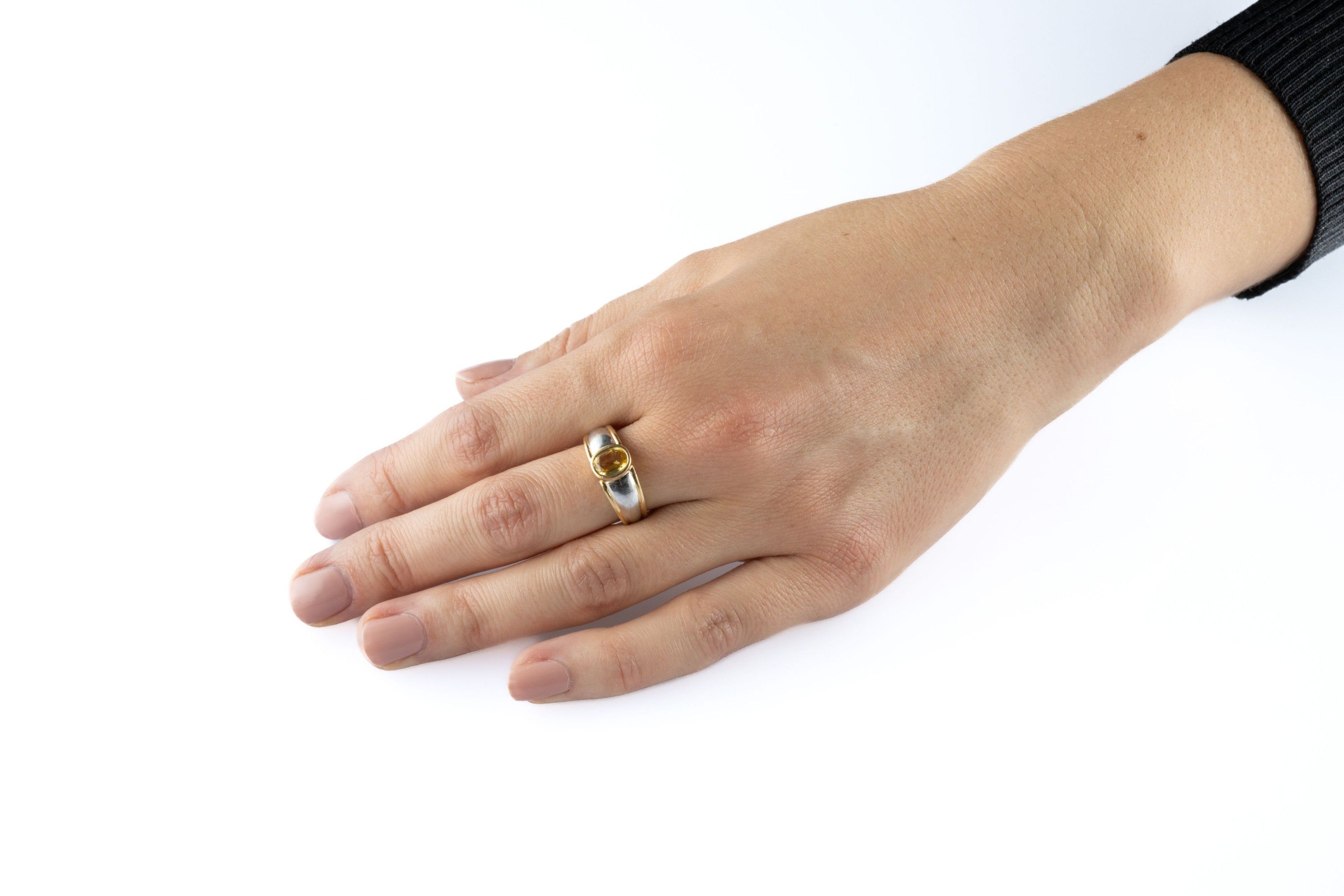 18k (750 thousandths) yellow and white gold ring set with an oval faceted yellow quartz.