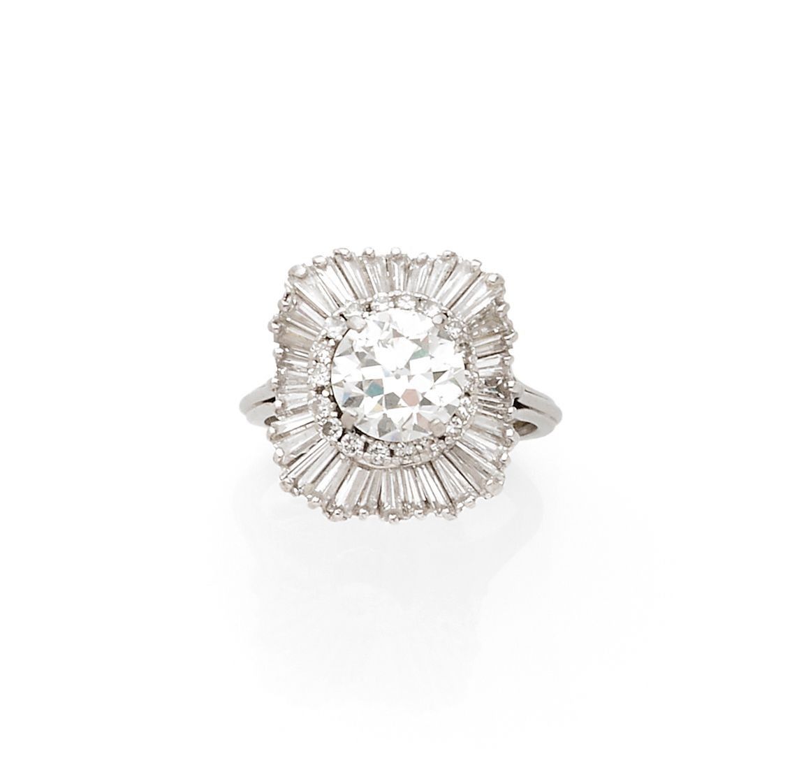 850 thousandth platinum ring set in the centre with a round old-cut diamond in a setting of small round brilliant-cut diamonds and rectangular or square diamonds.