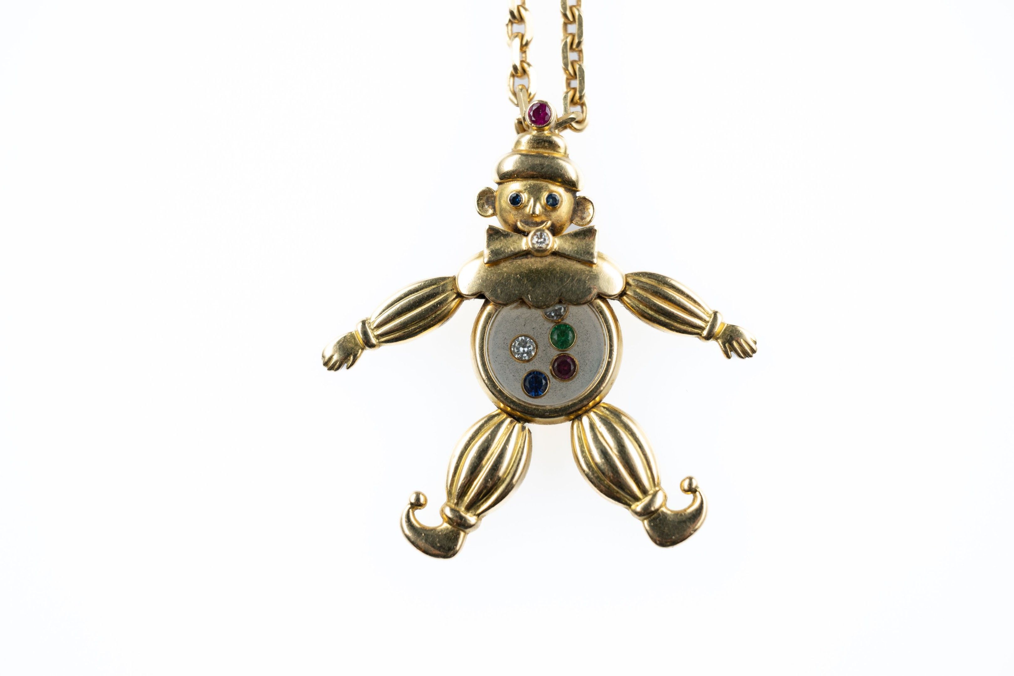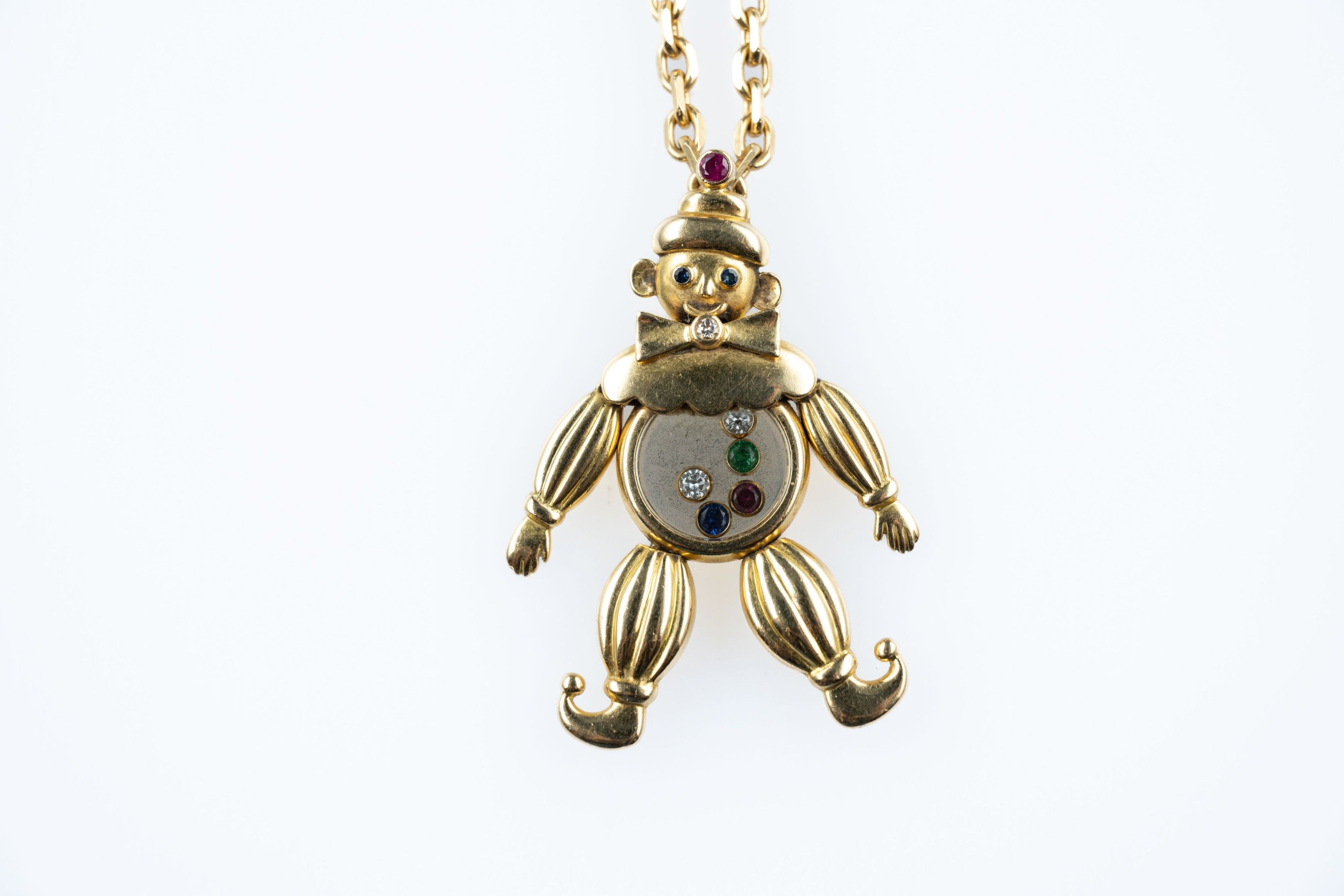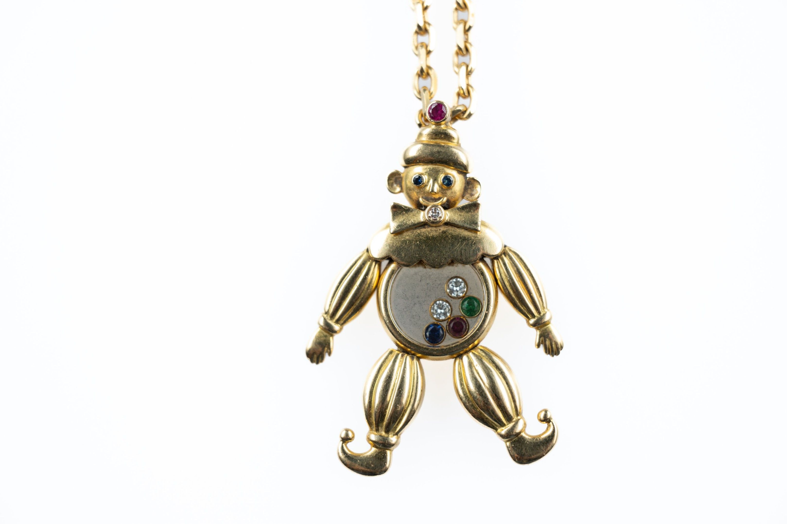 Pendant in 18k (750 thousandths) yellow gold "Happy Clown" model from the "Happy Diamond" collection, articulated and set with coloured stones, five of which are mobile. Signed.