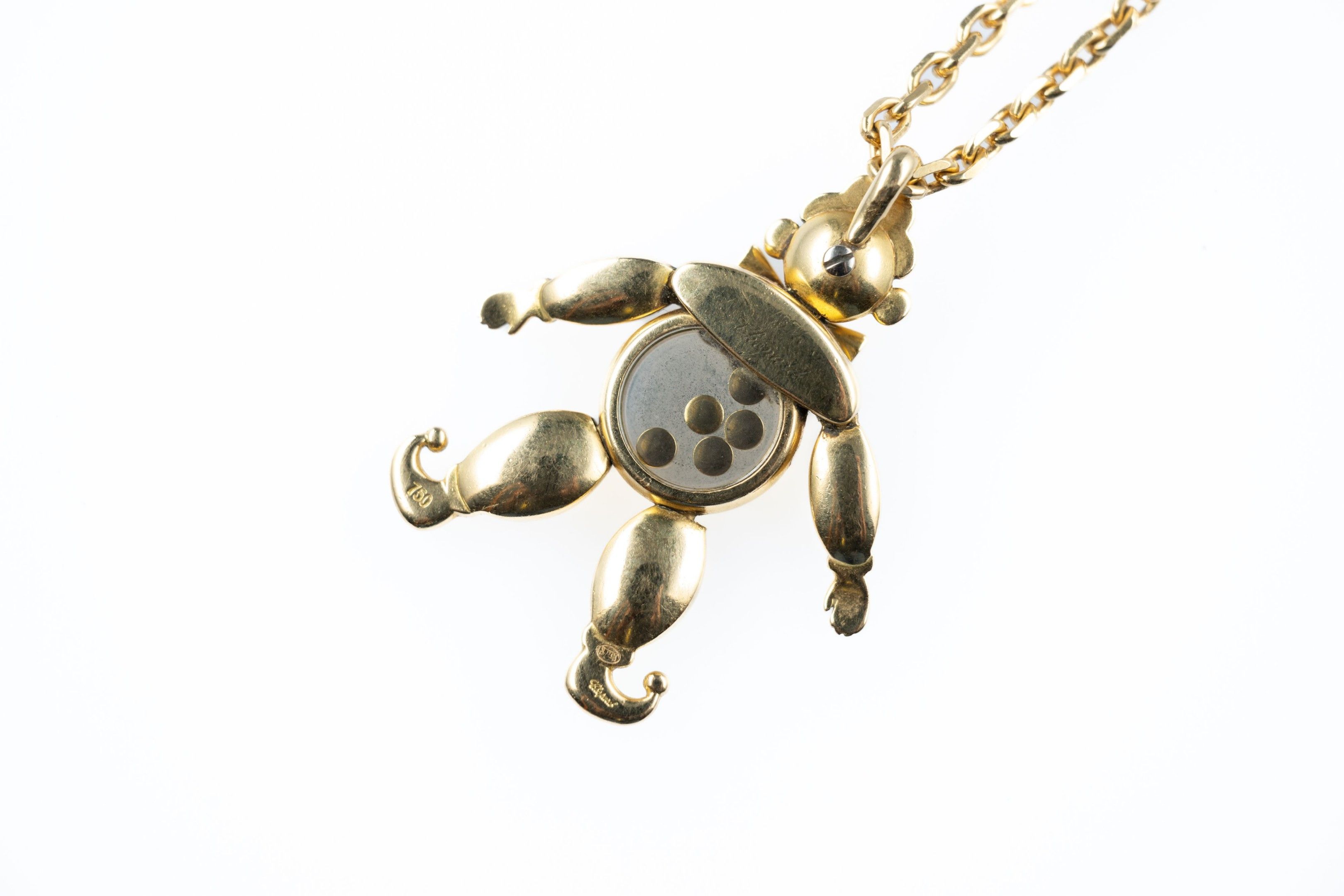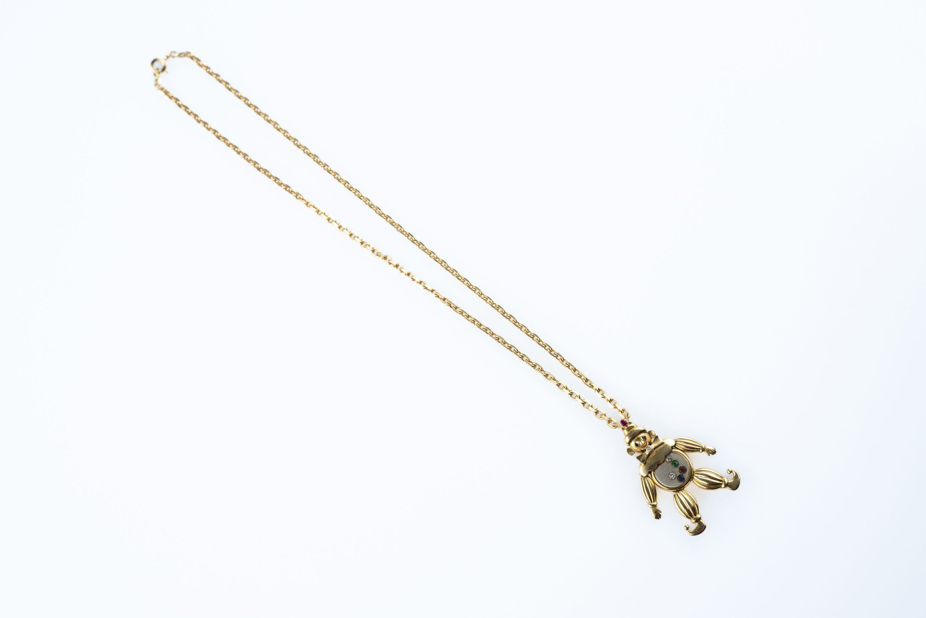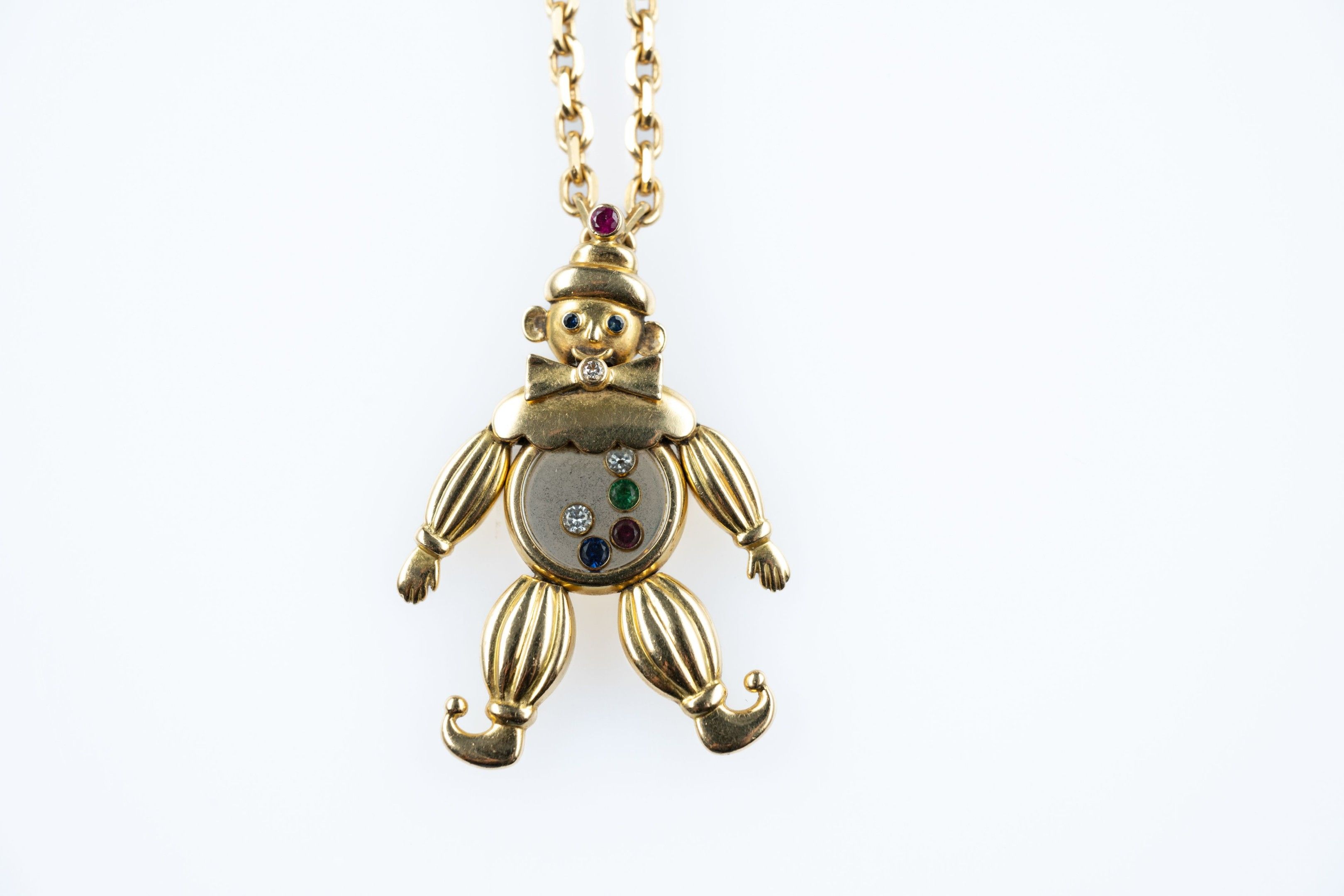Pendant in 18k (750 thousandths) yellow gold "Happy Clown" model from the "Happy Diamond" collection, articulated and set with coloured stones, five of which are mobile. Signed.