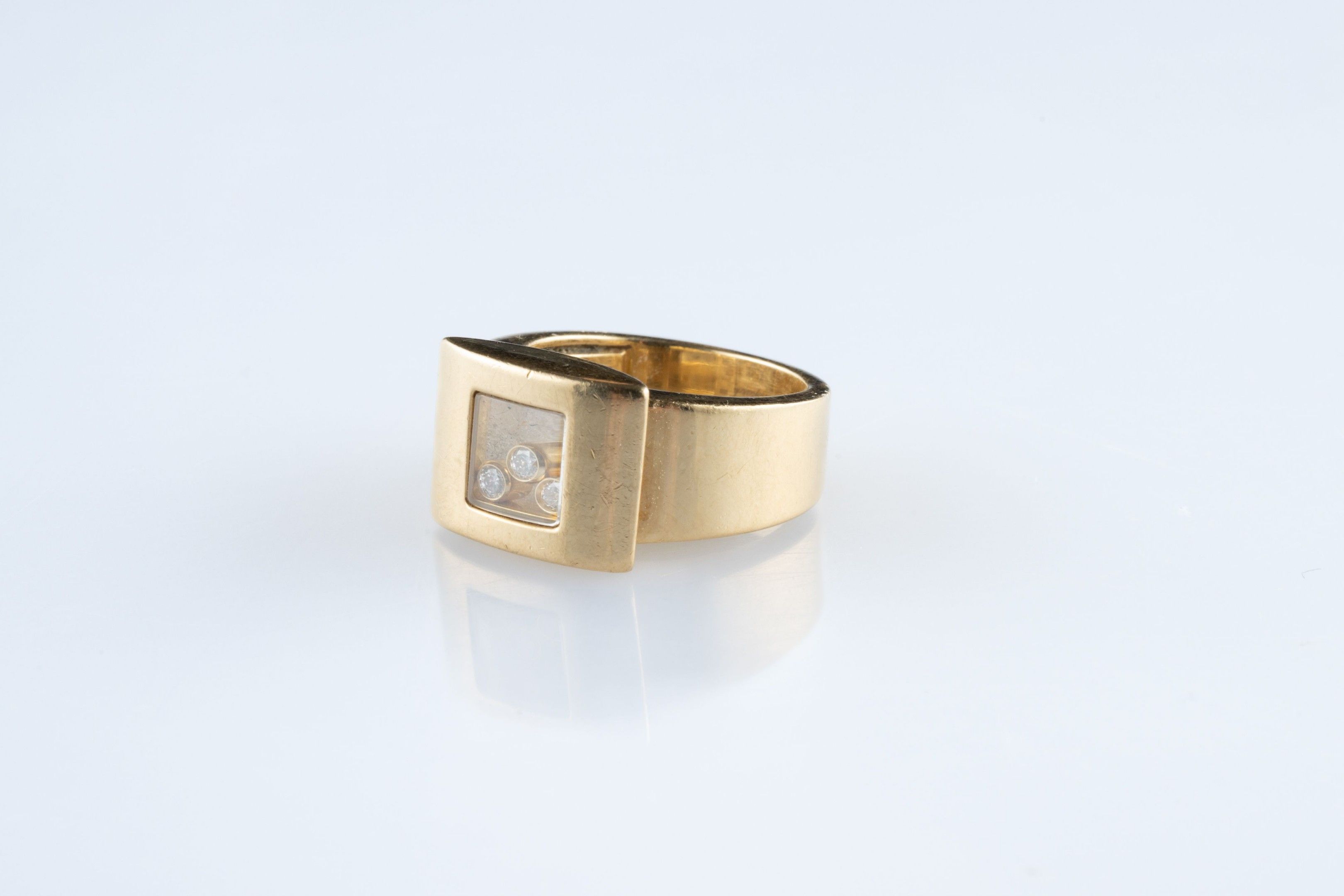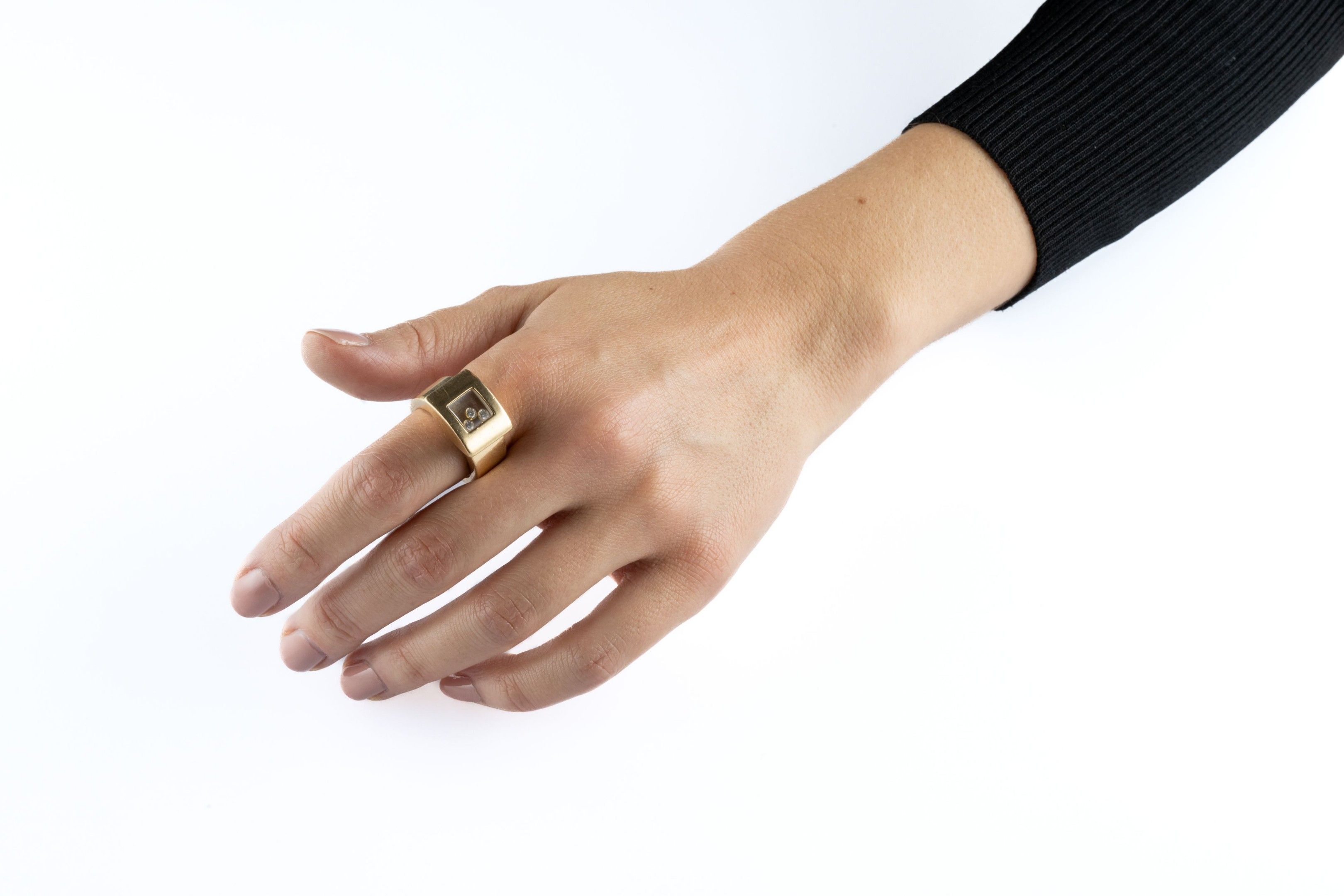 Happy Diamond" model band ring in 18k (750 thousandths) yellow gold, the square navette bezel enclosing three mobile diamonds. Signed and numbered.