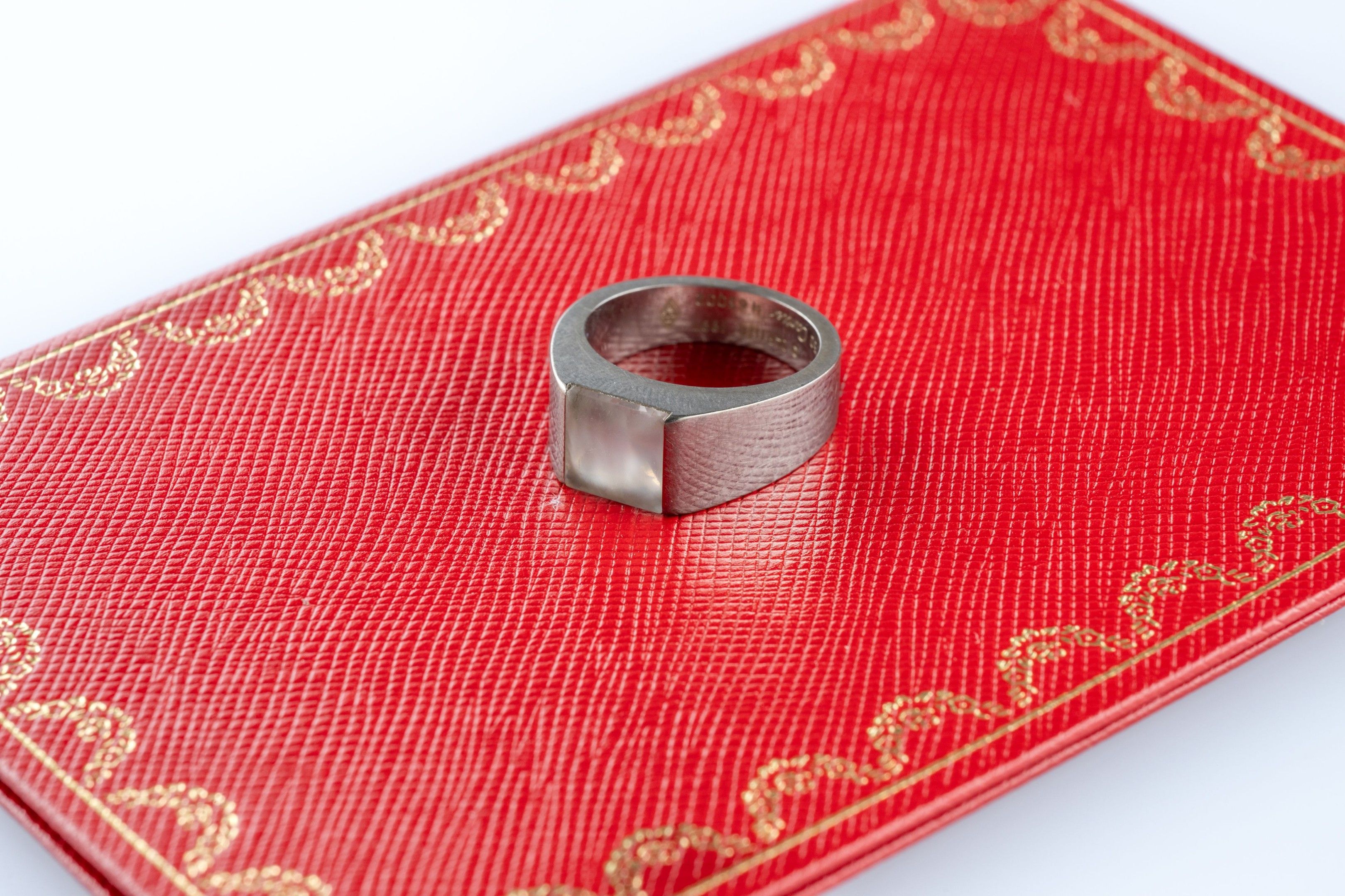 Tank" model ring in 18k (750 thousandths) white gold set with a square suiffée moonstone. Signed, numbered and dated 1997.