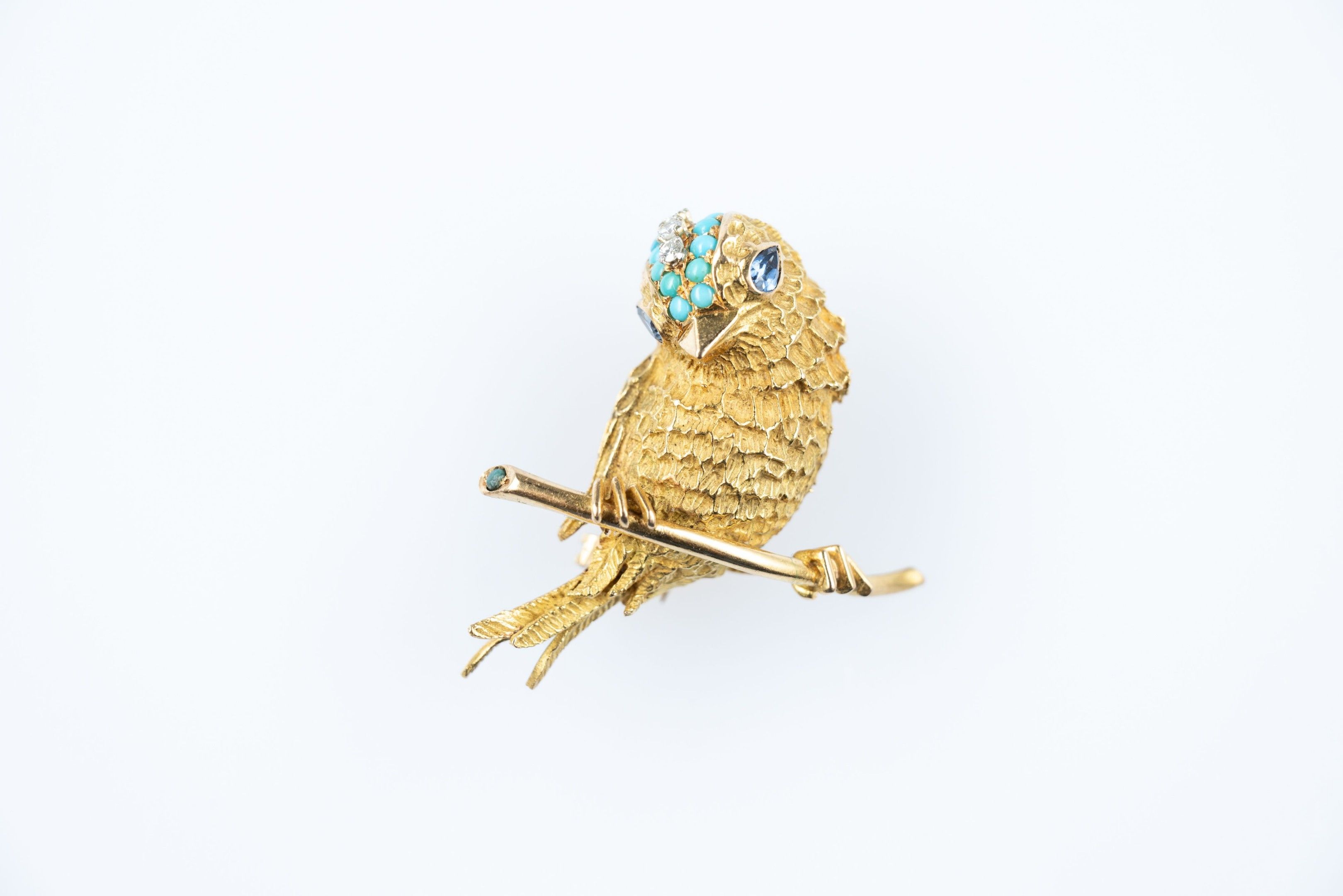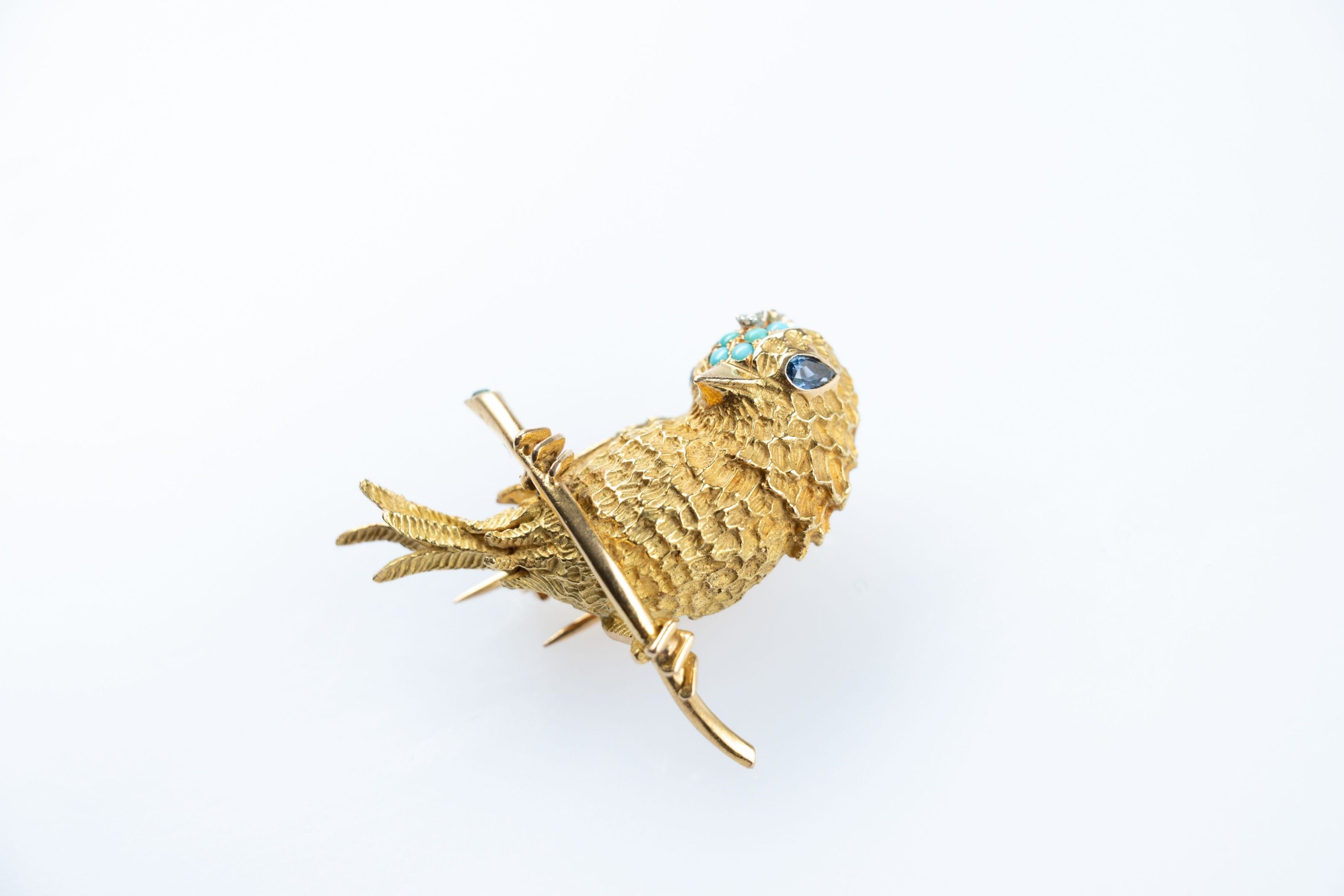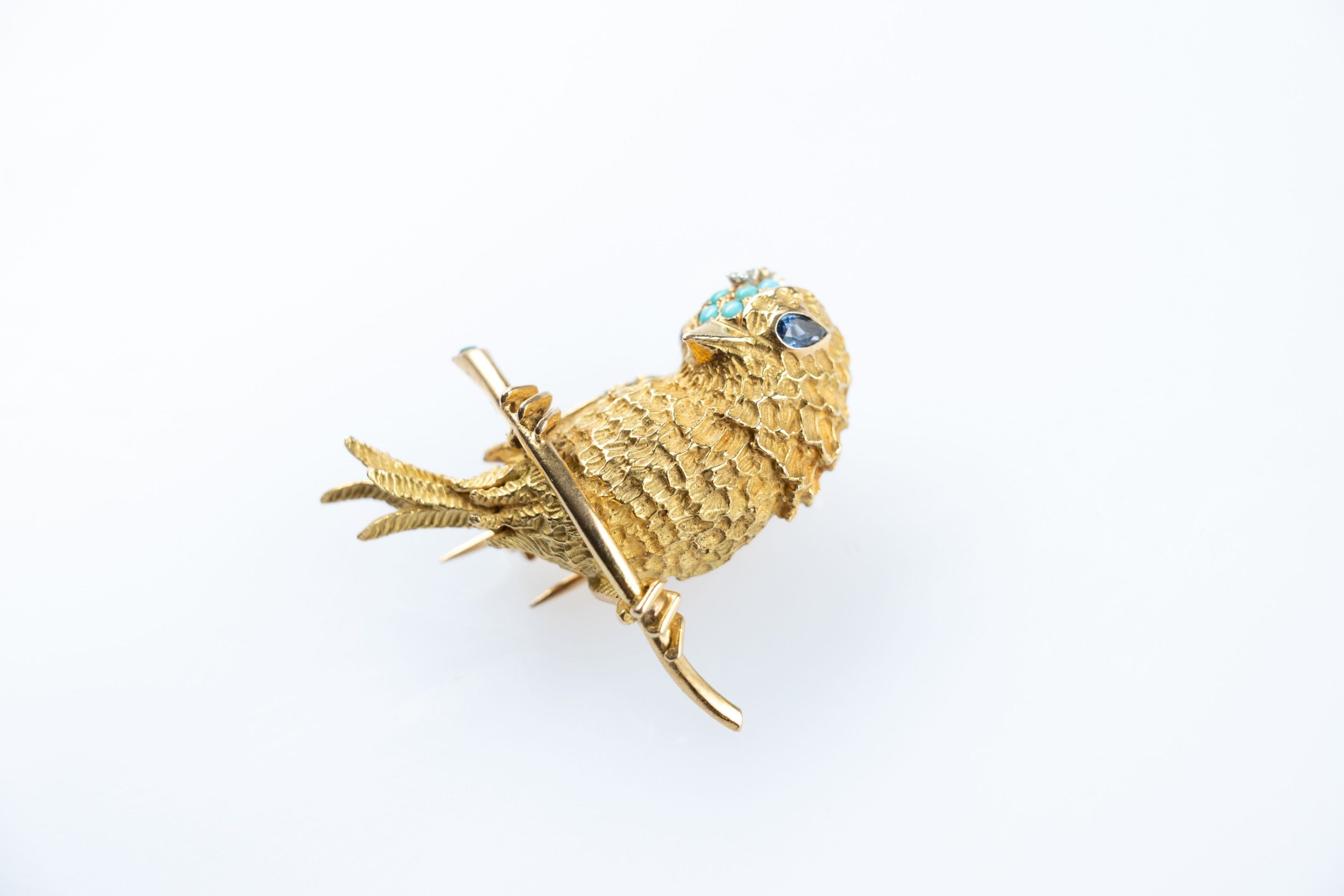 Brooch in 18k (750 thousandths) yellow gold forming a trendy bird, the head scratched with small diamonds set with turquoise cabochons, the eyes set with drop sapphires.