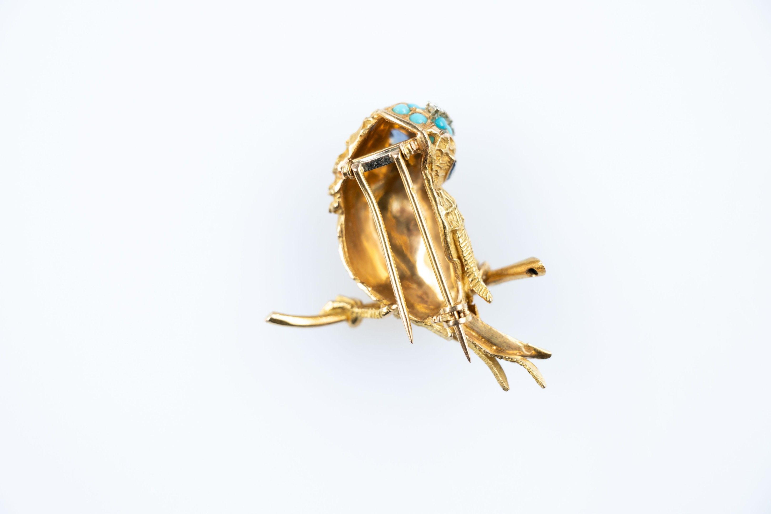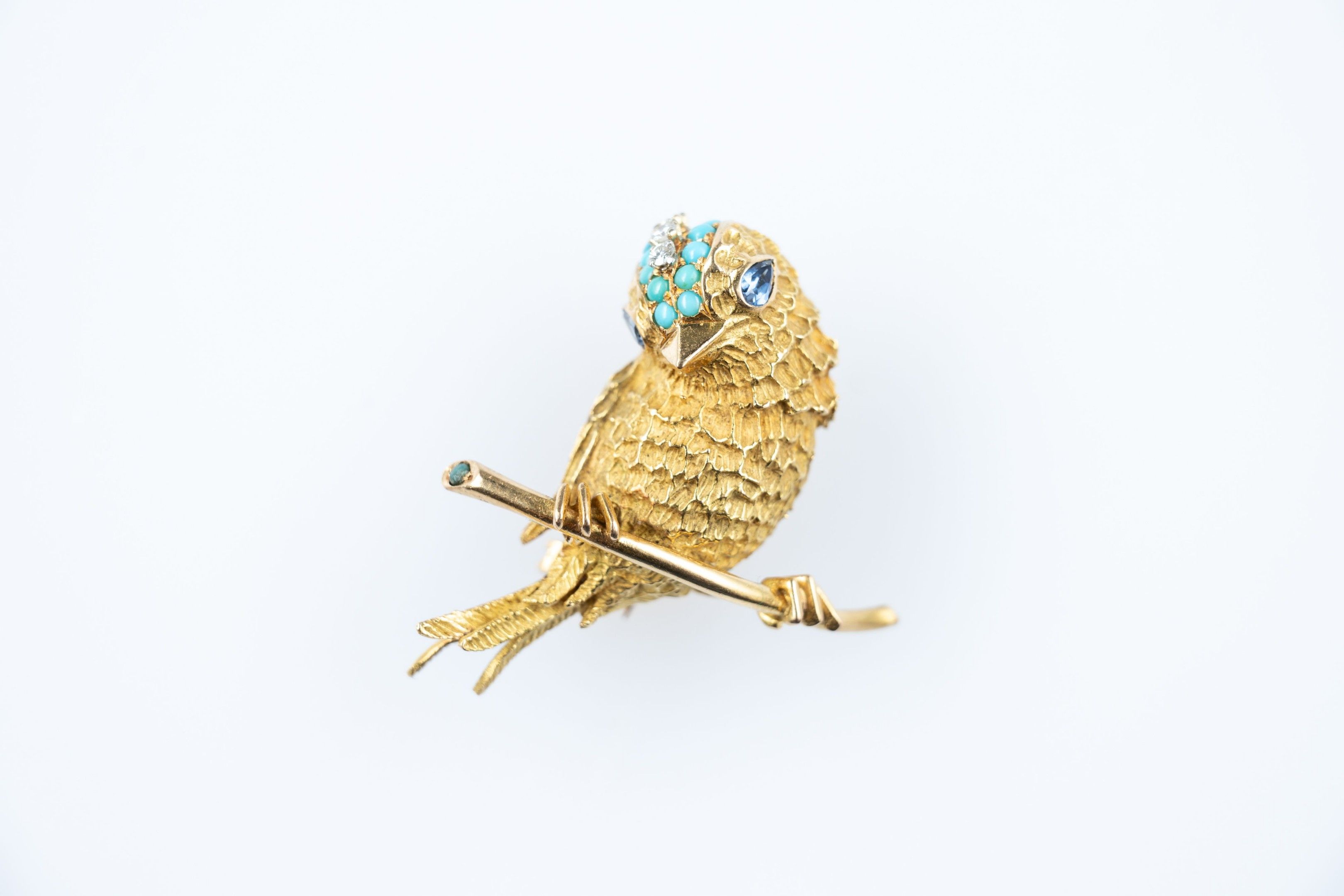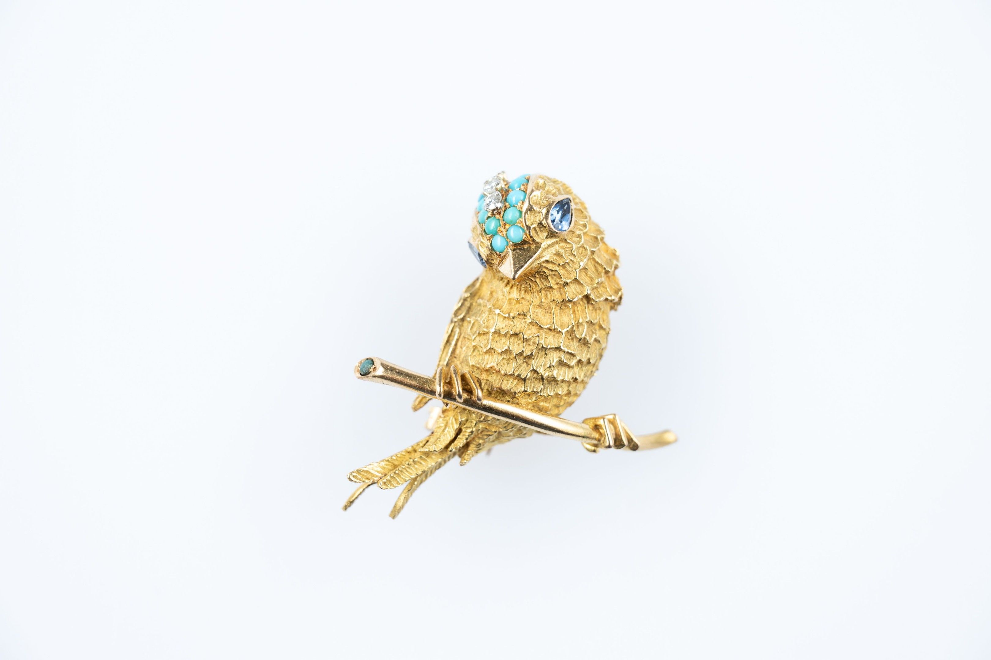Brooch in 18k (750 thousandths) yellow gold forming a trendy bird, the head scratched with small diamonds set with turquoise cabochons, the eyes set with drop sapphires.