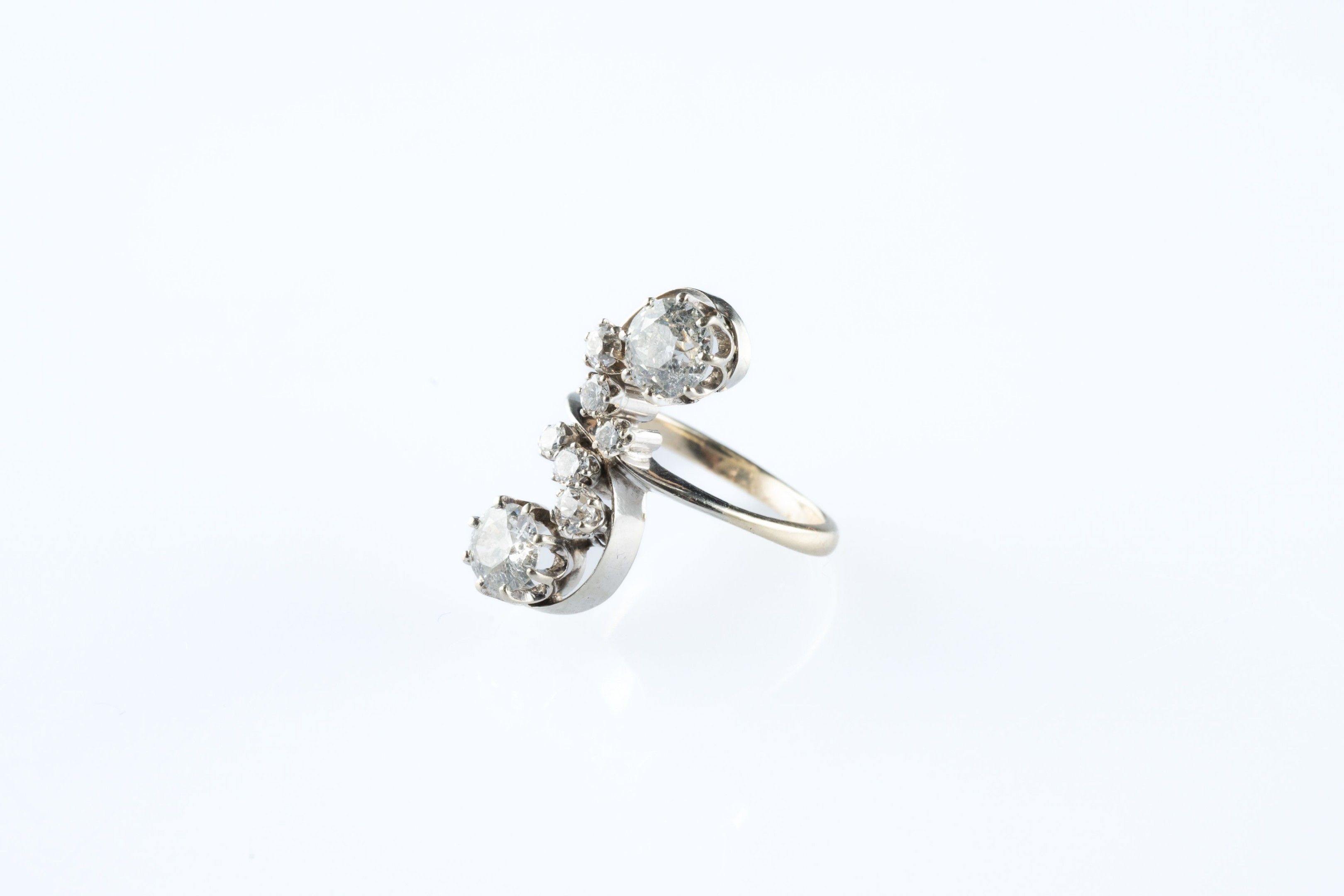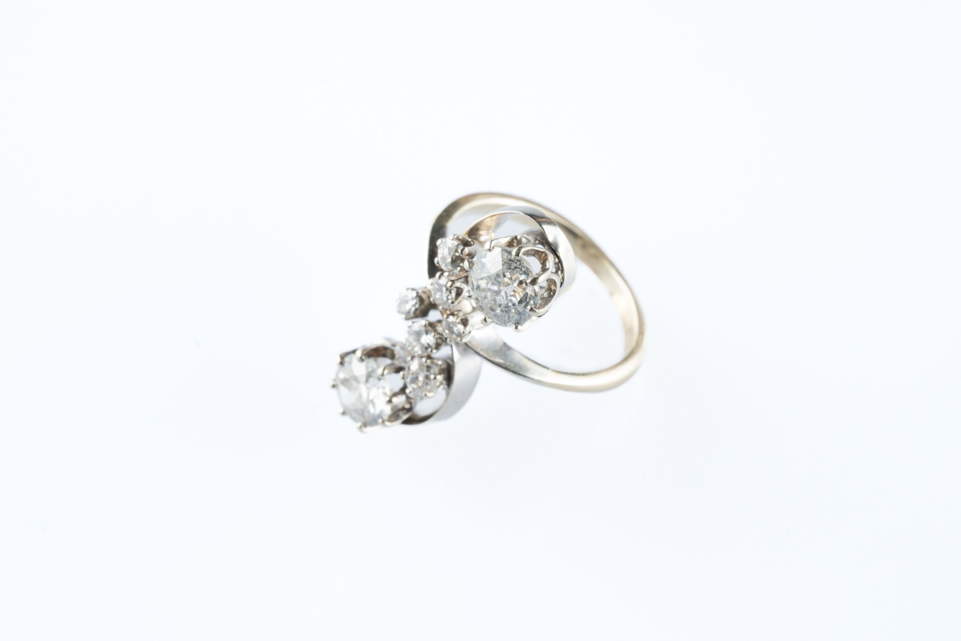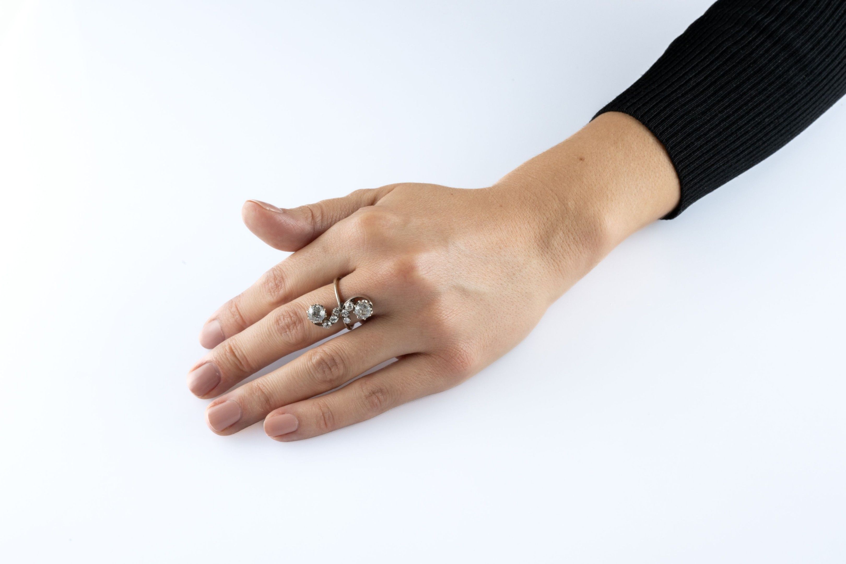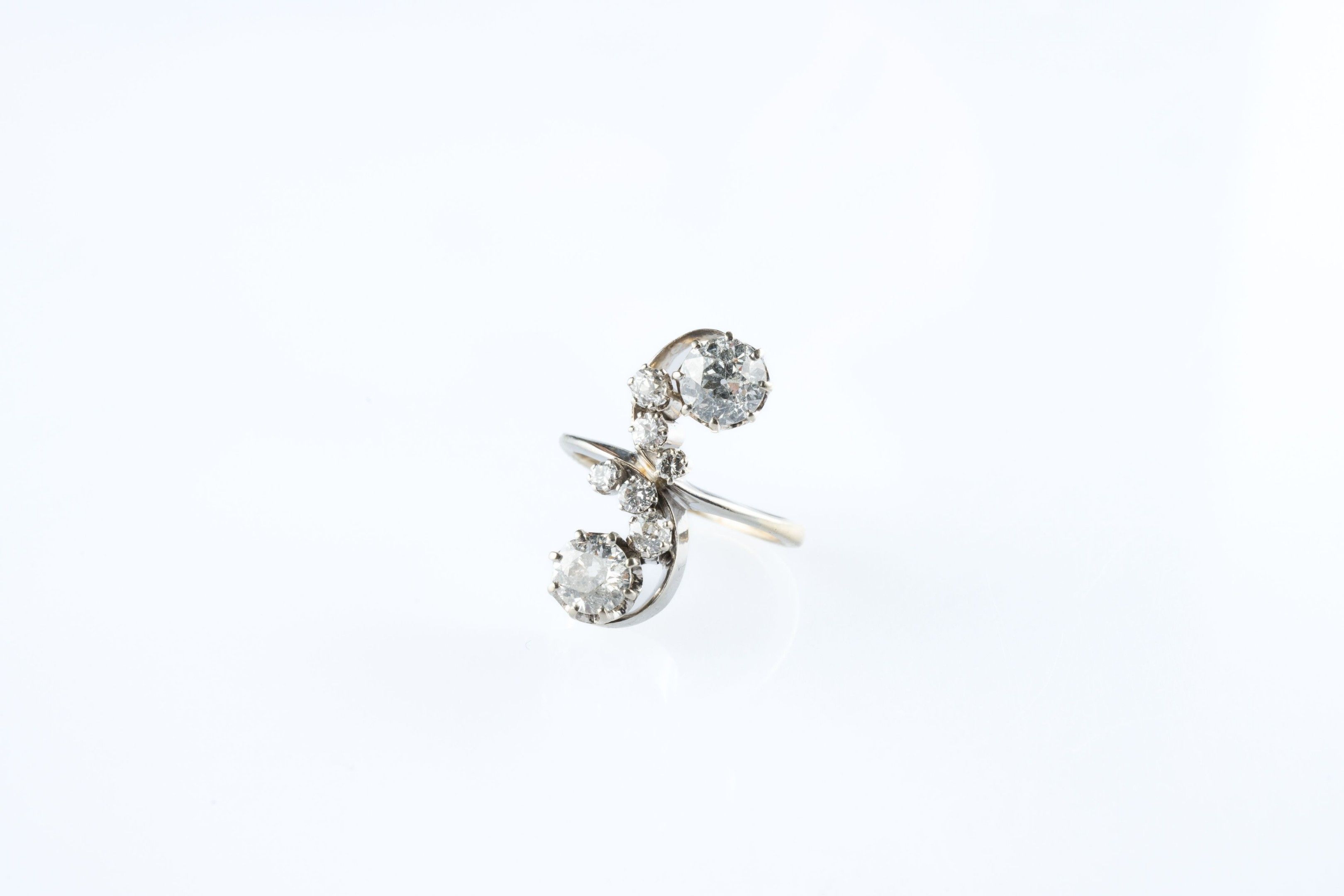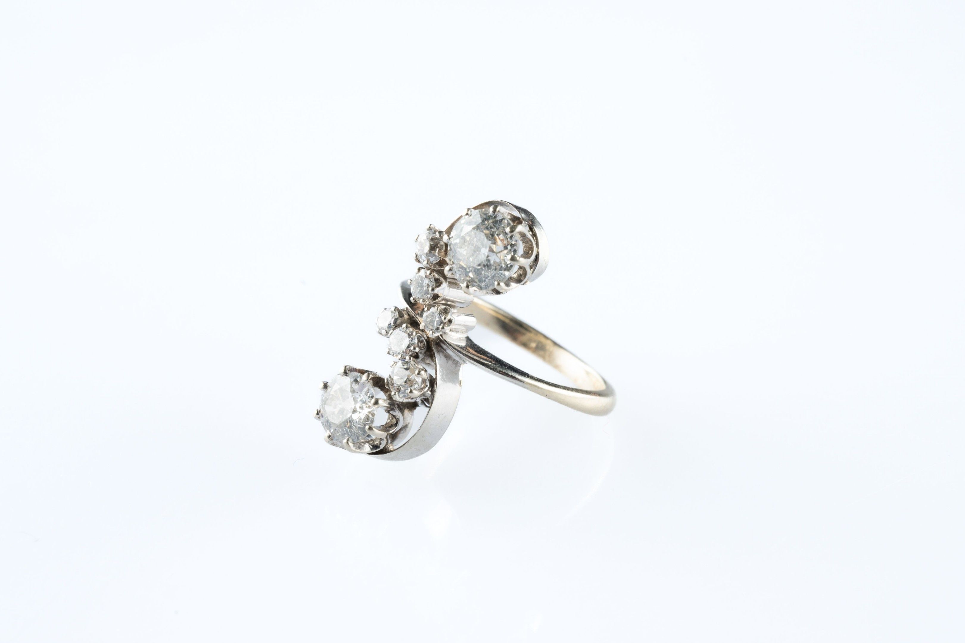 toi et moi" ring in 18k (750 thousandths) white gold set with two diamonds weighing approximately 0.6 and 0.7 ct and six smaller diamonds.