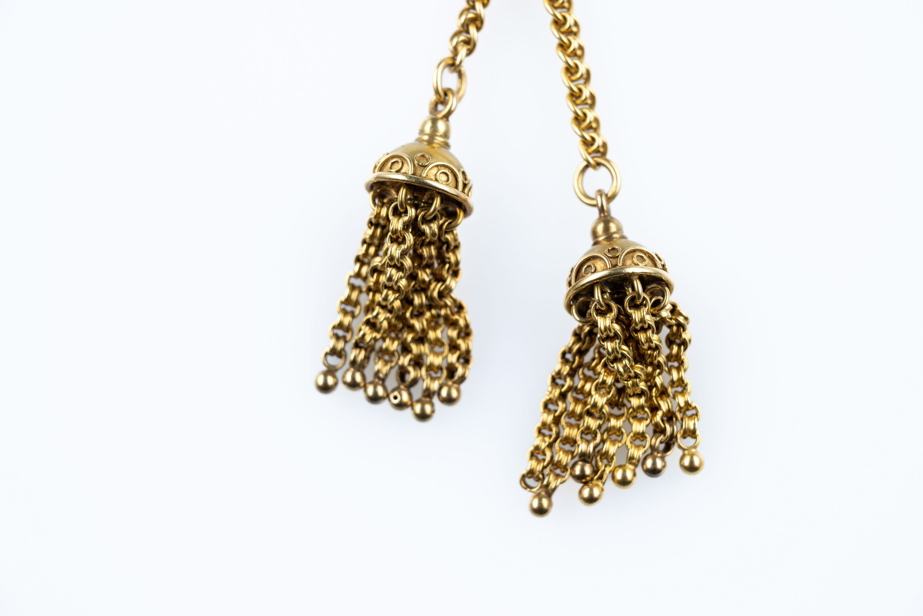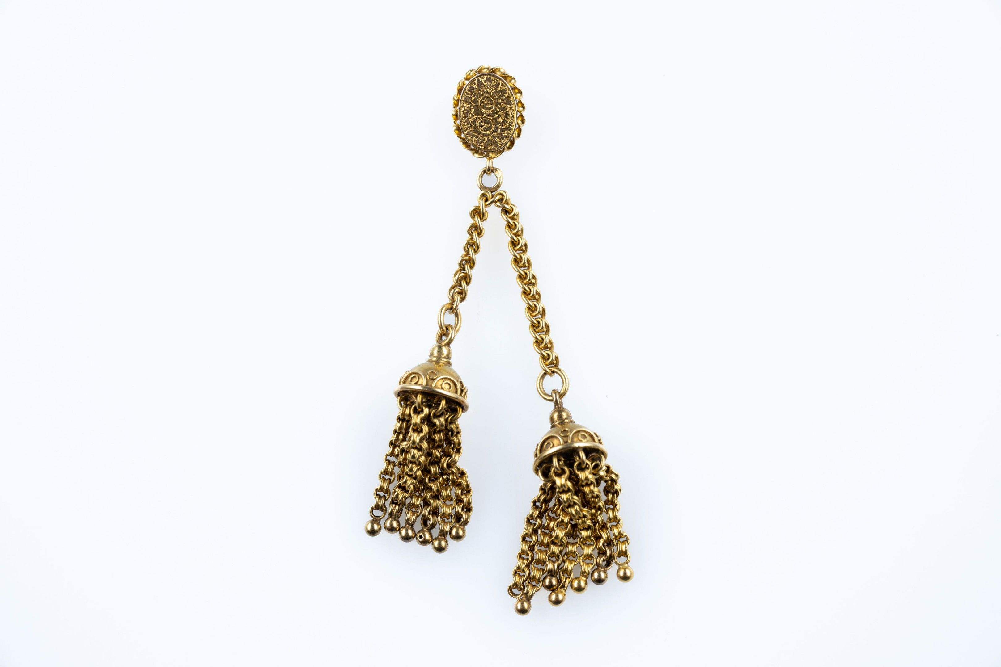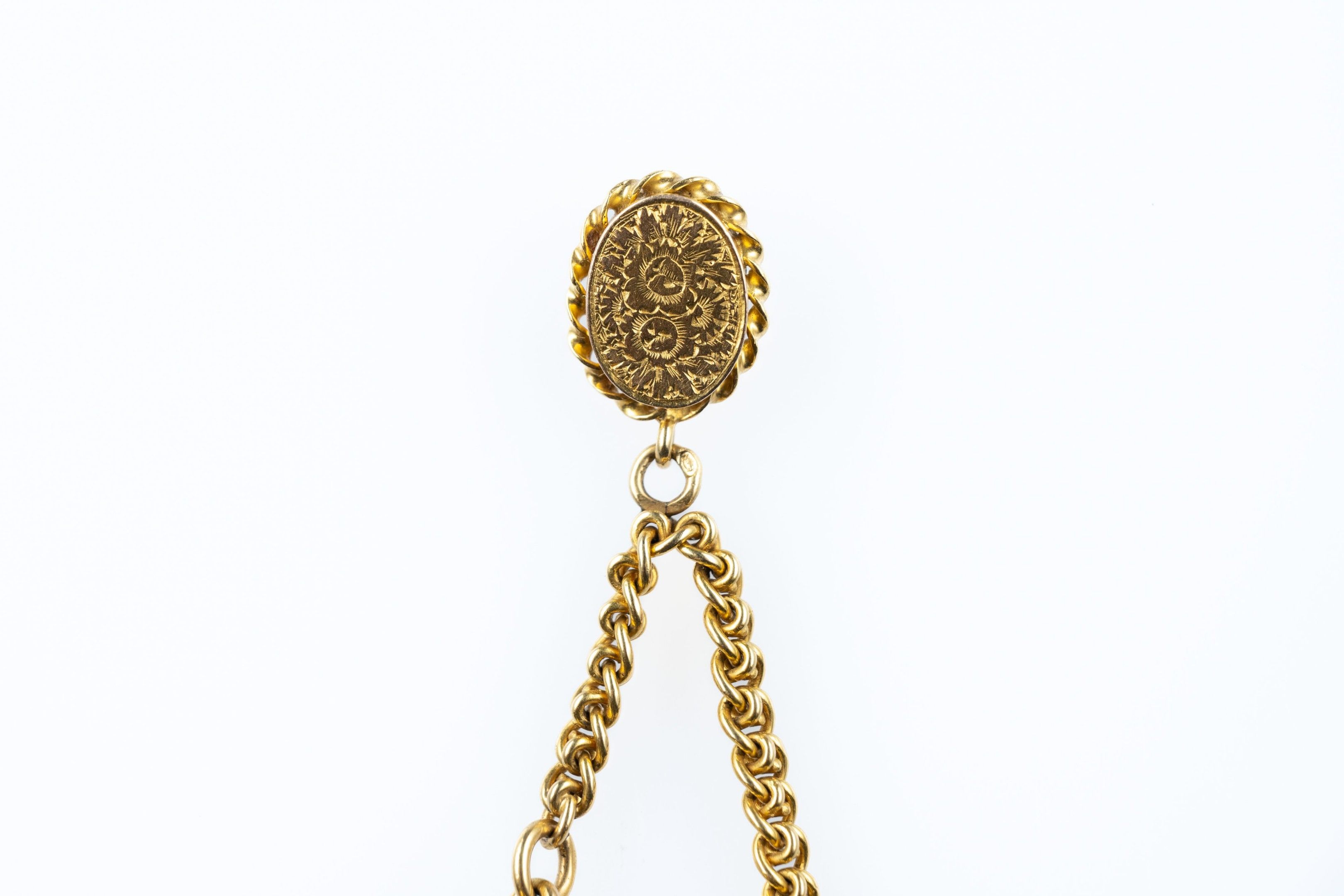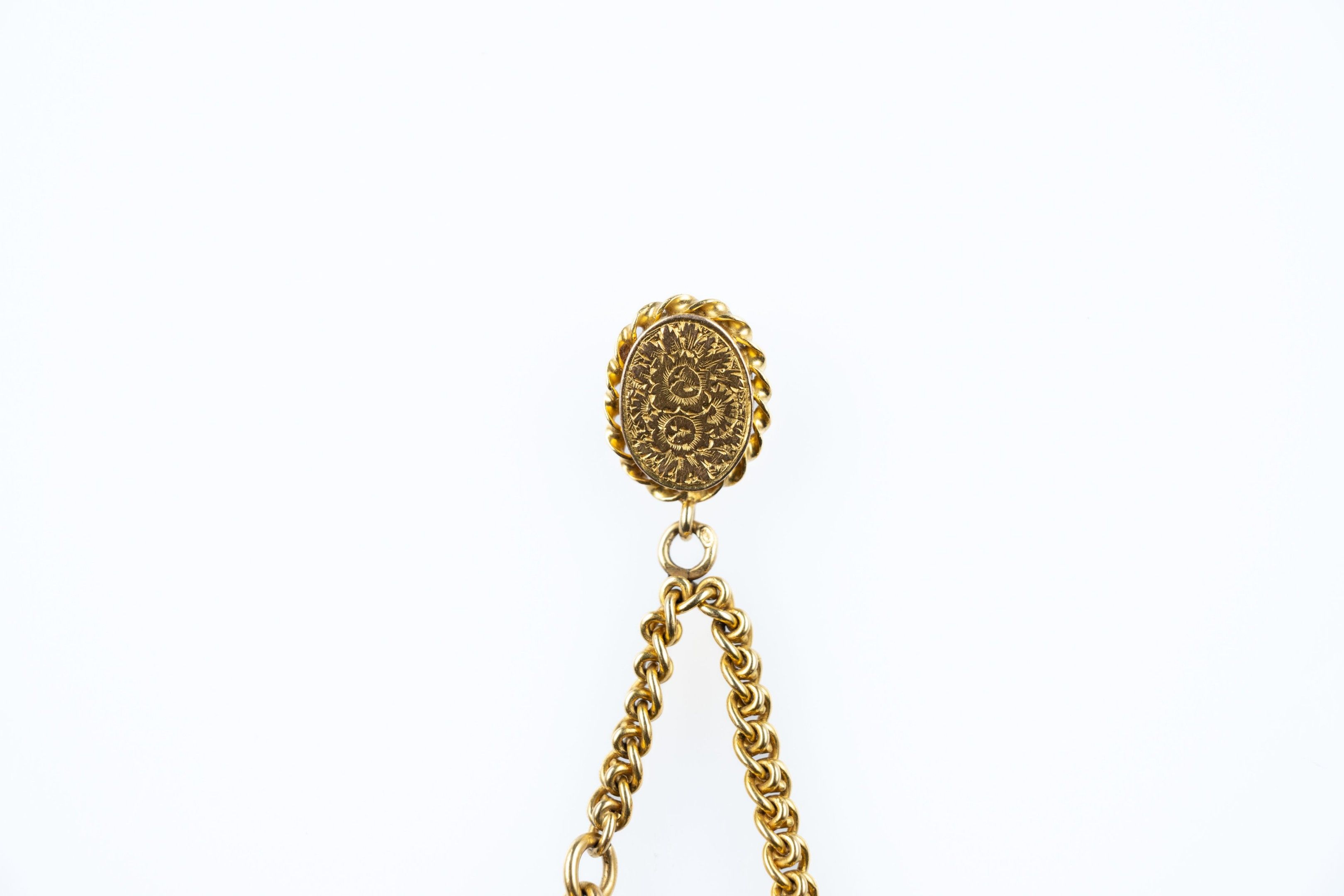 Pendant in 18k (750 thousandths) yellow gold holding two tassels, the oval platinum and its 14k (575 thousandths) yellow gold clasp.