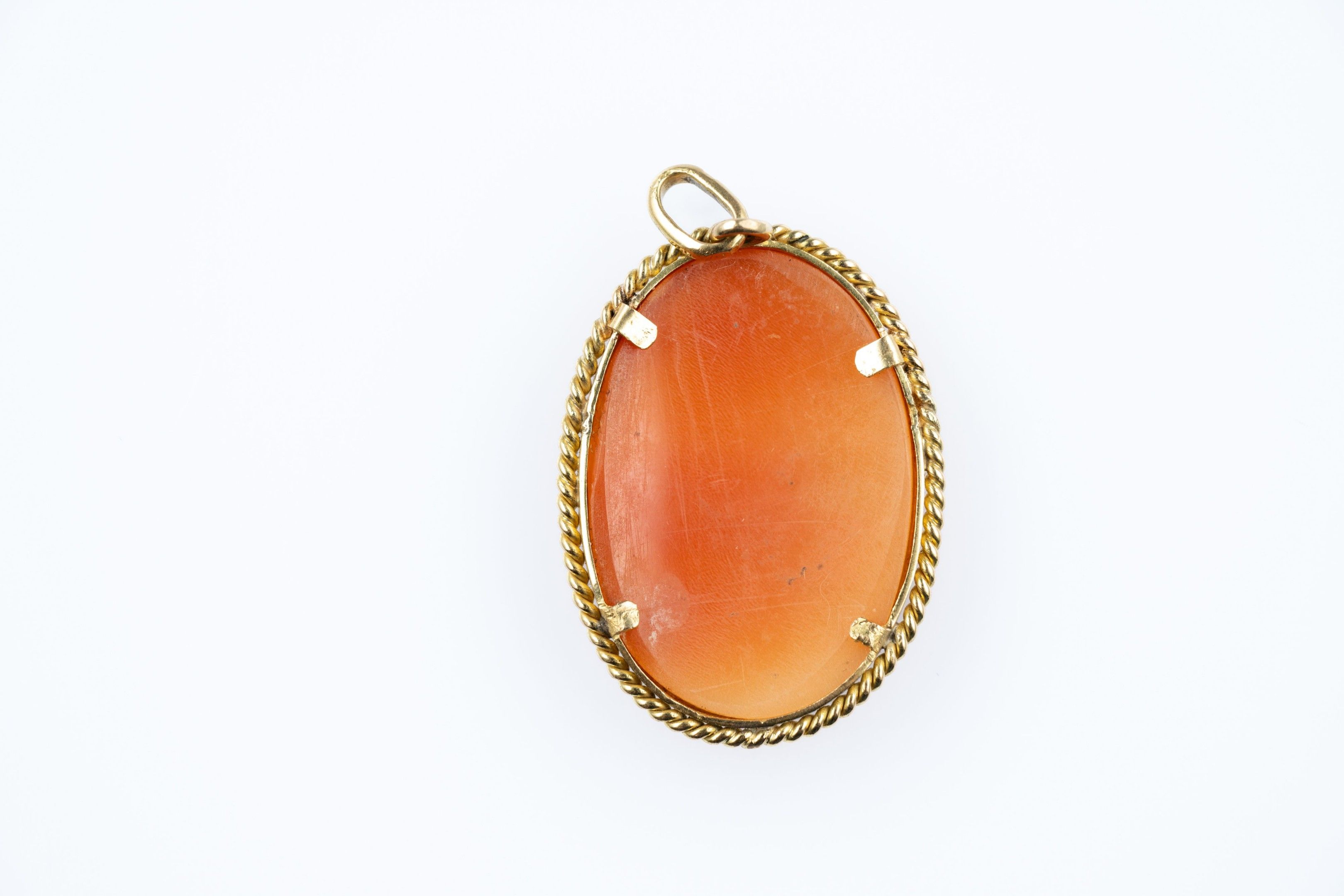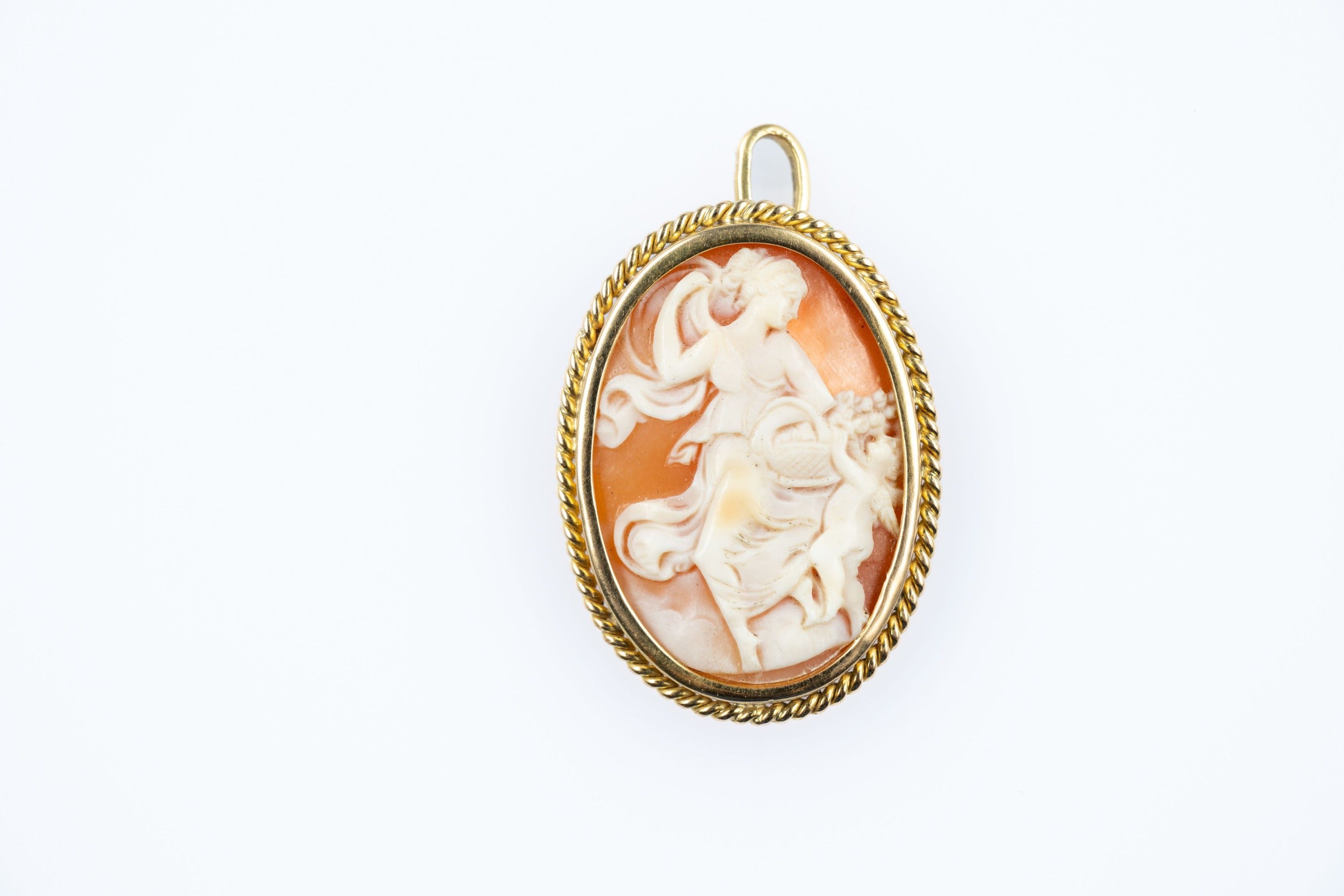 18k (750 thousandths) yellow gold pendant with twisted mounting holding a shell cameo depicting a woman with a flower basket and a putto.
