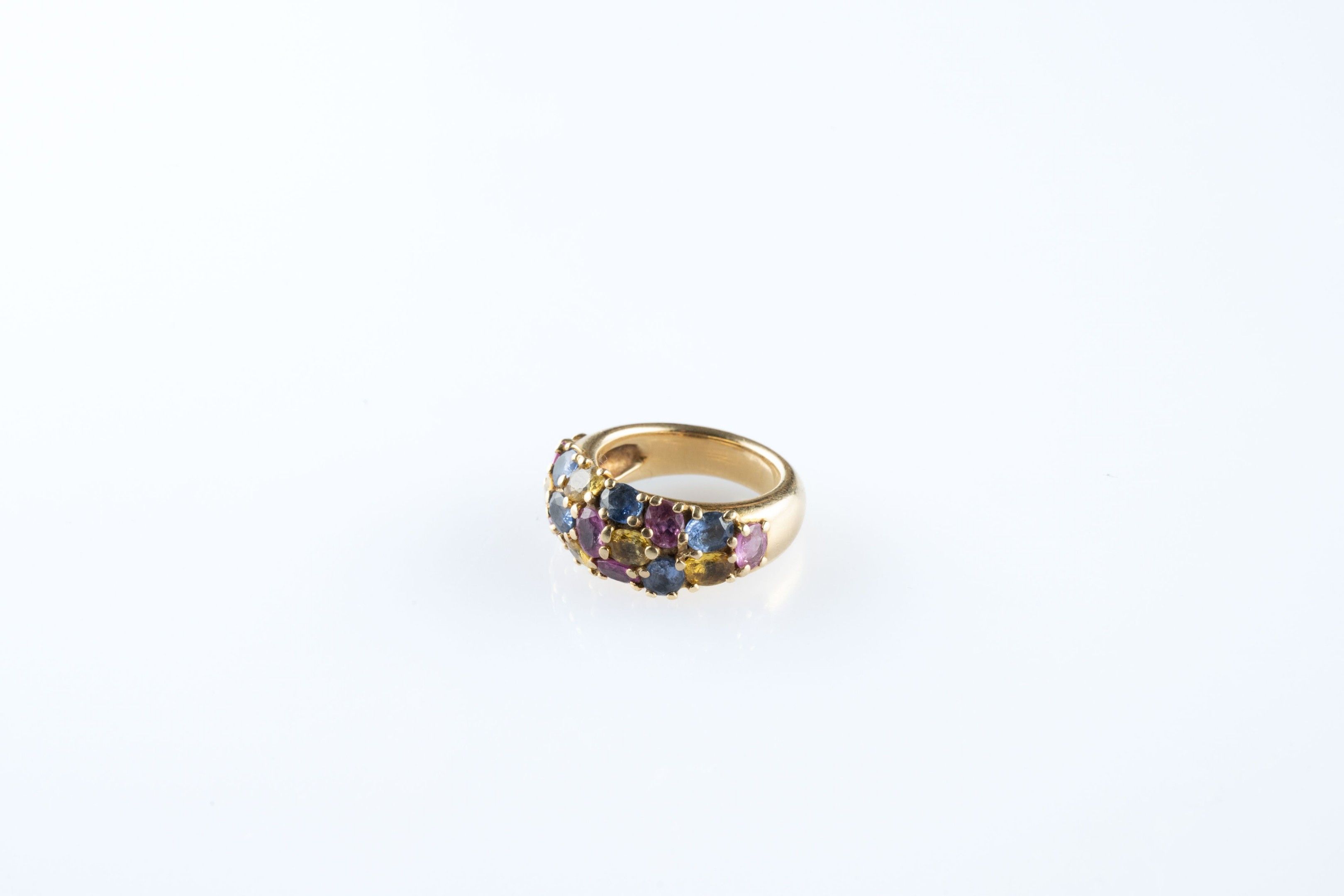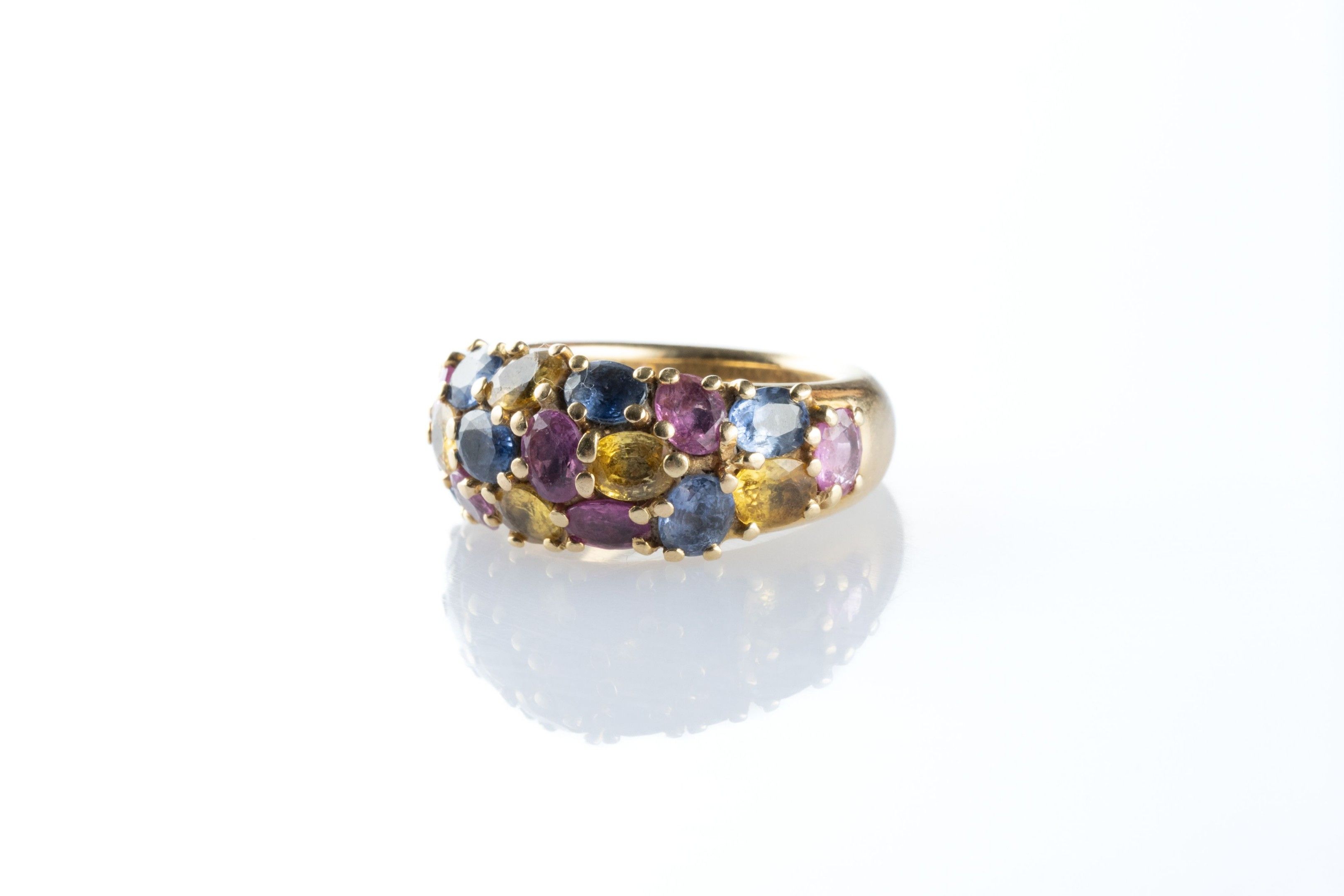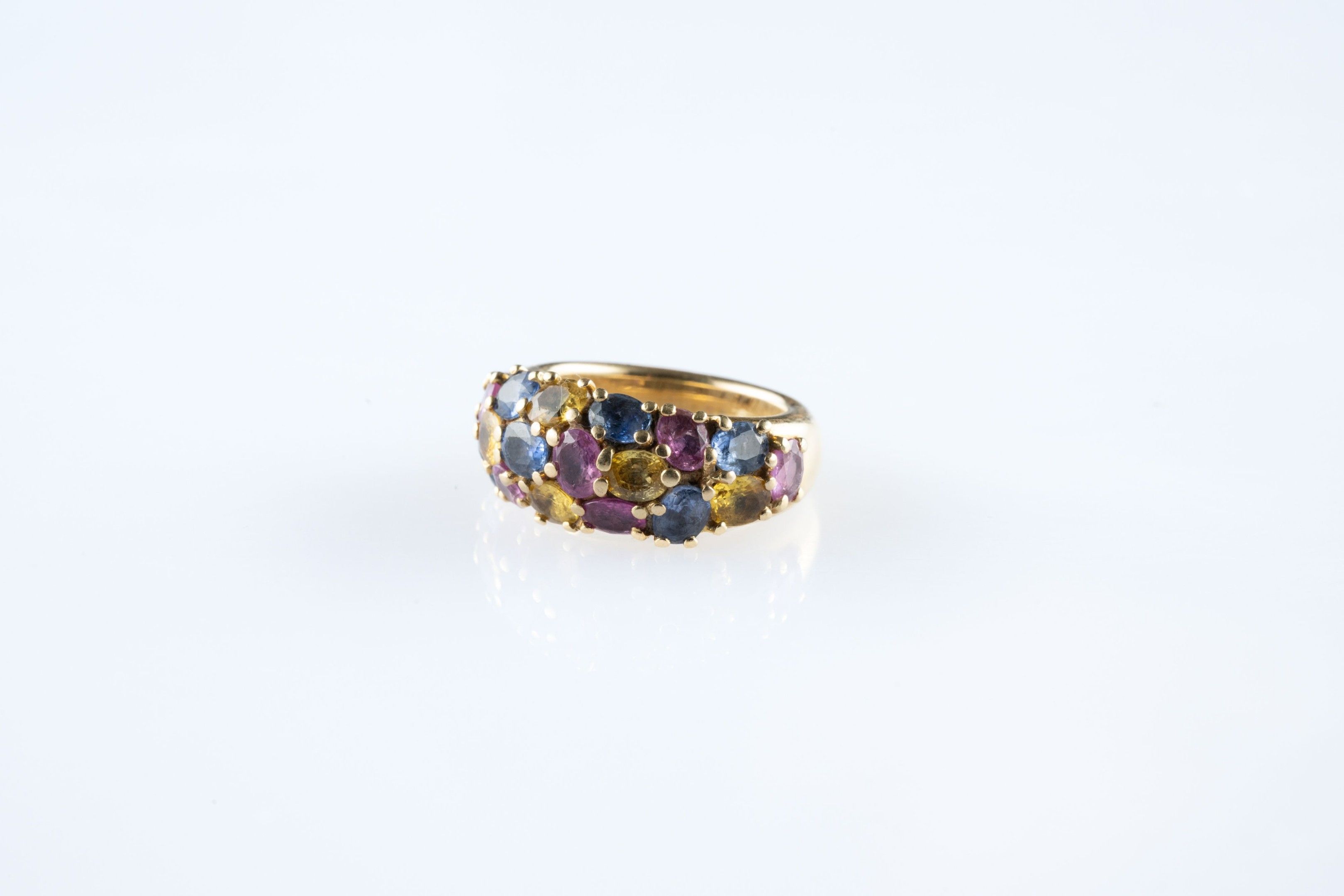 Ring in 18k (750 thousandths) yellow gold paved with pink, yellow and blue stones in the tutti-frutti style.