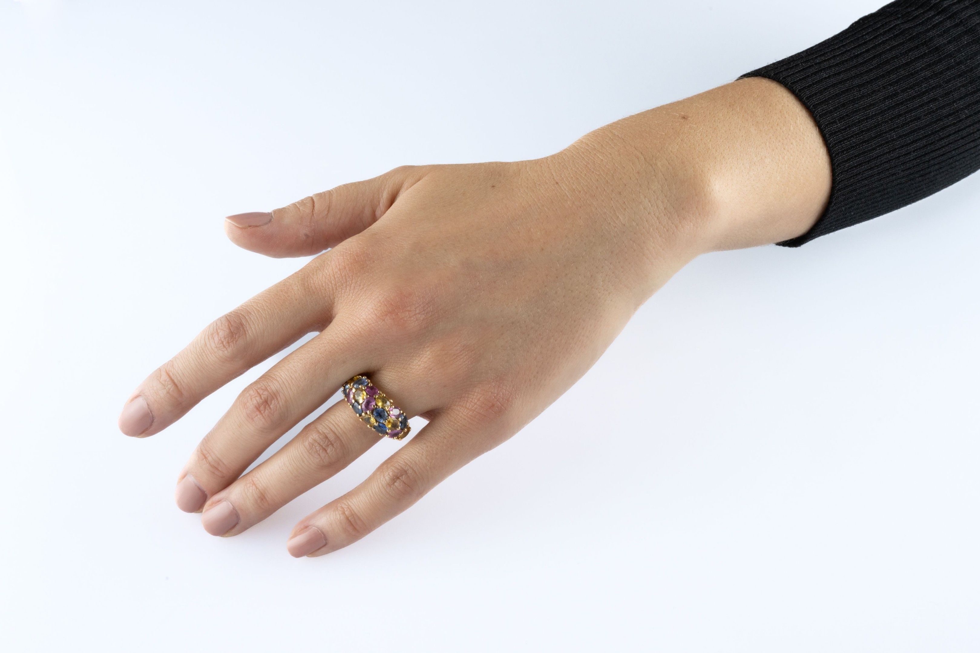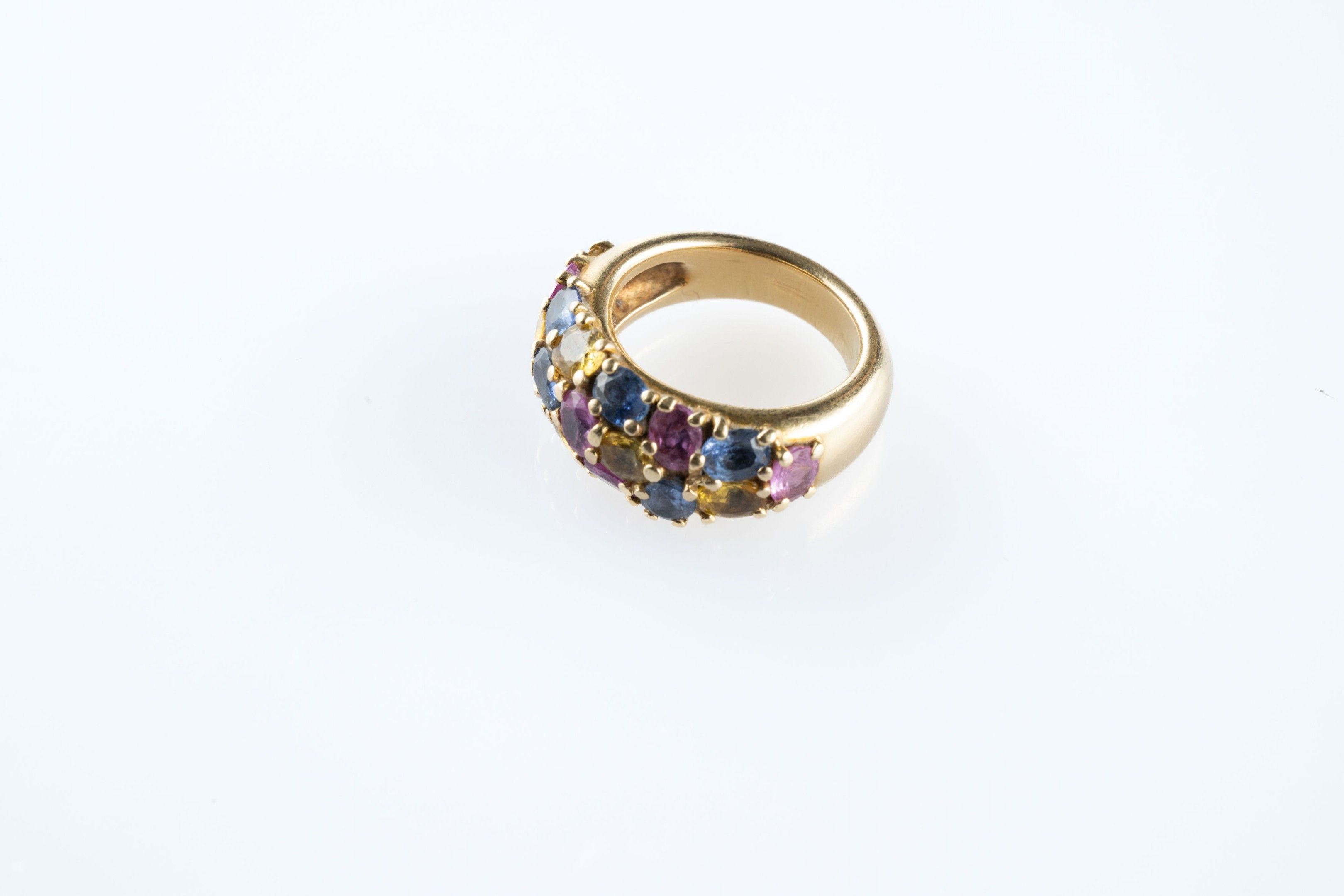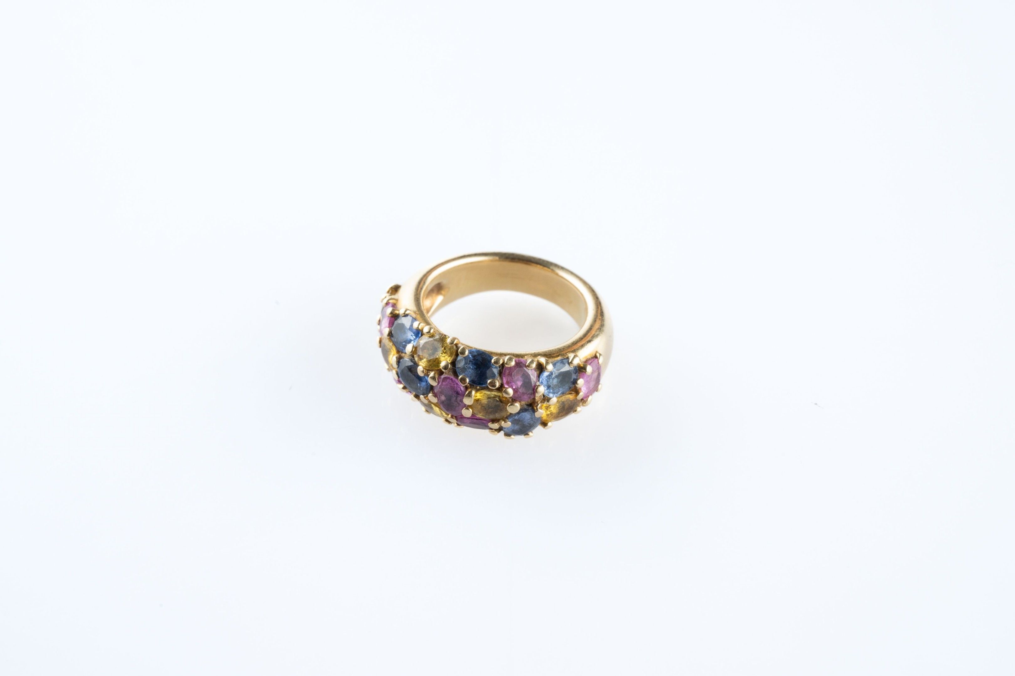 Ring in 18k (750 thousandths) yellow gold paved with pink, yellow and blue stones in the tutti-frutti style.