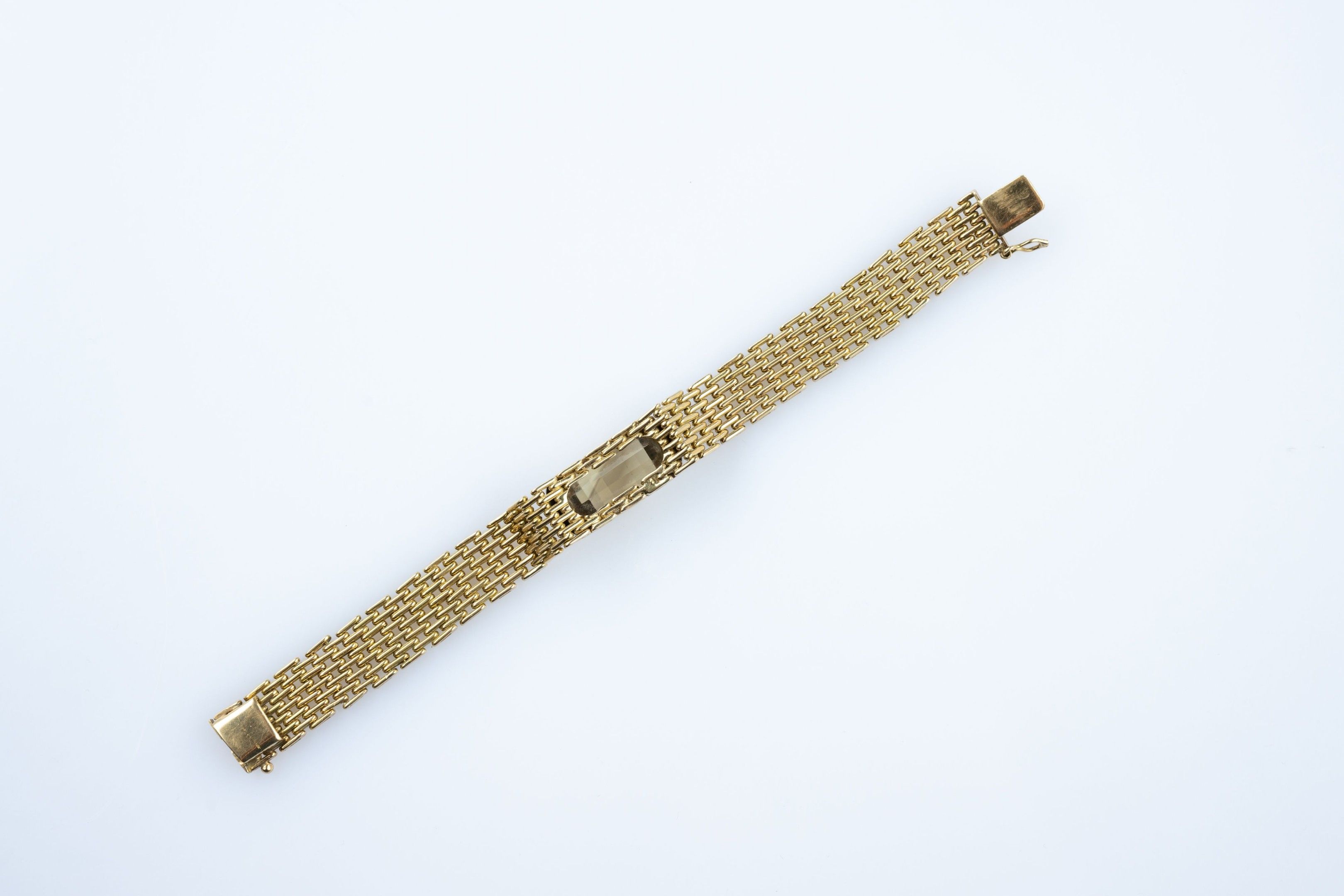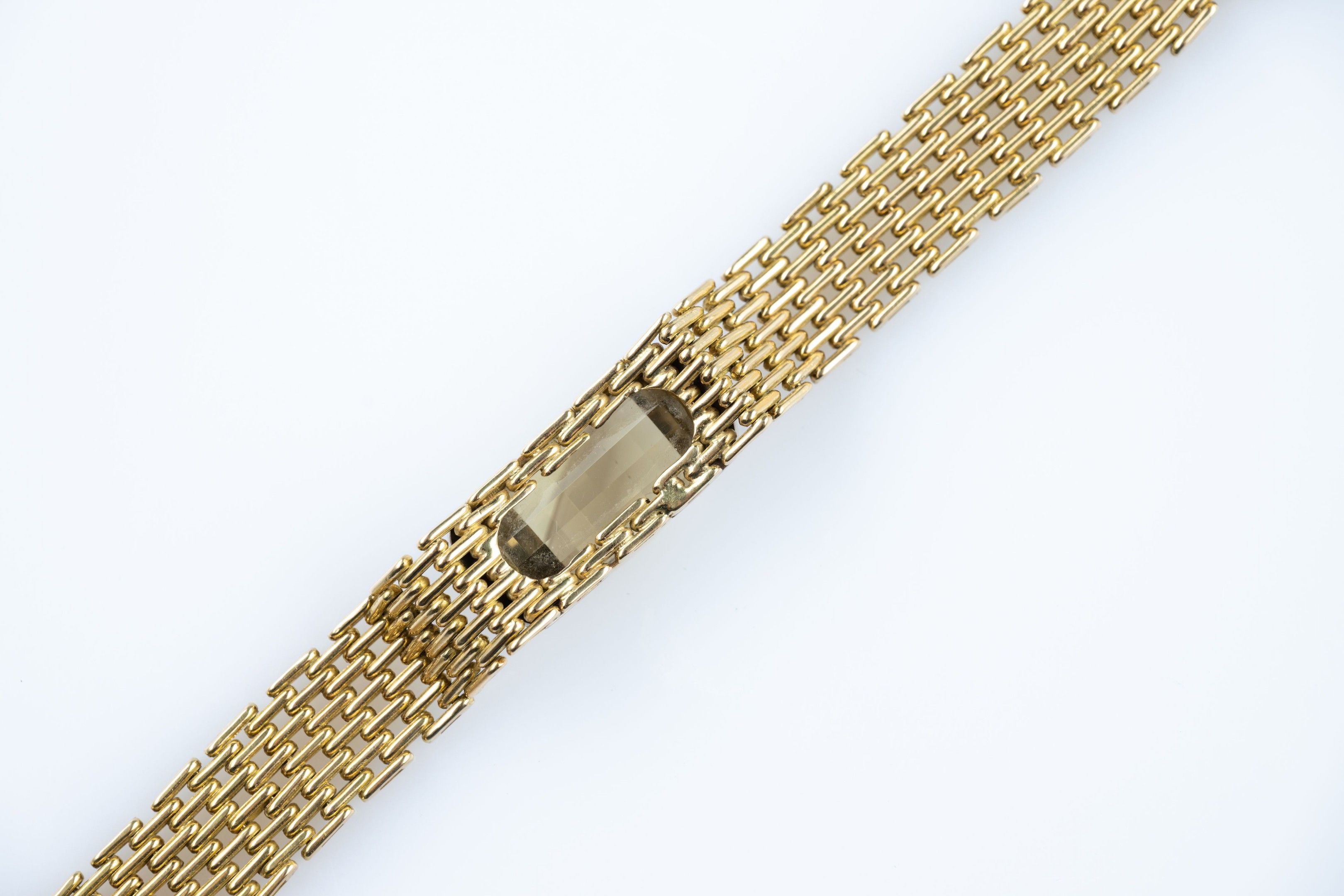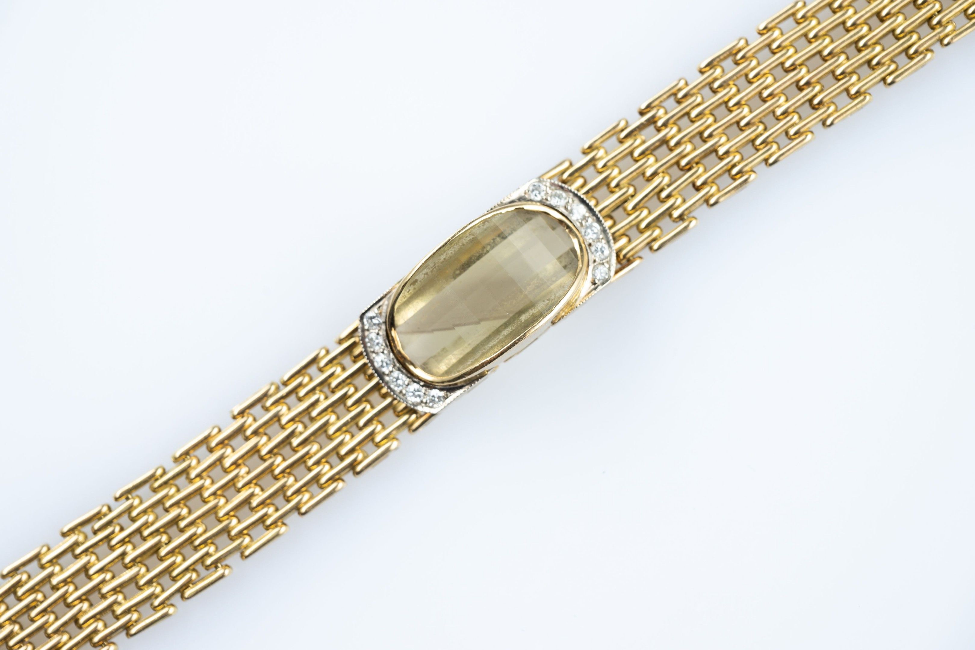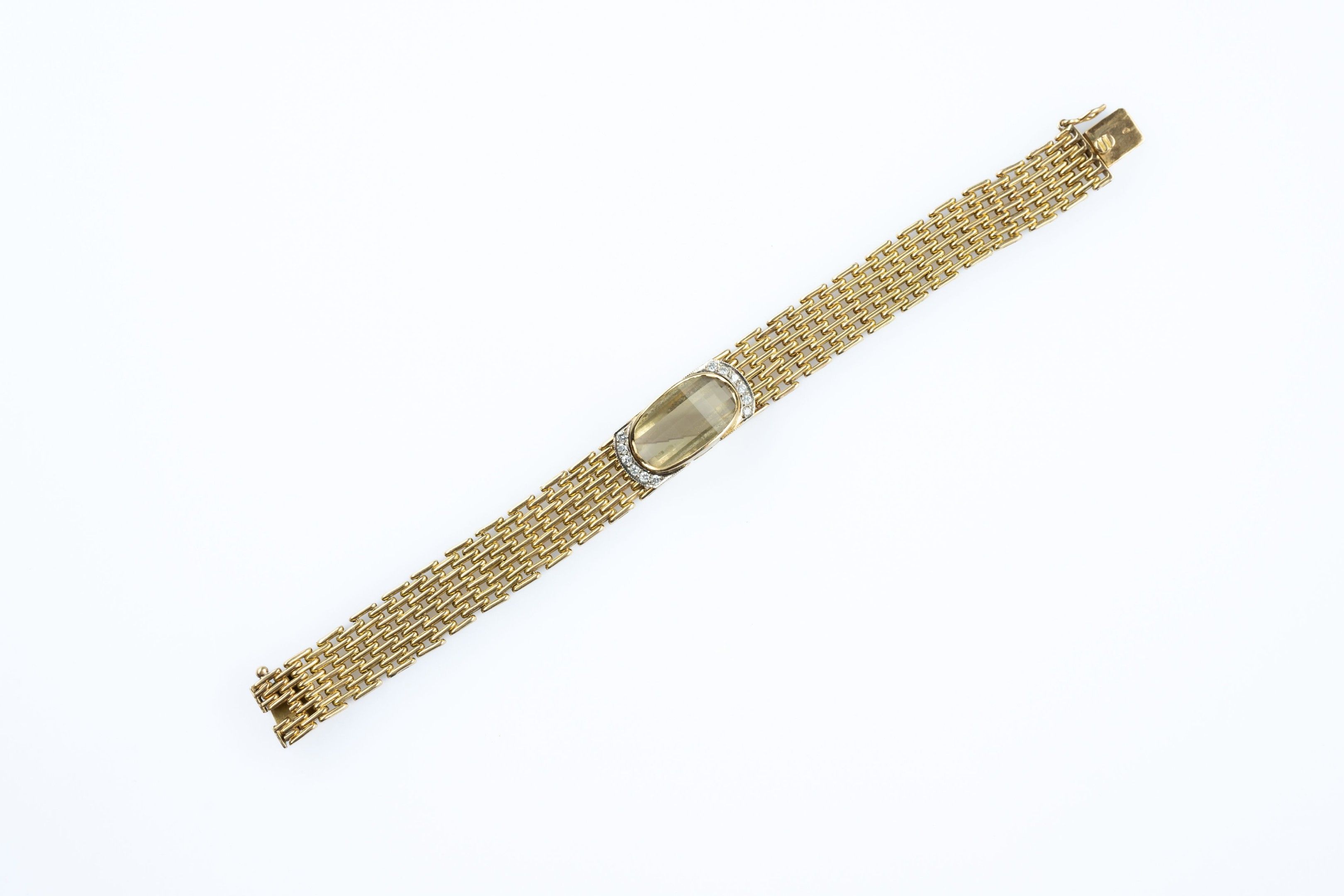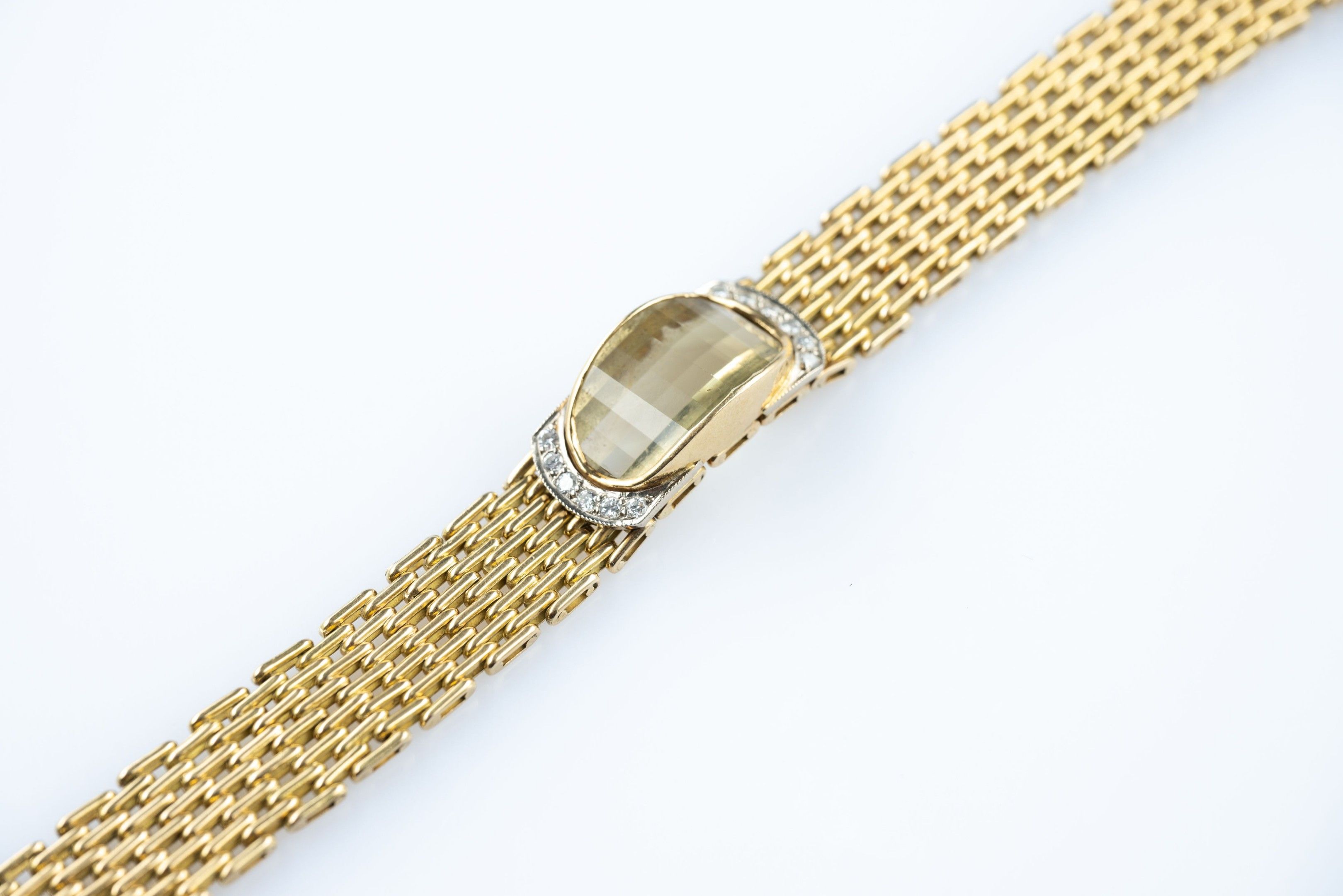 Ribbon bracelet in 18k (750 thousandths) yellow and white gold with a rice-grain design centred on a facetted hemicylindrical yellow stone set with small diamonds.