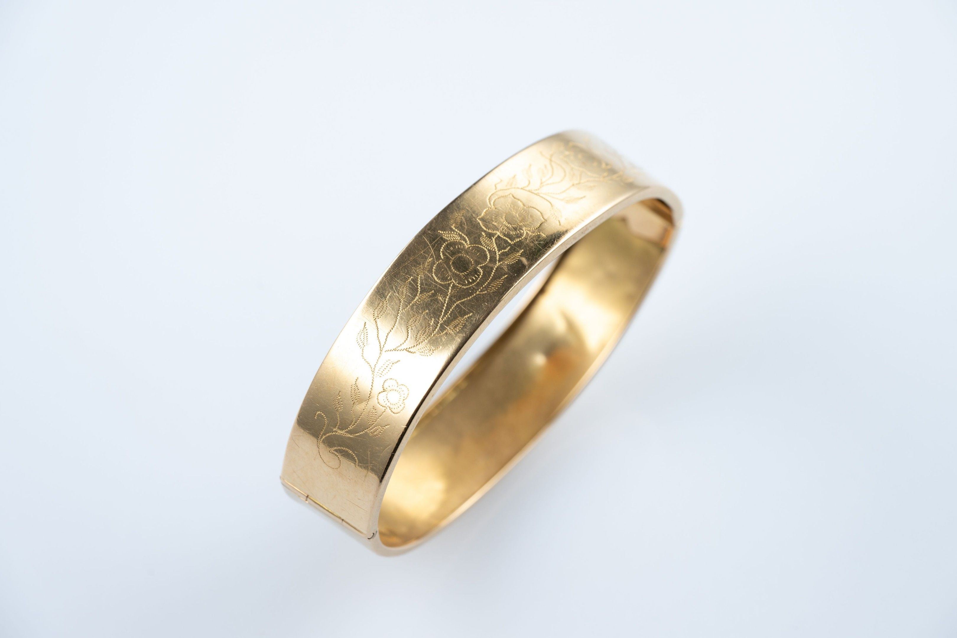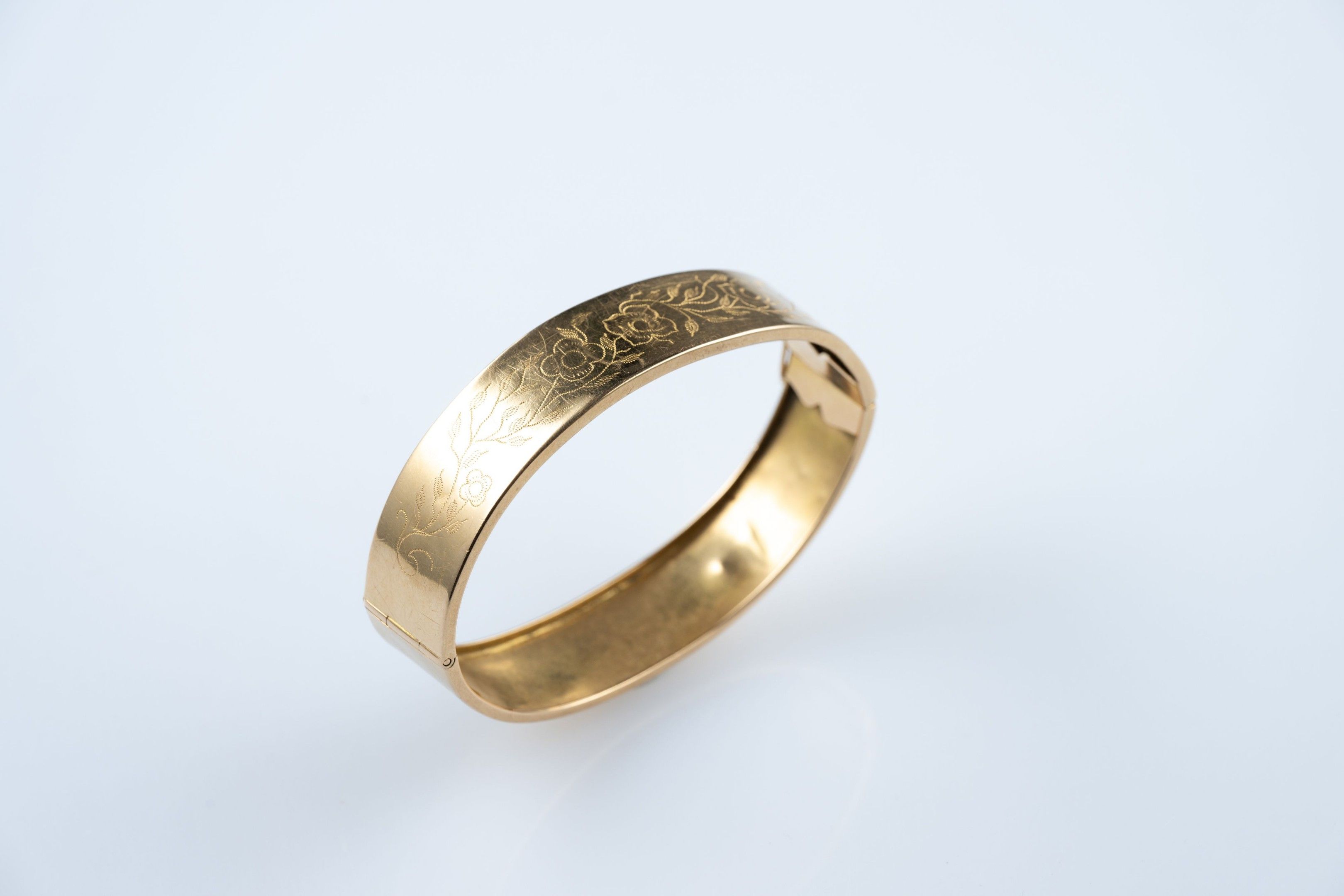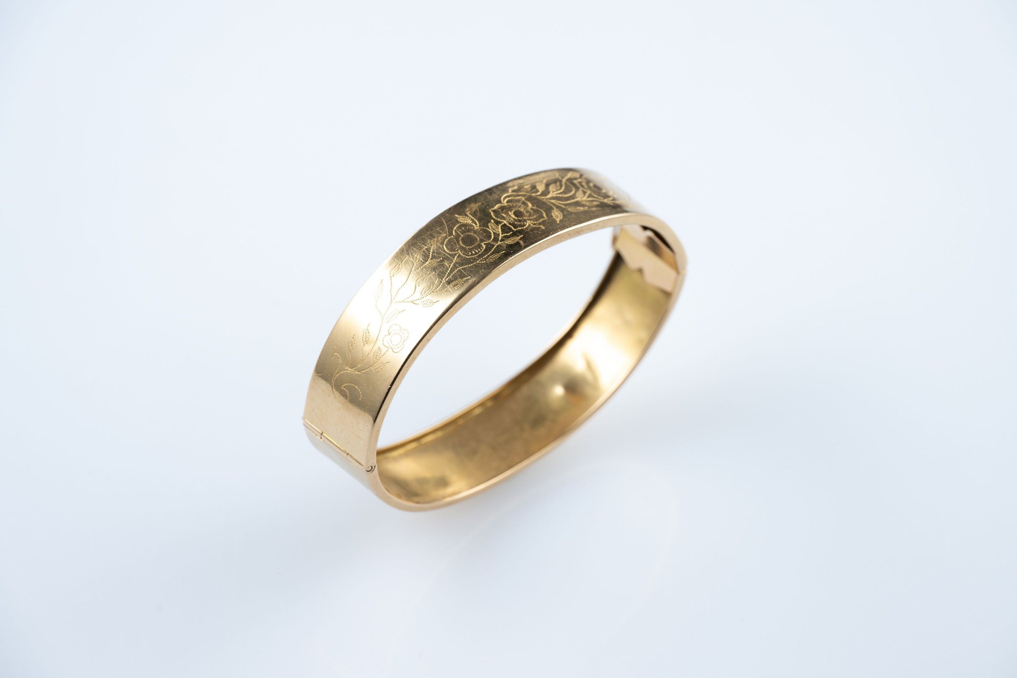Flat link bracelet in 18k (750 thousandths) yellow gold chased with flowers.