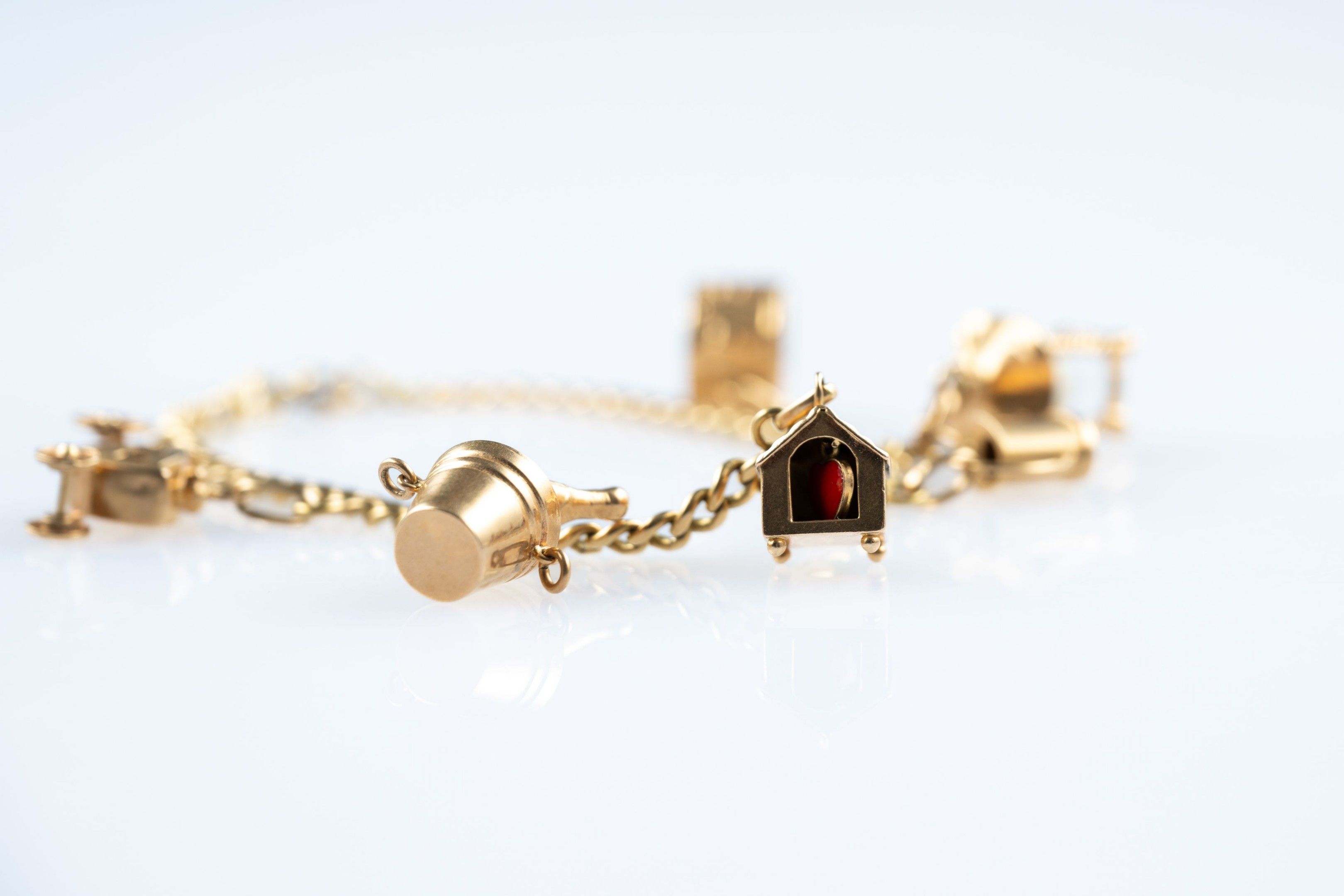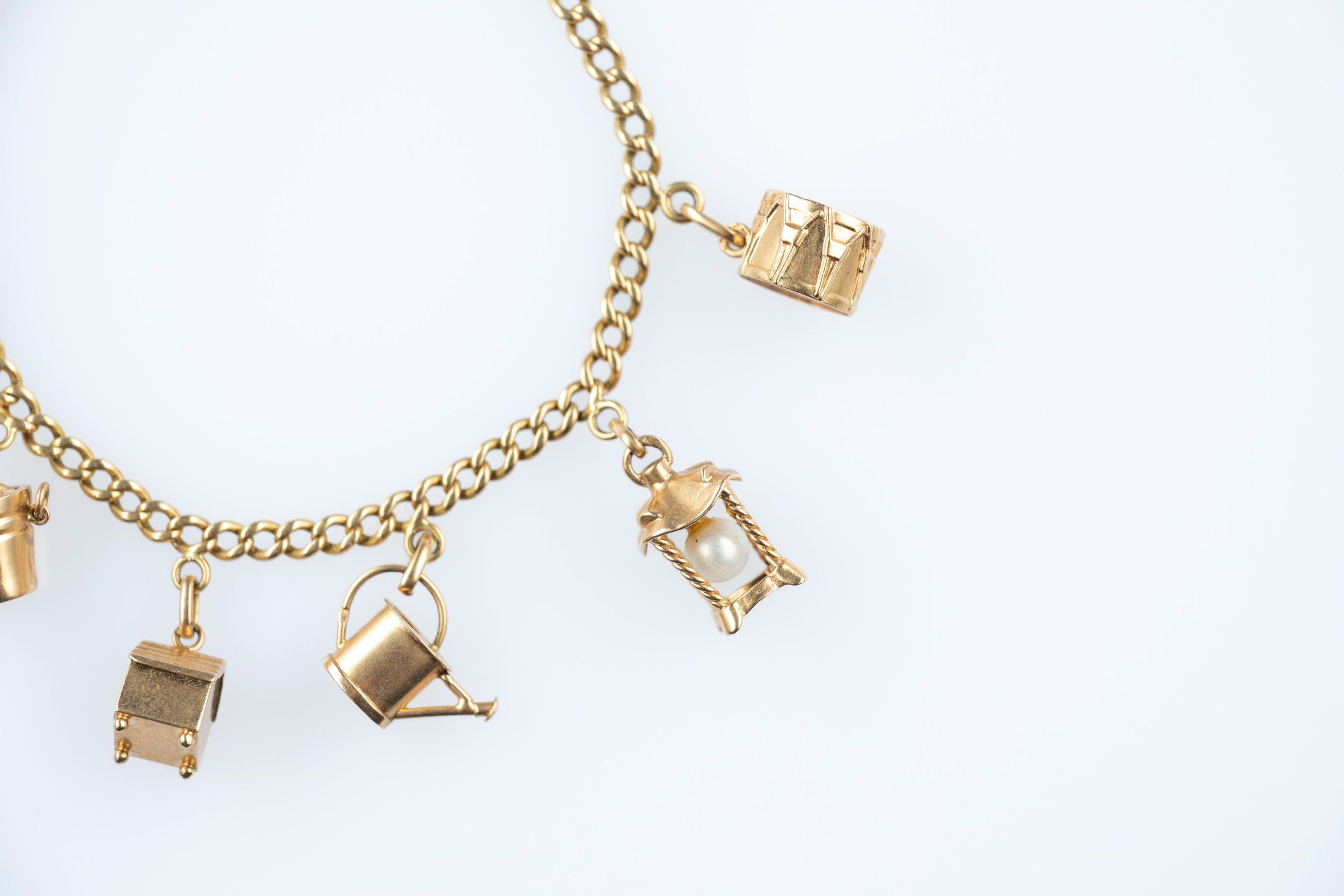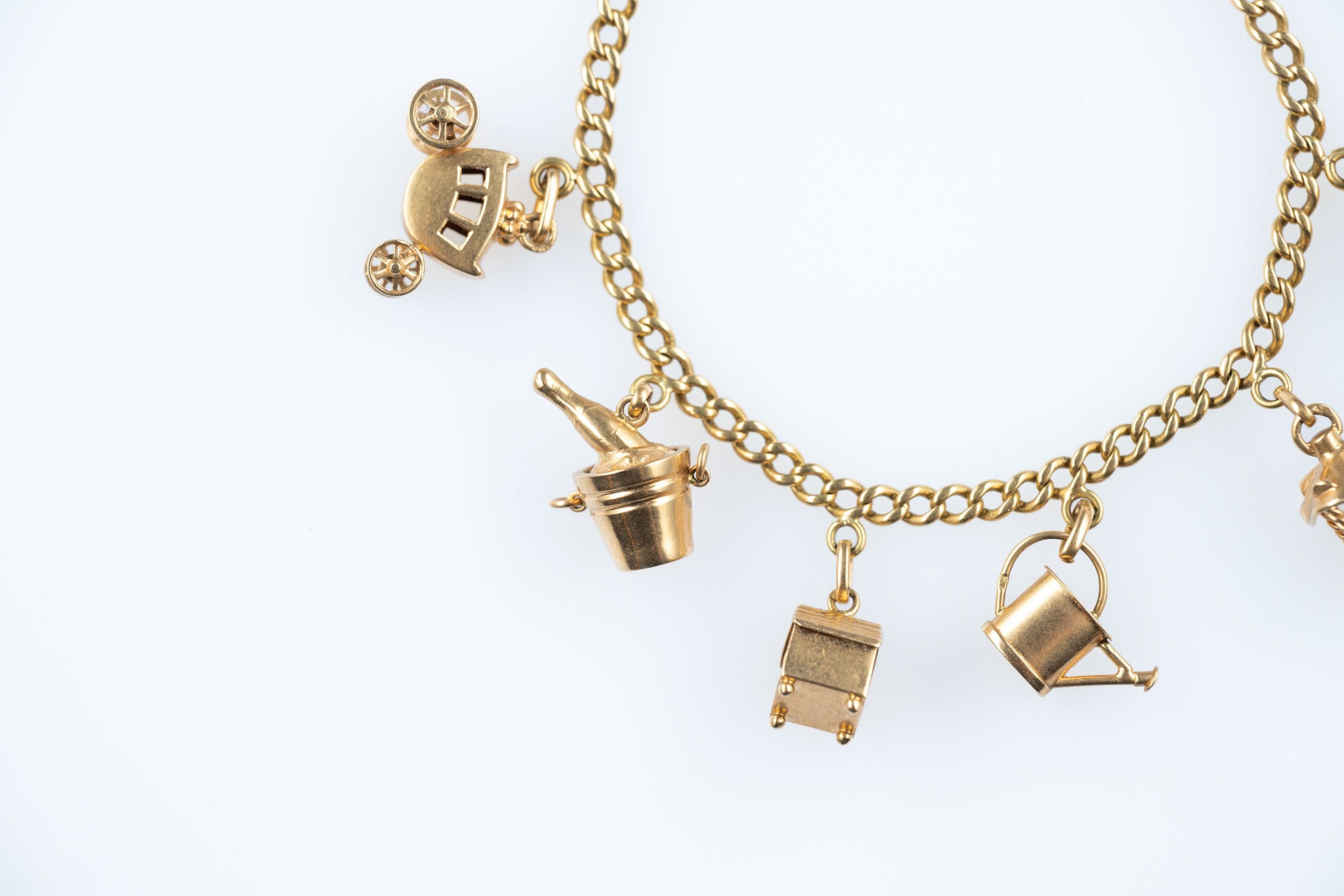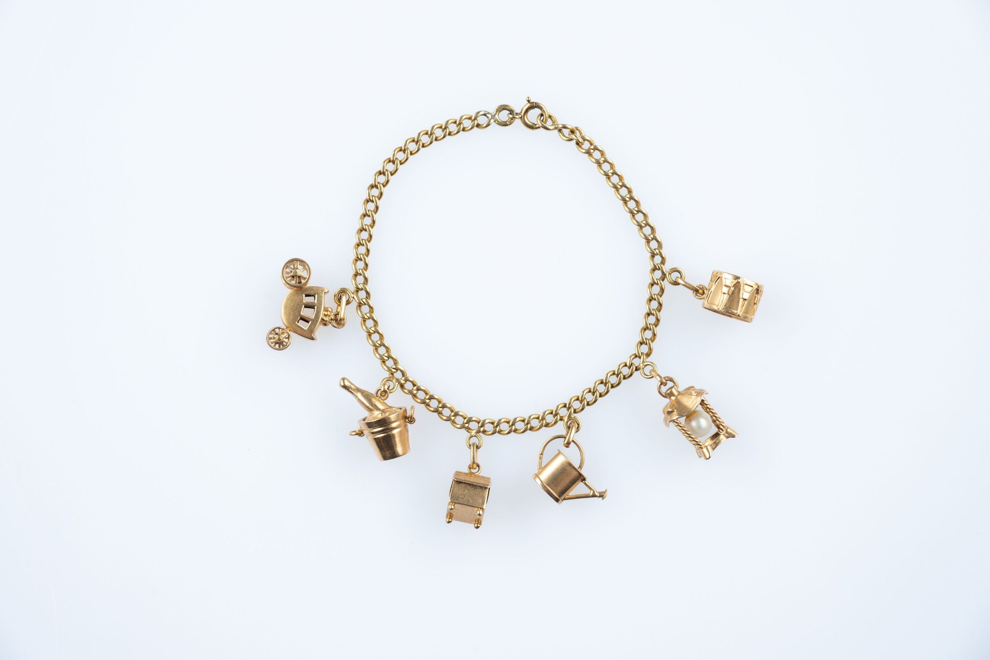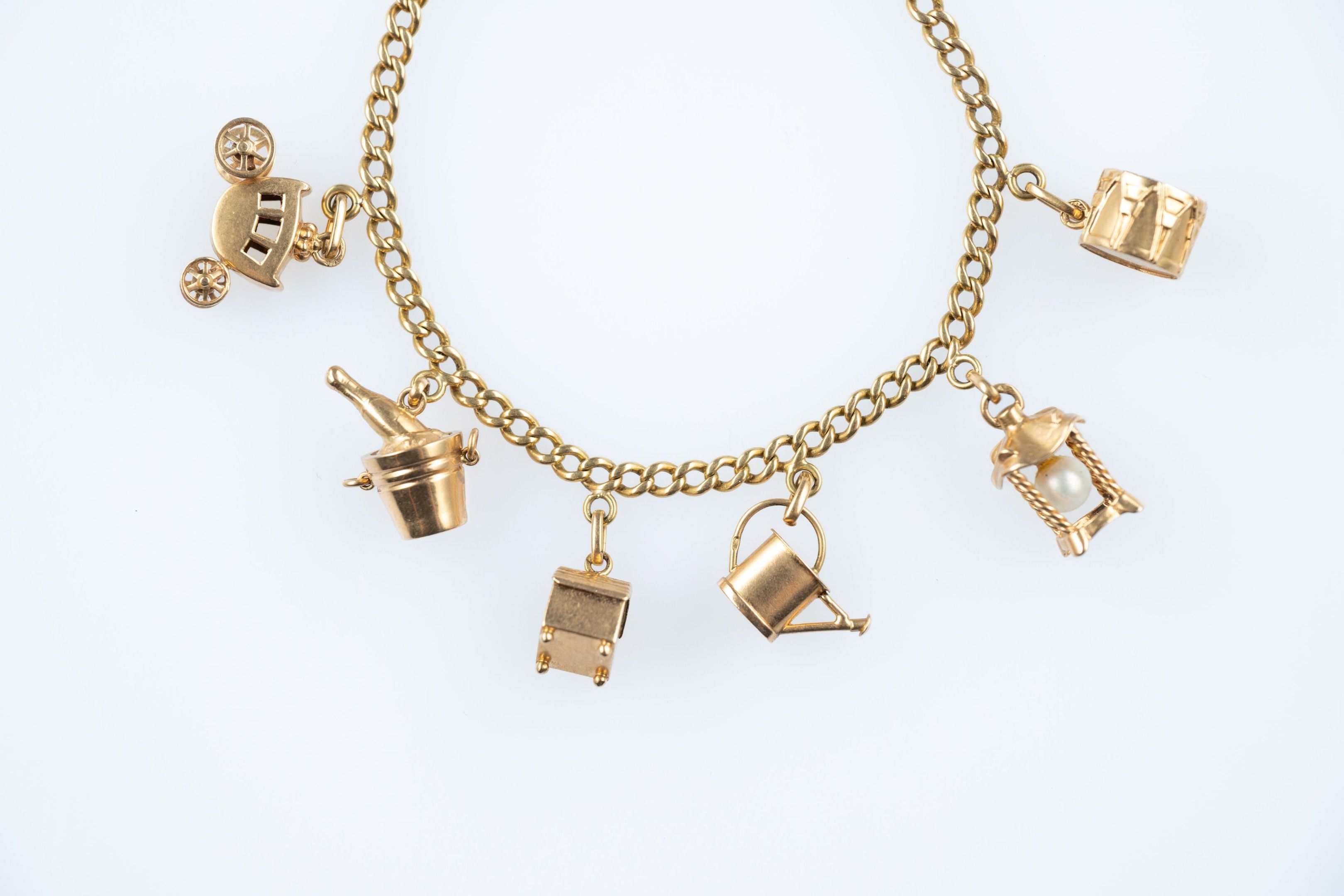 18k (750 thousandths) yellow gold curb chain bracelet holding six pendants: a horse-drawn carriage, a drum, a champagne bucket, a watering can, a niche with an enamelled heart and a lantern containing a cultured pearl.