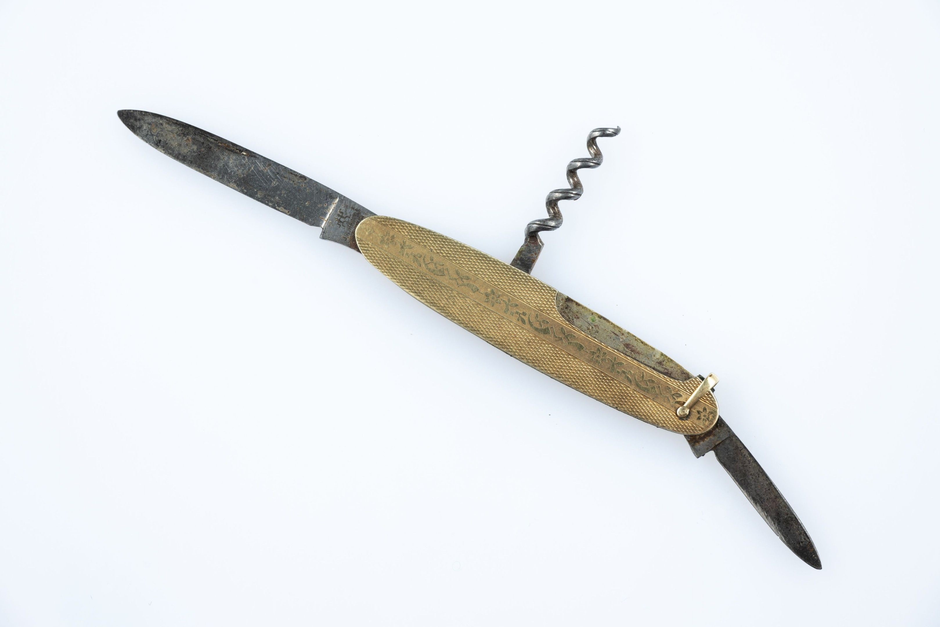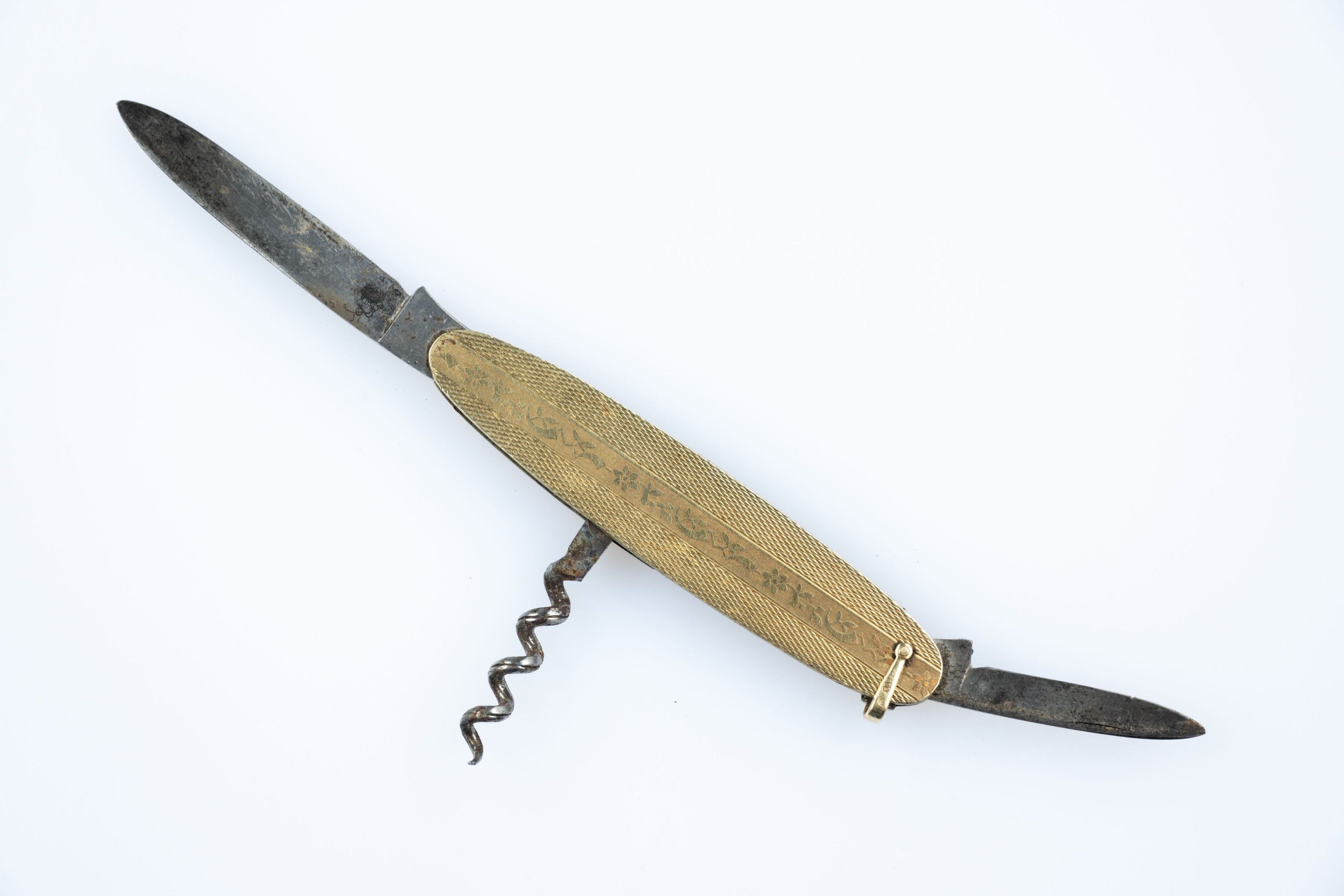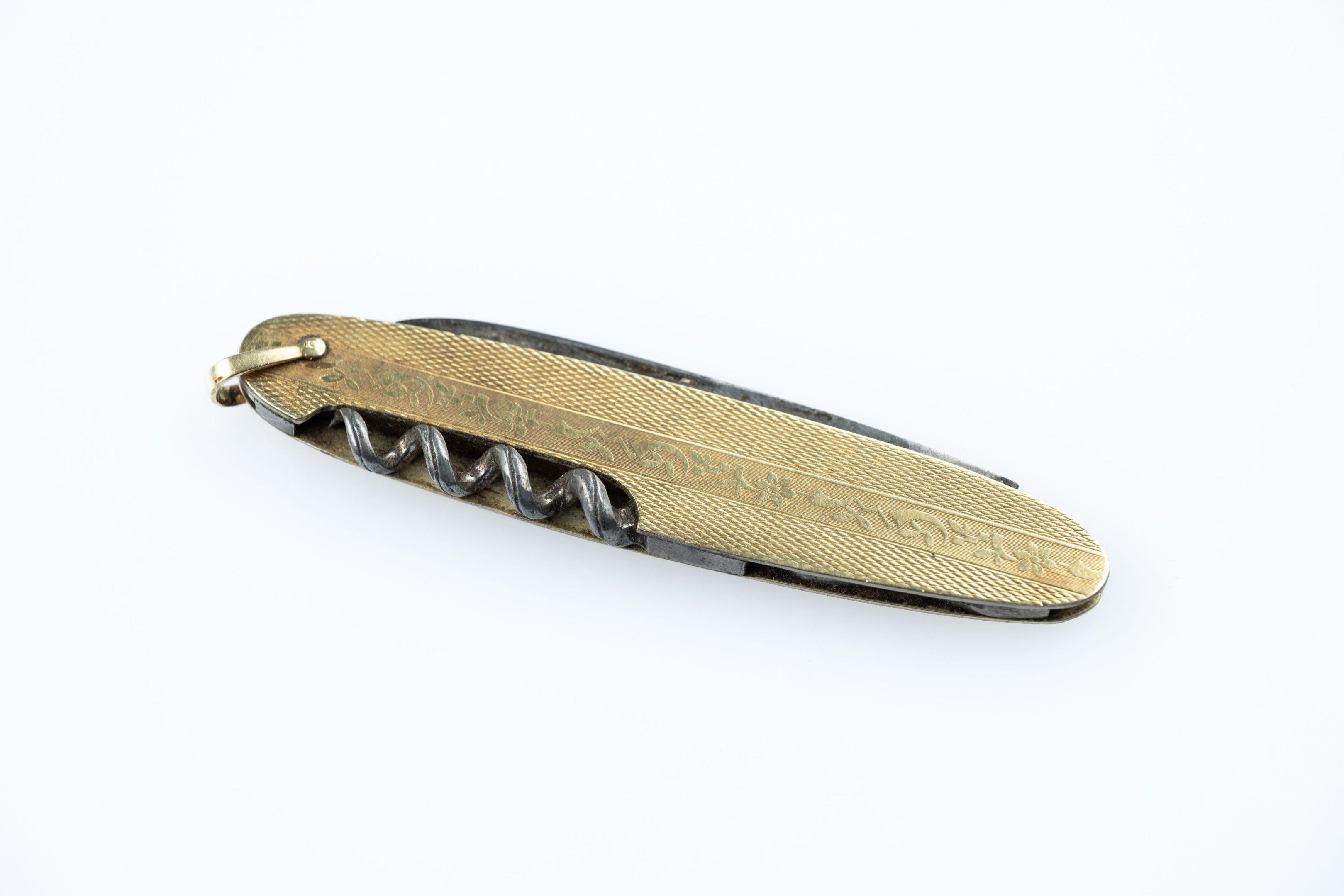 Swiss Army knife in 14k (585 thousandths) yellow gold with floral guilloché handles. It has two blades and a metal corkscrew.