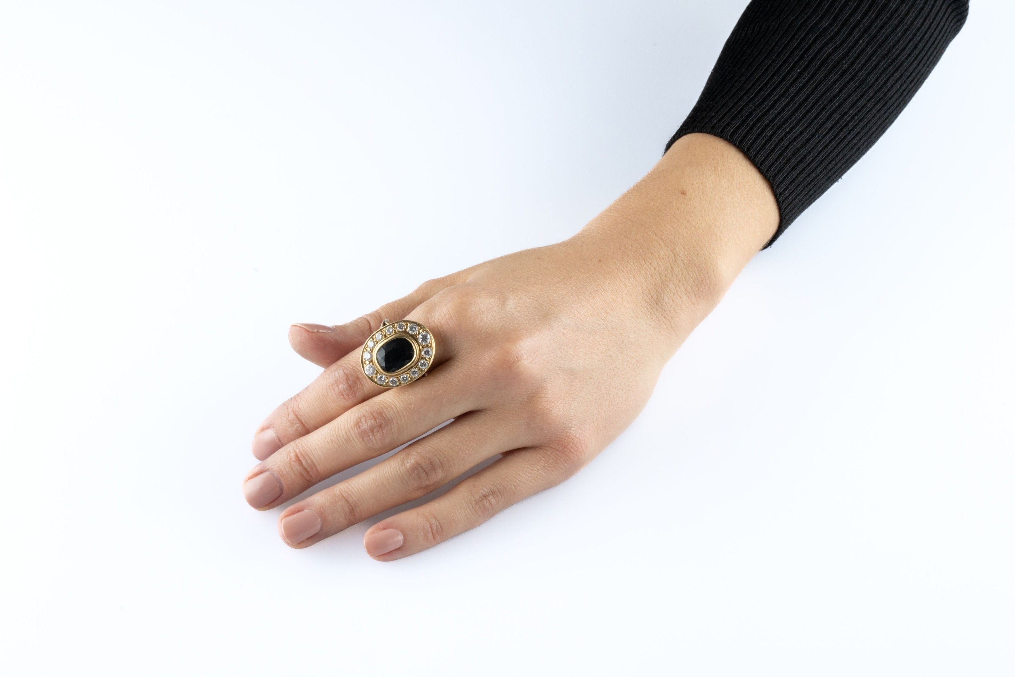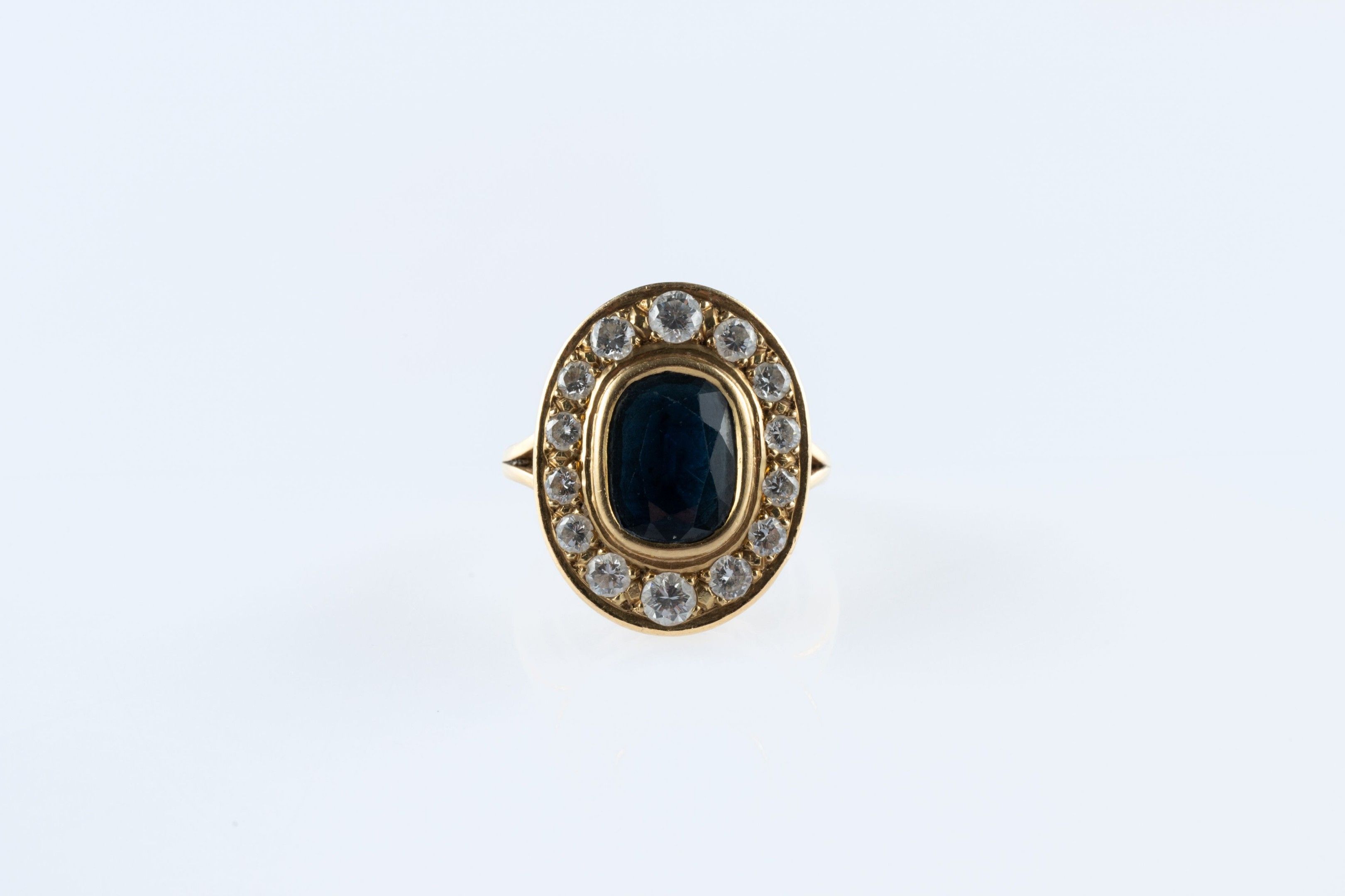 18k (750 thousandths) yellow gold ring set in the centre with an oval sapphire in a setting of fourteen round brilliant-cut diamonds.