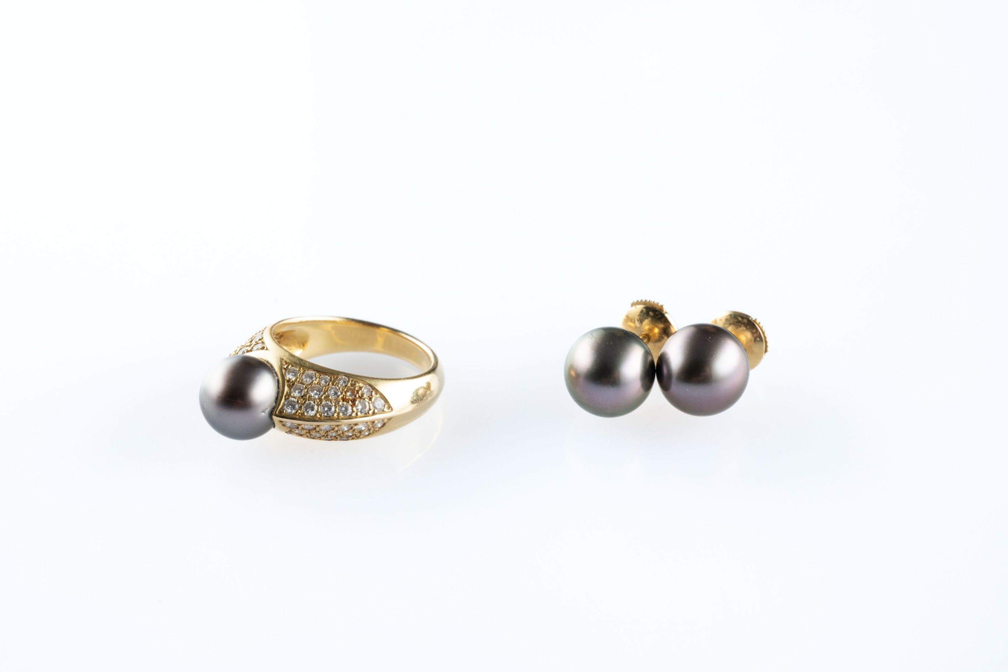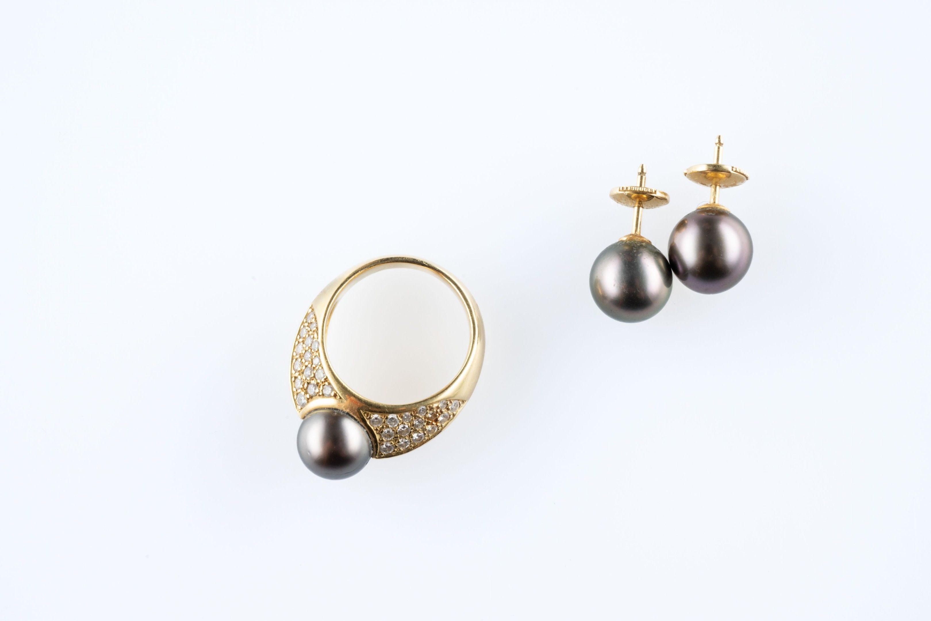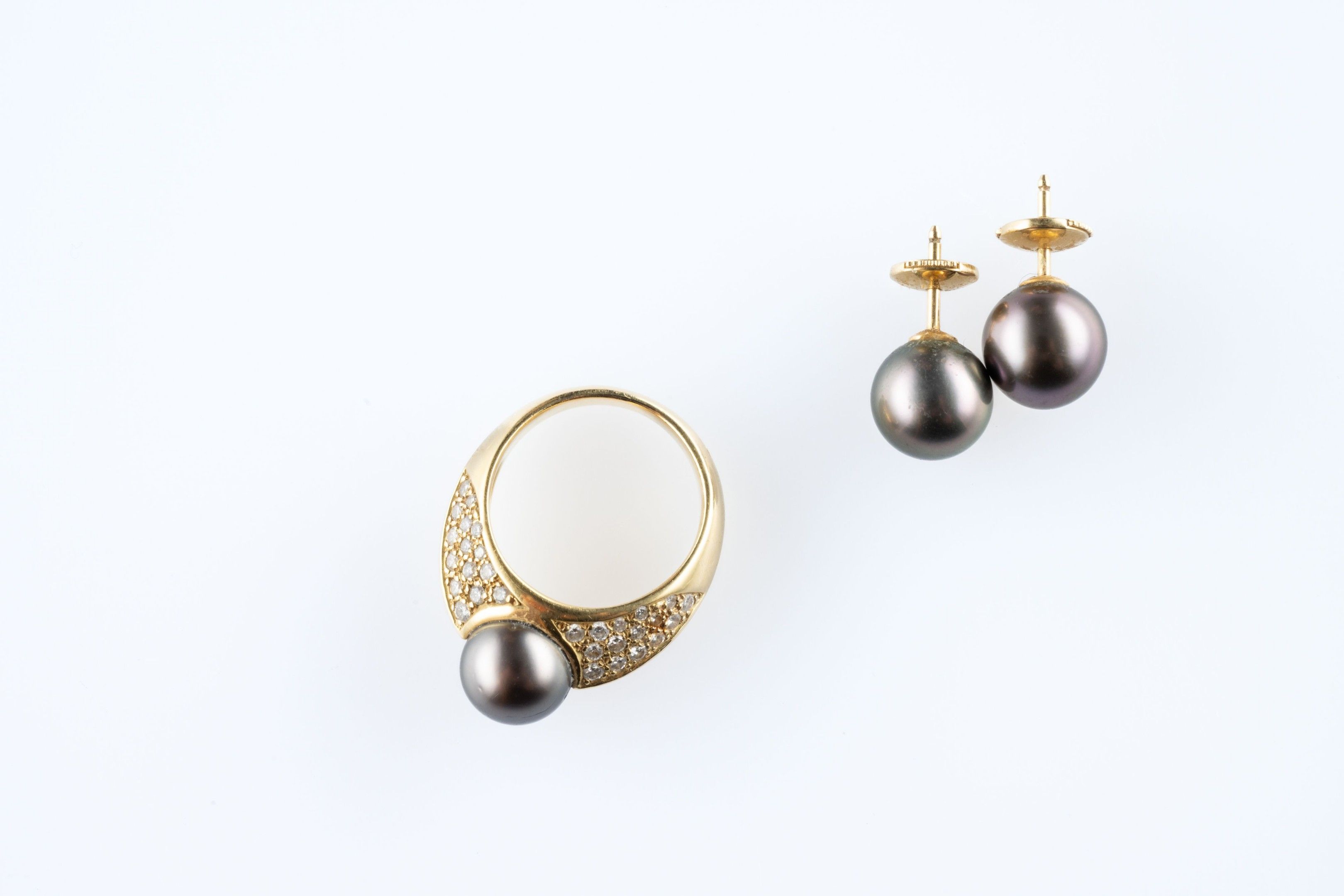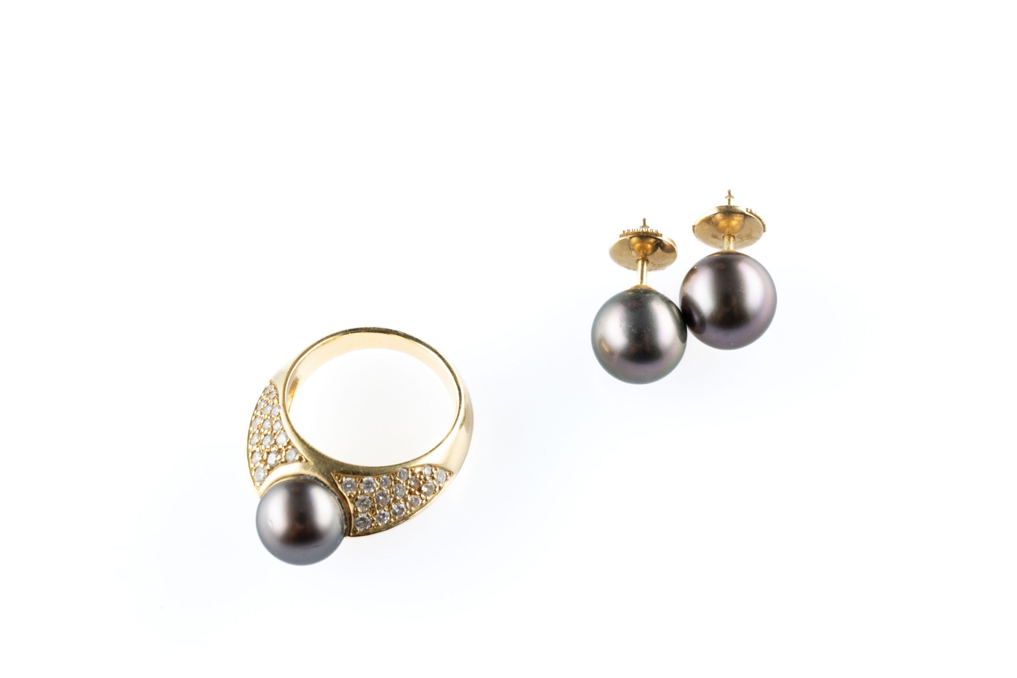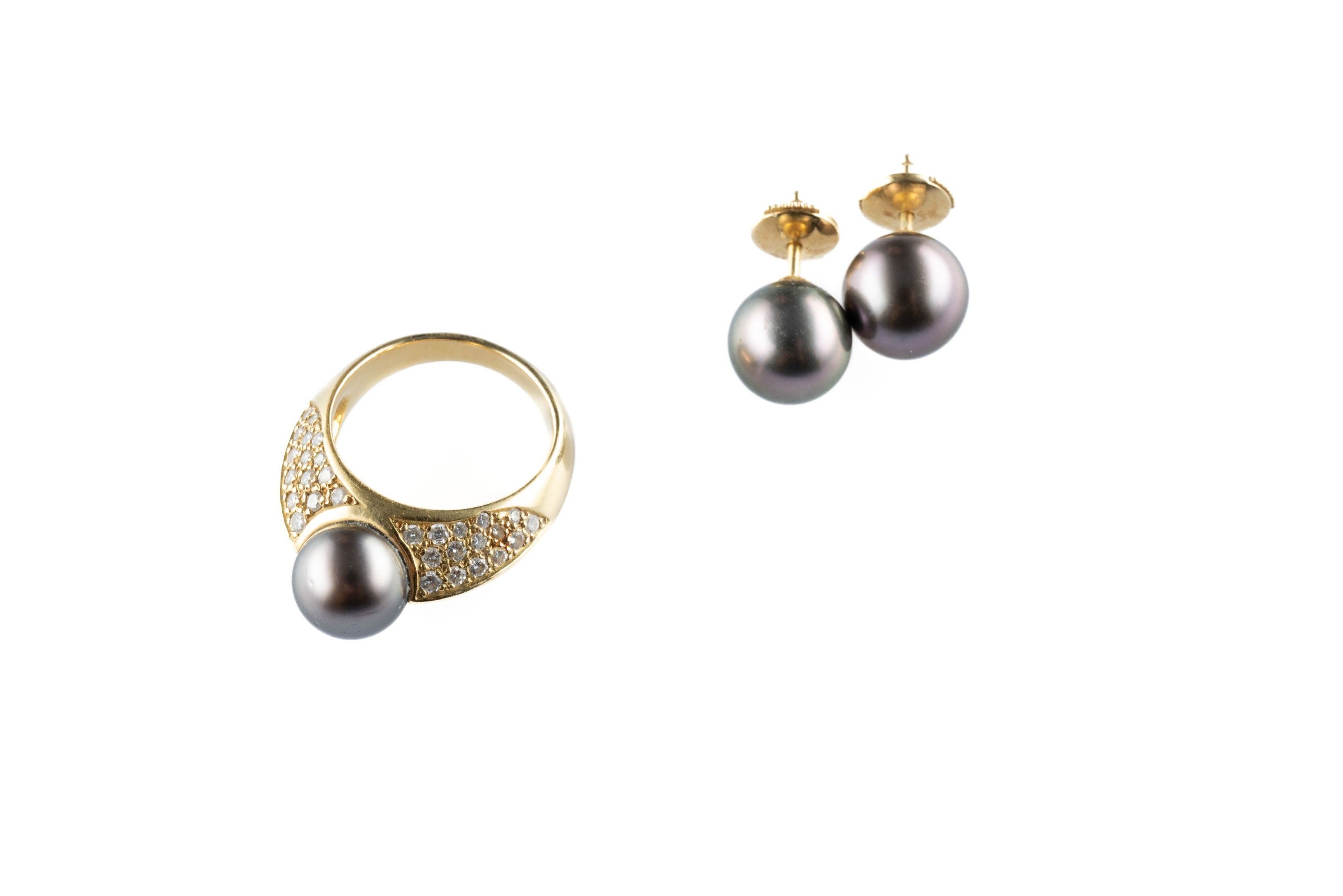 Set in 18k (750 thousandths) yellow gold and pinkish-grey Tahitian pearls, comprising a wedding band ring paved with small diamonds and a pair of ear studs (Alpa system clasp).