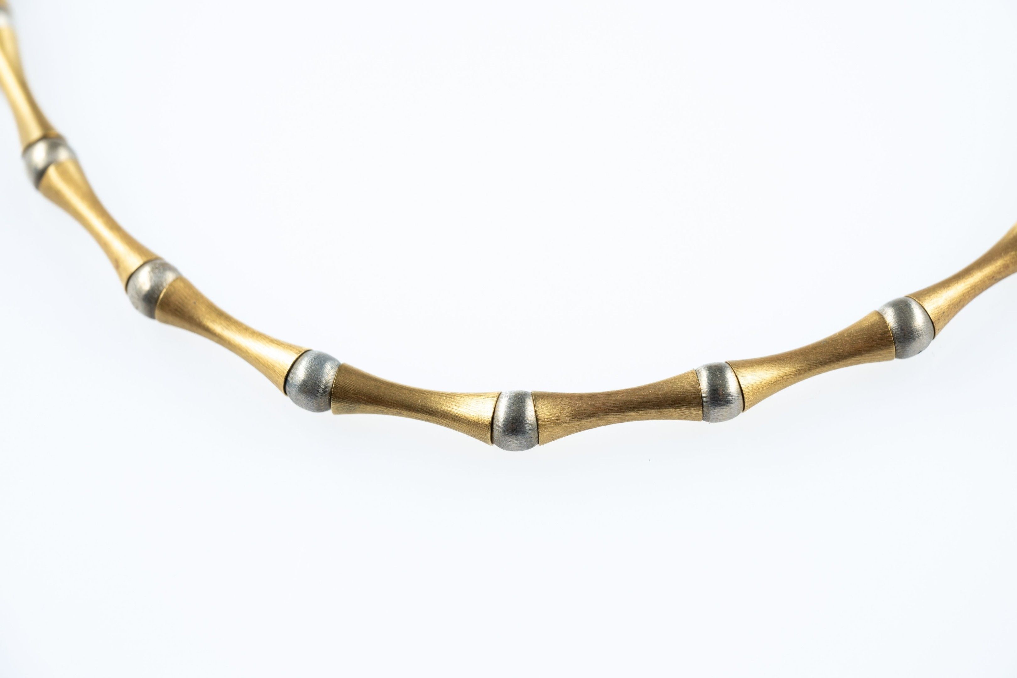 18k (750 thousandths) gold necklace made up of yellow gold amatite tubular pearls set with white gold pearls.