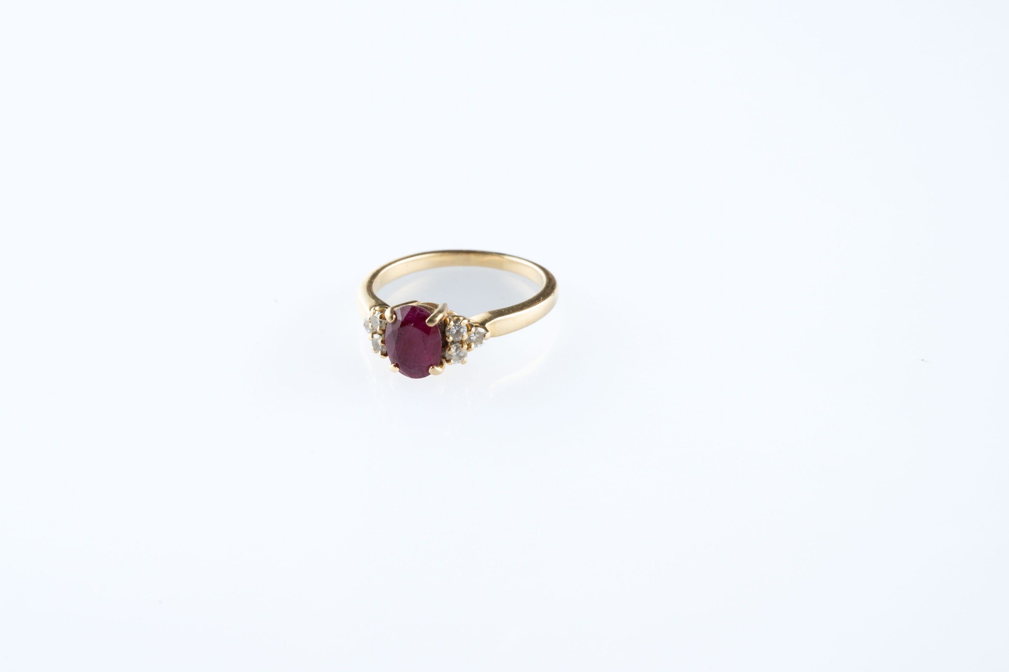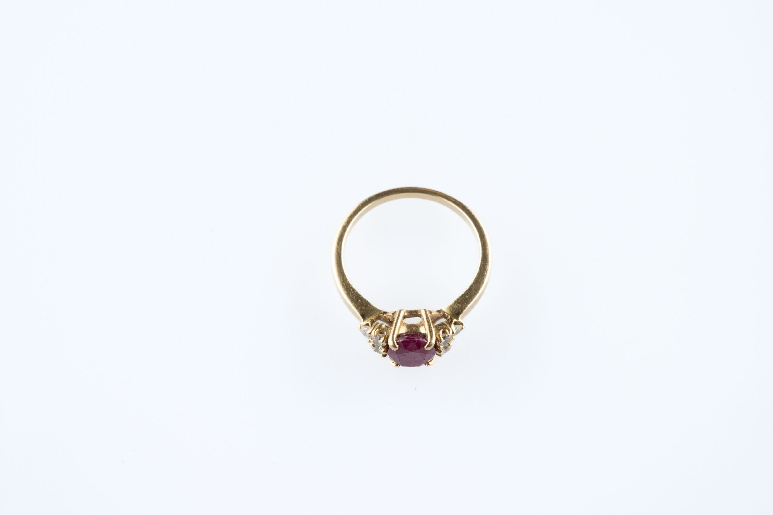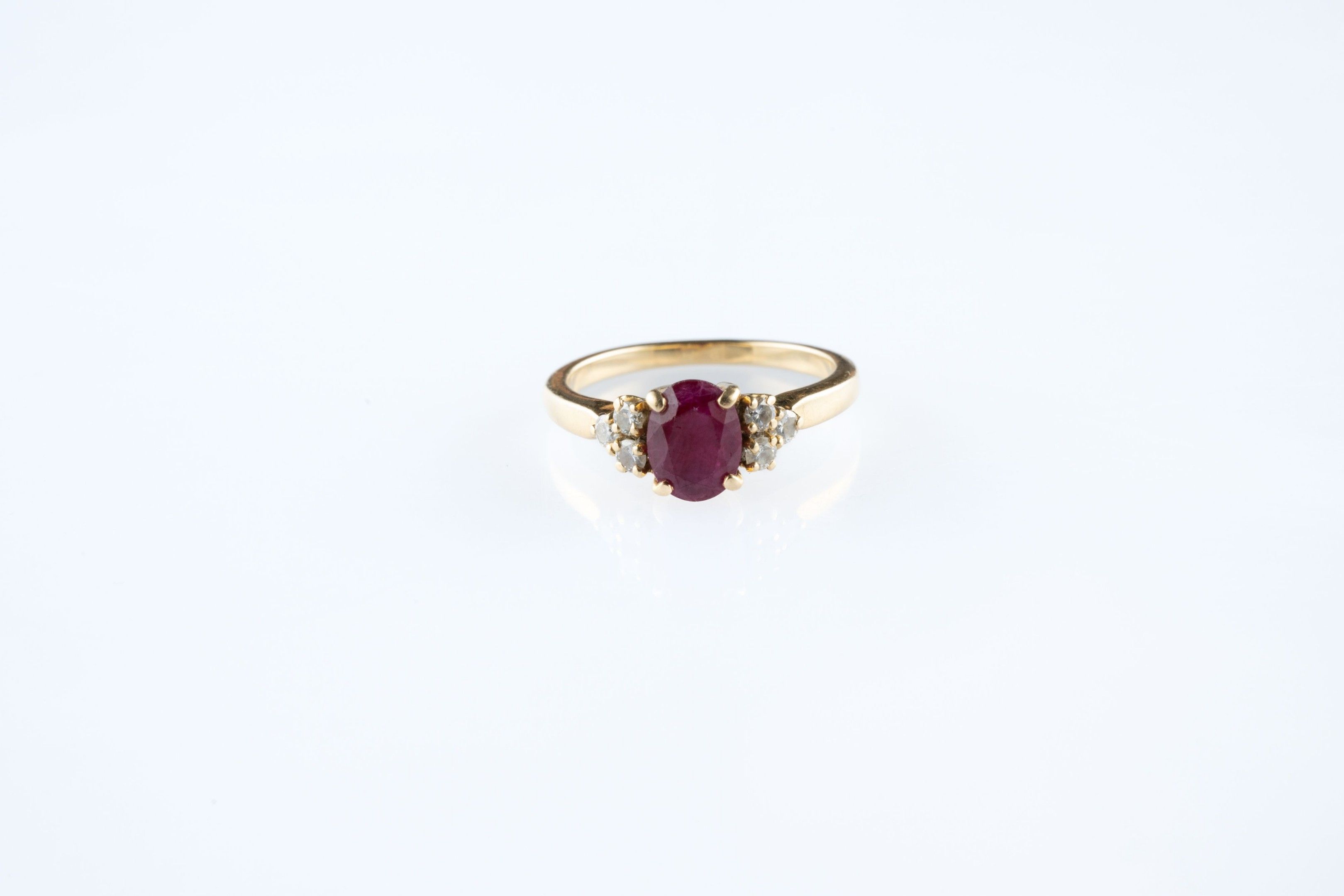 Ring in 18k (750 thousandths) yellow gold set with an oval faceted ruby with three small brilliant-cut diamonds on either side.
