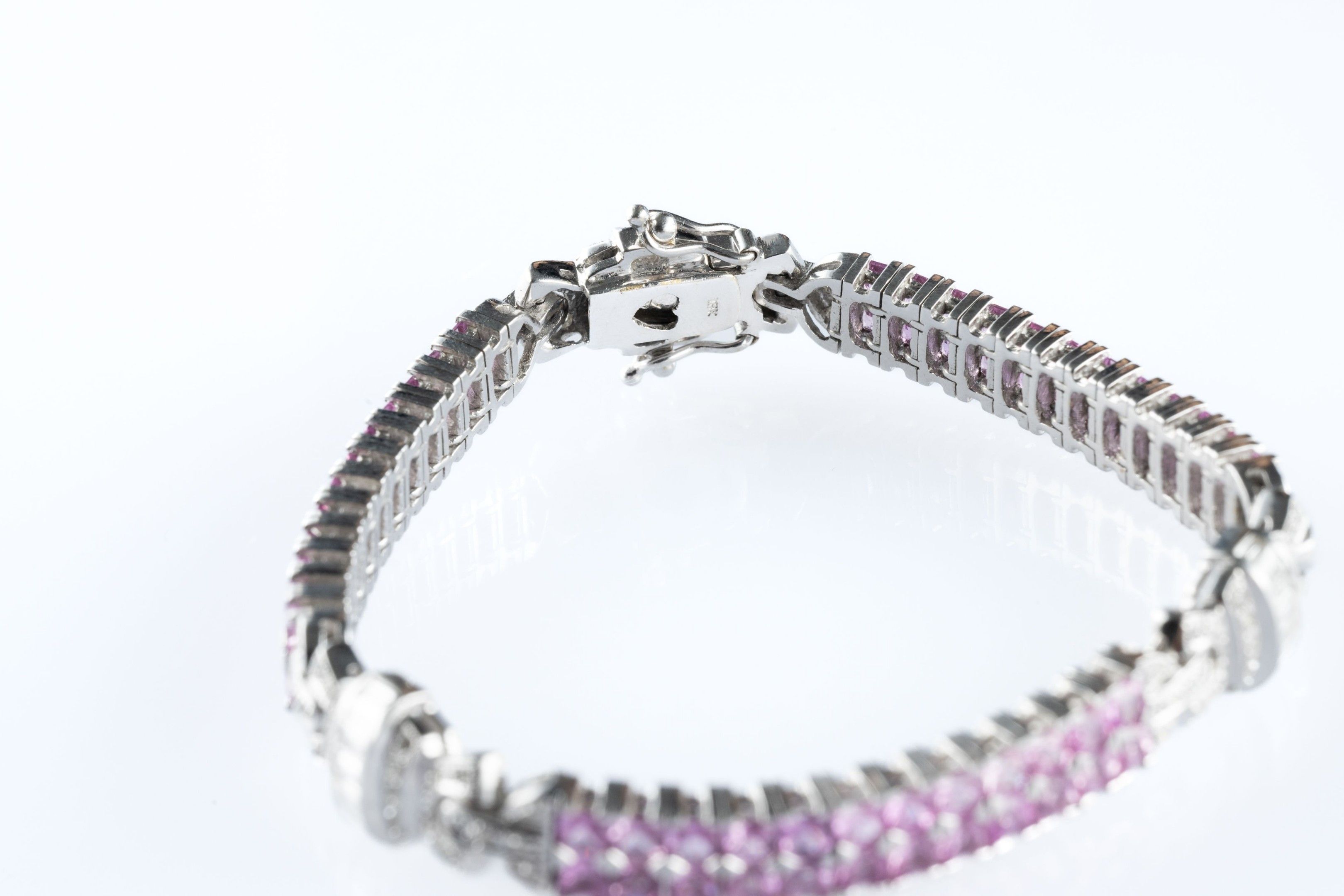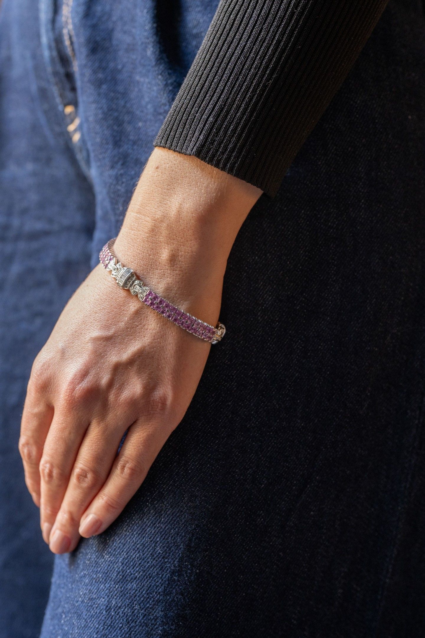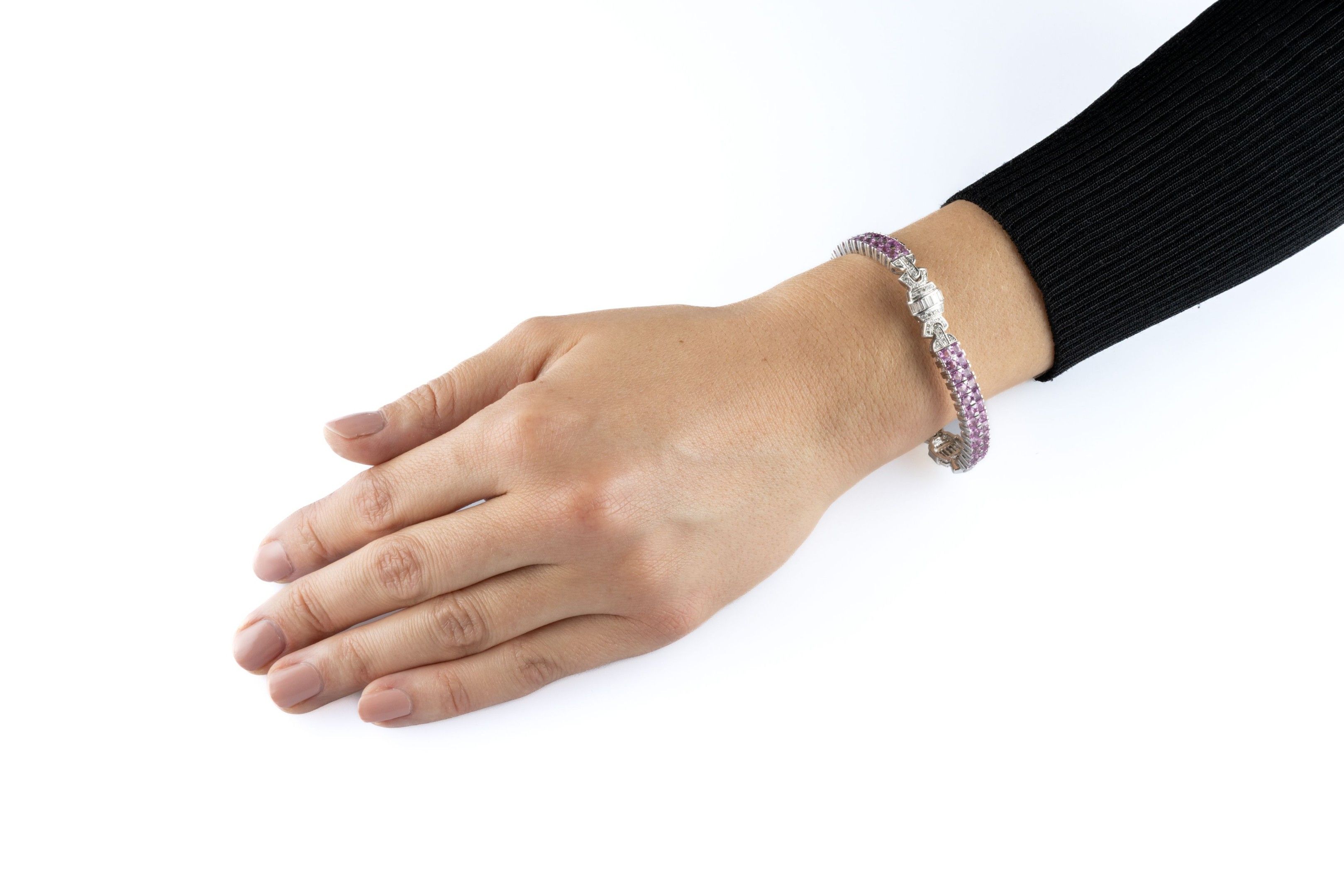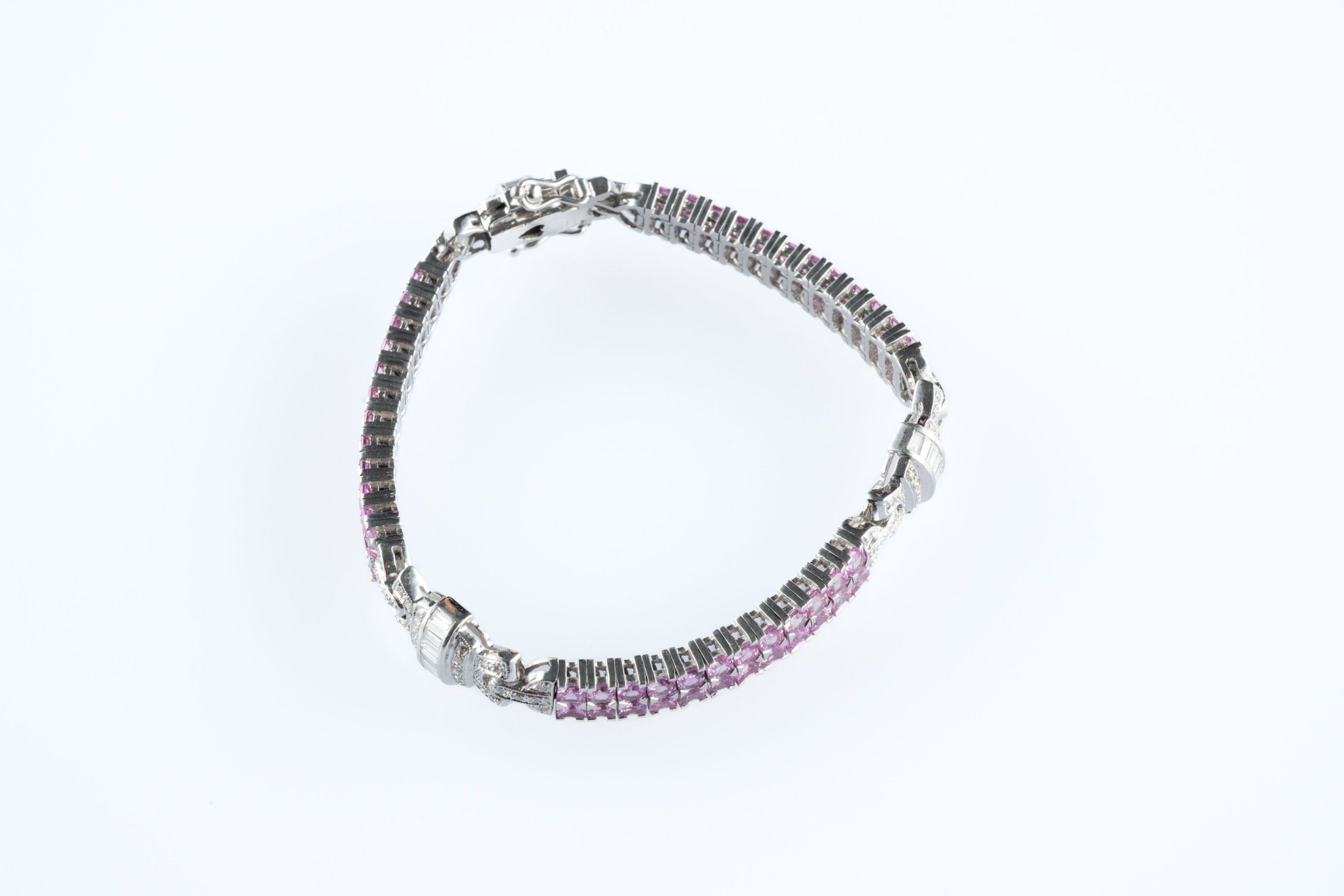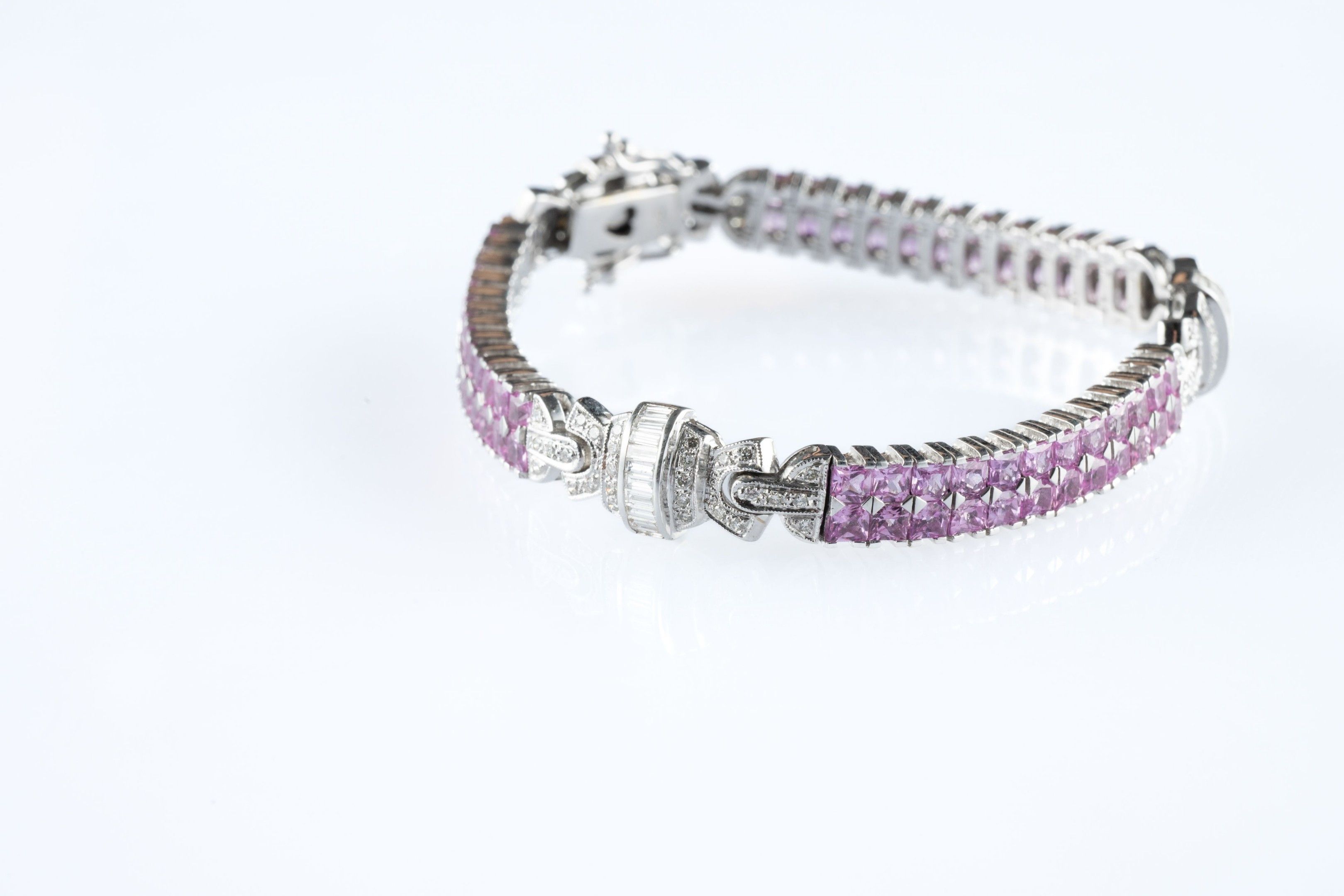 18k (750 thousandths) white gold rivière bracelet with two lines of square pink sapphires separated by Art Deco-style elements of round and baguette diamonds.