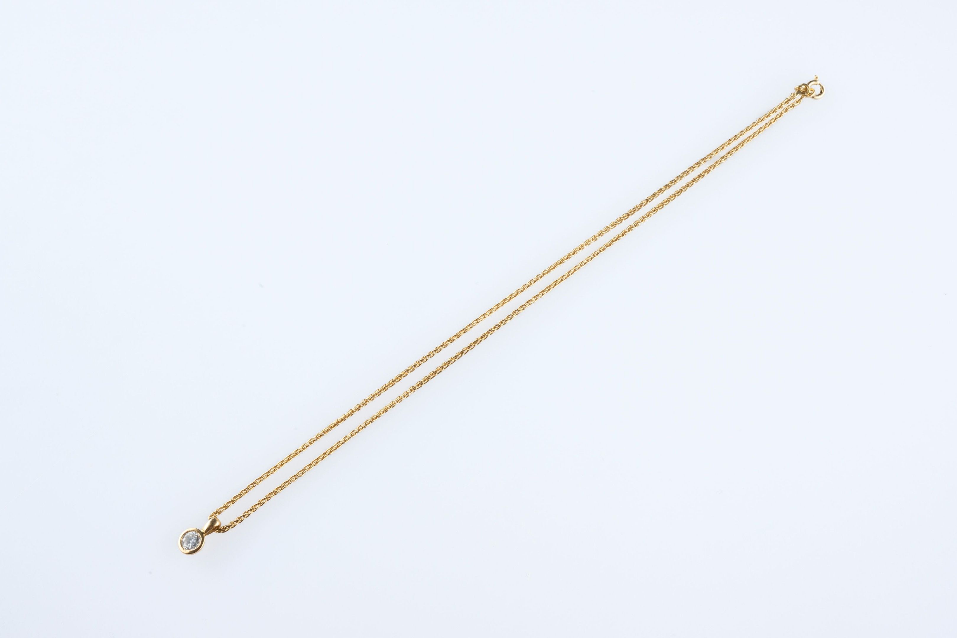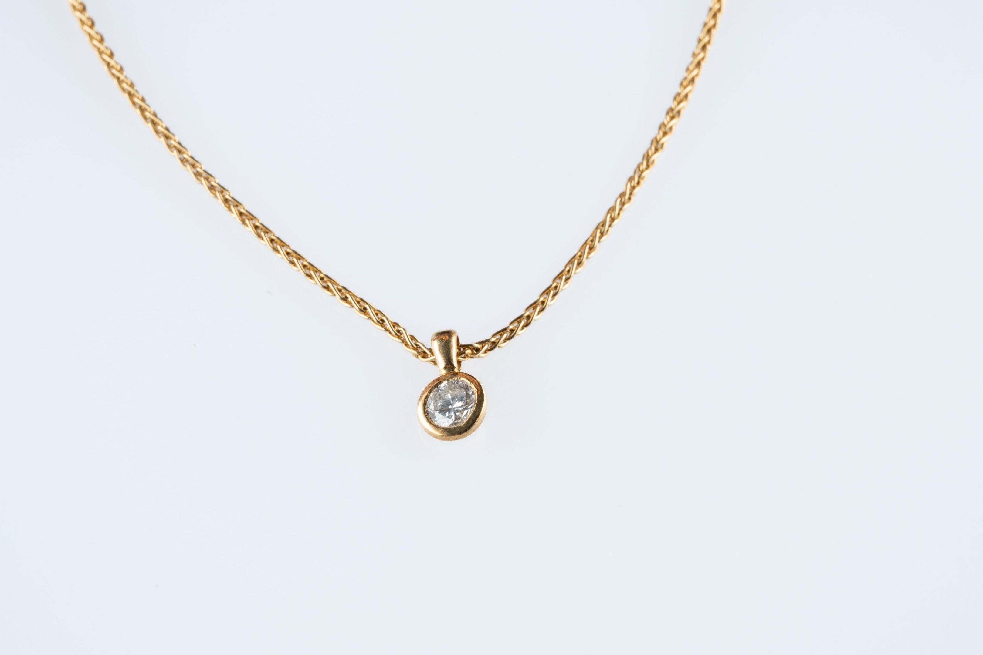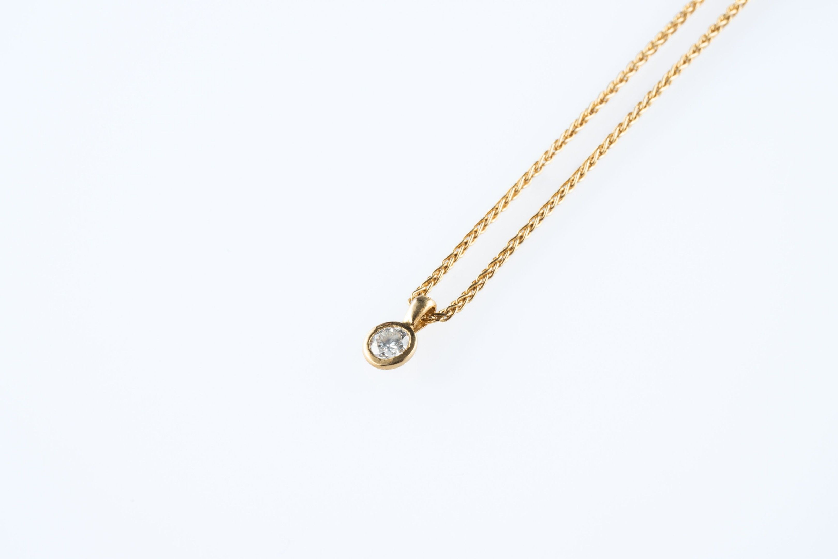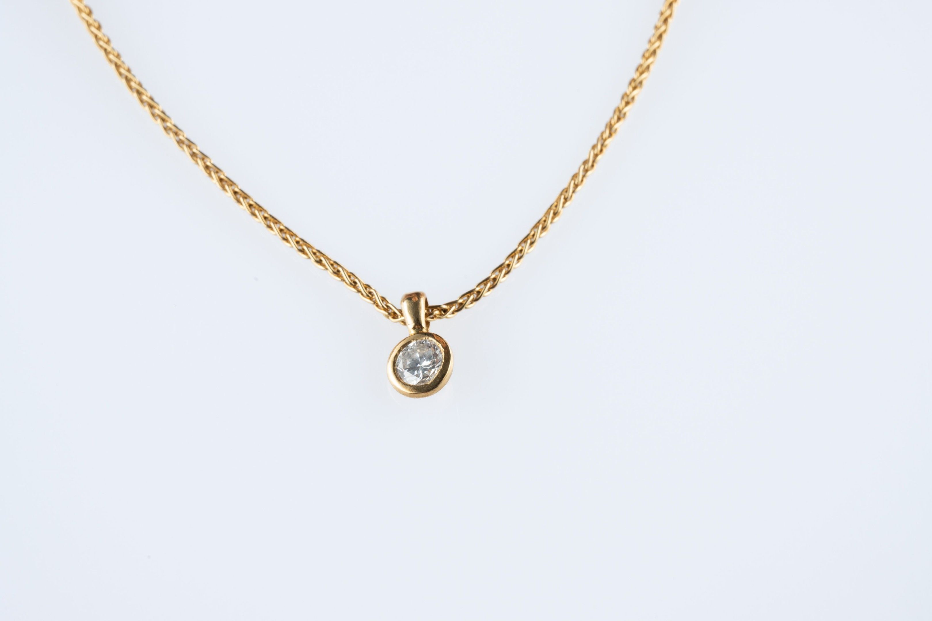 18k (750 thousandths) yellow gold palm chain necklace with a round modern-cut diamond, approx. 0.5 ct, set in a closed setting.