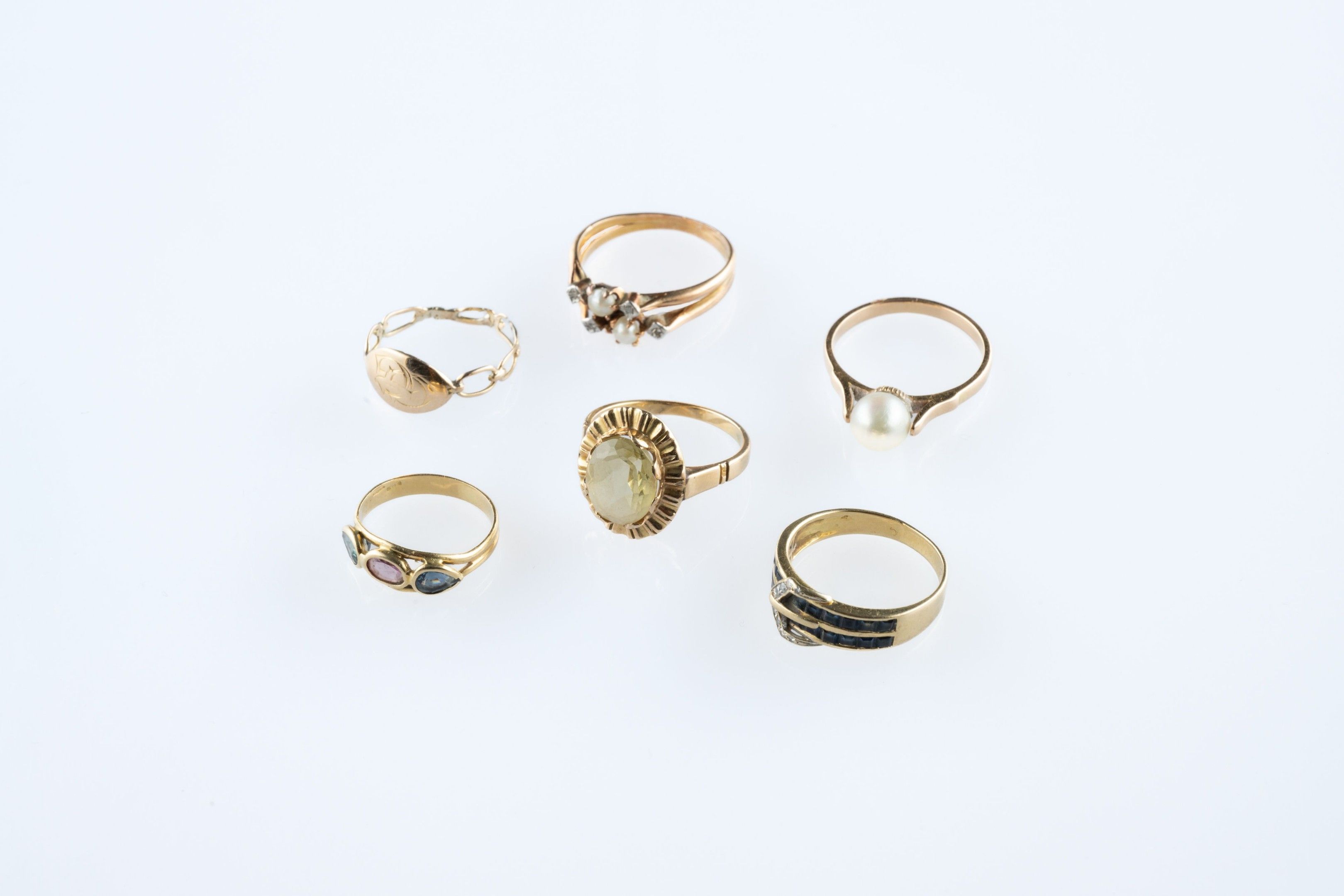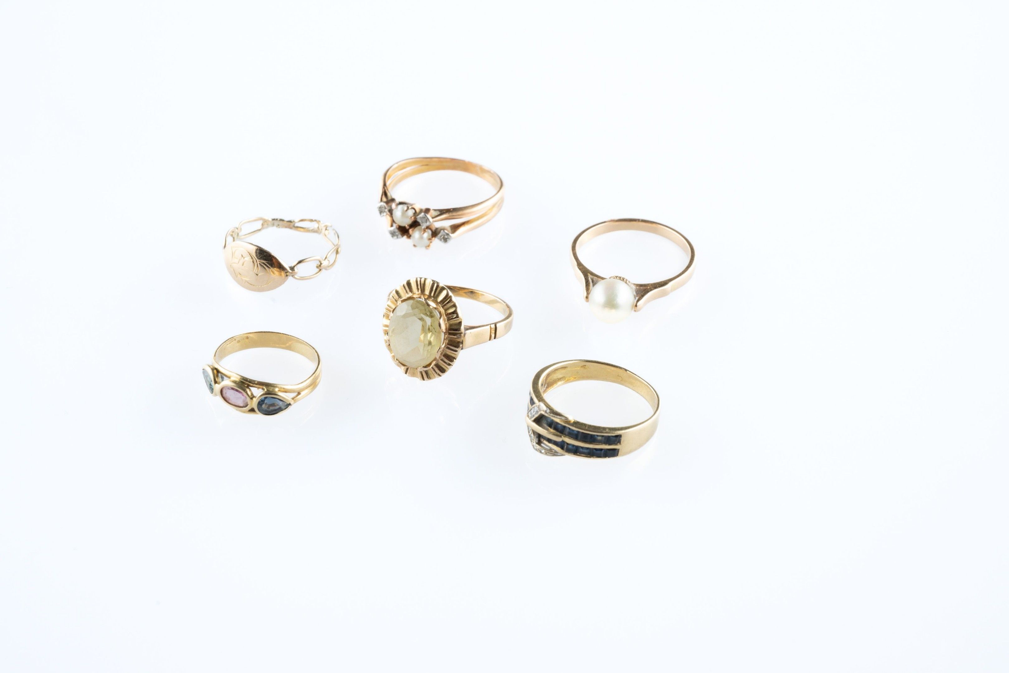 A set of five 18k (750 thousandths) yellow gold rings set with cultured pearls, coloured stones and other stones.
