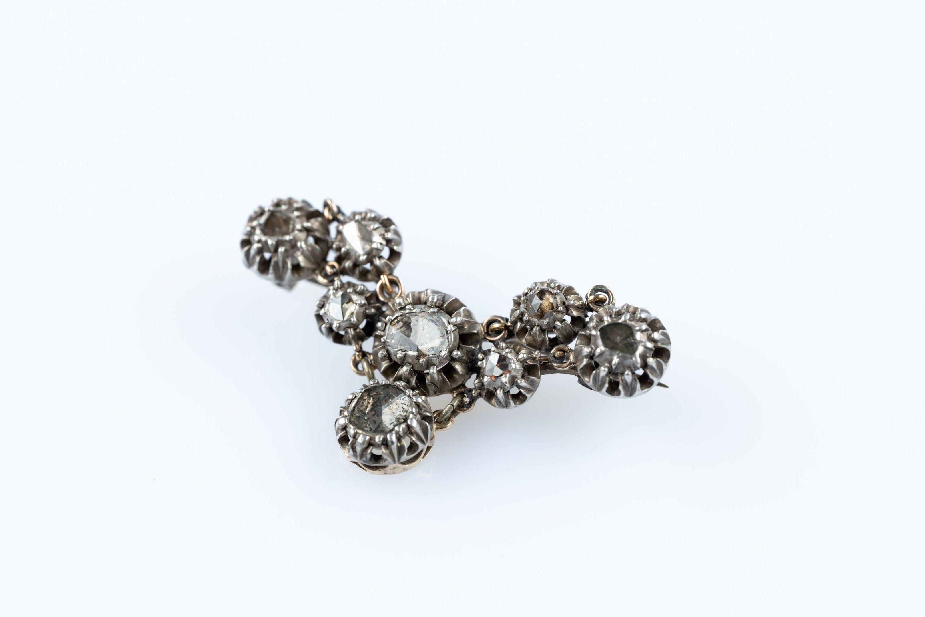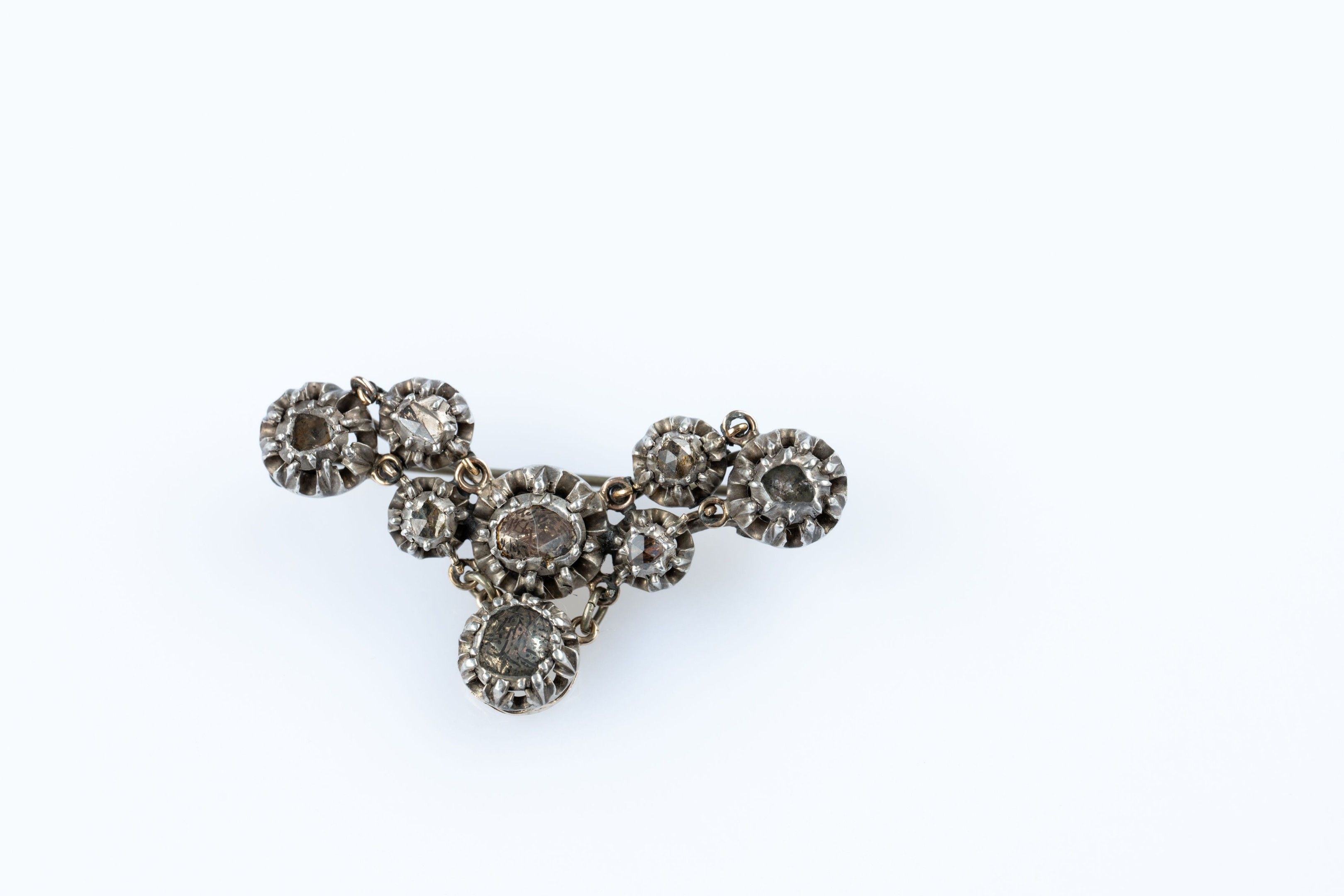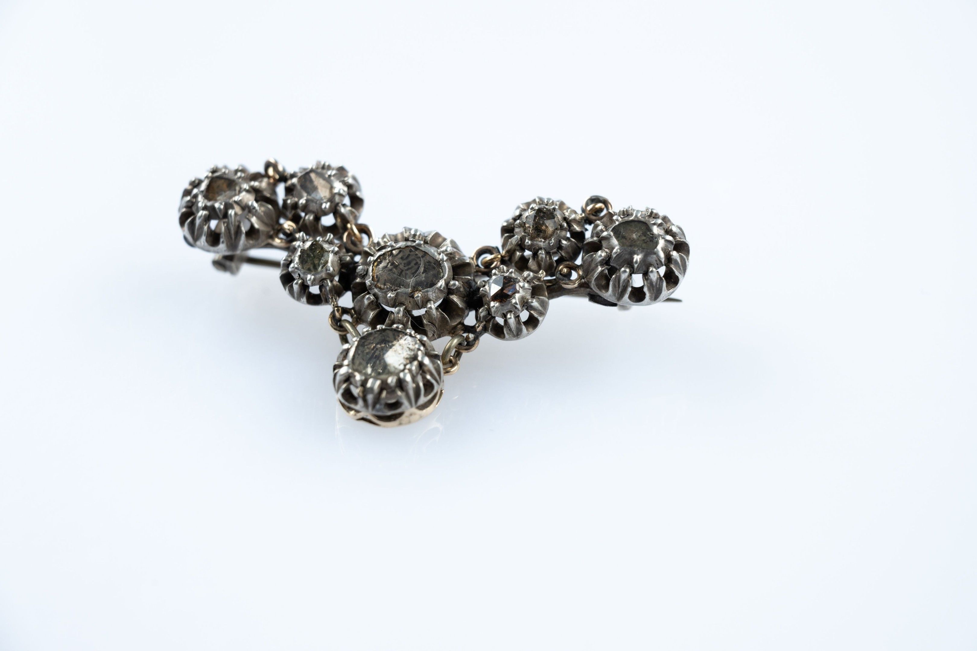 Silver and 18k (750 thousandths) yellow gold brooch set with eight rose-cut diamonds.